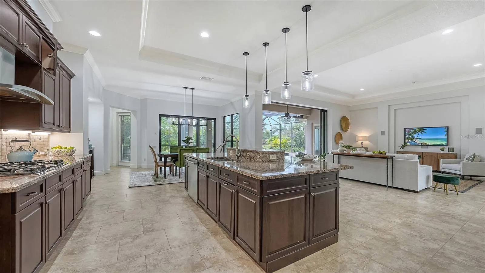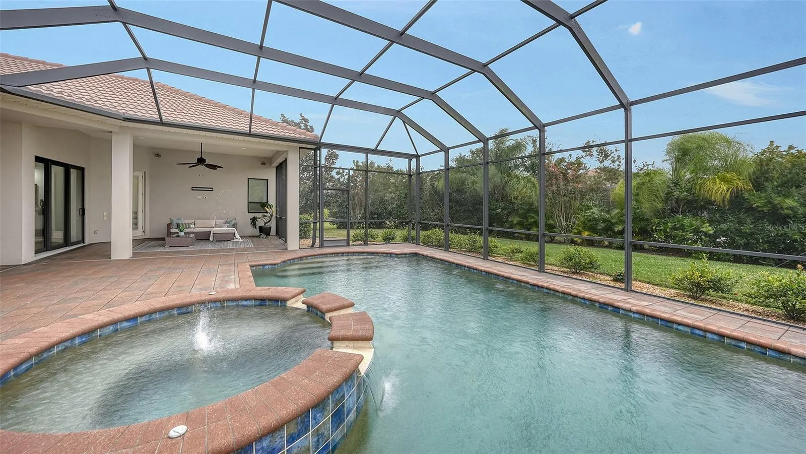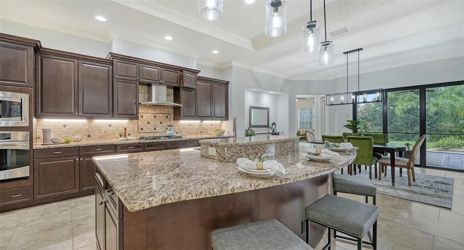 Nestled on an expansive homesite within the Royal Valley neighborhood of Country Club East, this custom Rutenberg home is a testament to sophistication and style. Boasting exceptional curb appeal, the residence showcases custom features and upgrades, including newly installed light fixtures, new carpeting, as well as the CABINETRY THROUGHOUT THE HOME WILL BE FRESHLY PAINTED. The well-designed open floor plan, complemented by a casual dining area, introduces a move-in ready dwelling. With three bedrooms, three full baths, a bonus room, and a spacious office/den adorned with engineered hardwood floors, this home exudes comfort and luxury. Neutral tile floors, fresh paint, and extensive crown molding grace the living areas, creating an inviting atmosphere. The gourmet kitchen, perfect for culinary enthusiasts, features stainless steel appliances, solid wood cabinetry with soft-close drawers, granite countertops, a custom stone backsplash, dry bar with a wine refrigerator, hidden walk-in pantry, and a sizable single-level island with ample seating. The primary retreat is a haven, offering a sitting area with bay windows, tray ceiling, two walk-in closets, private pool access, and a sumptuous bathroom with separate vanities, tiled walk-in shower, and jetted tub. Expansive disappearing sliders seamlessly connect the living and dining areas to the covered lanai adorned with brick pavers, leading to an inviting heated pool and spa. Surrounded by tropical landscaping, this outdoor space creates a serene and private oasis. Additional highlights include laundry room with cabinetry, granite counters, and utility sink, as well as abundant closet/storage spaces, tankless water heater, iconeyne insulation and spacious 3 car side load garage. Country Club East ensures gated-community living, three community pools, a fitness center, and convenient access to world-class shopping, dining, medical facilities, and I-75. Embrace an unparalleled blend of relaxation and recreation in this remarkable home.
