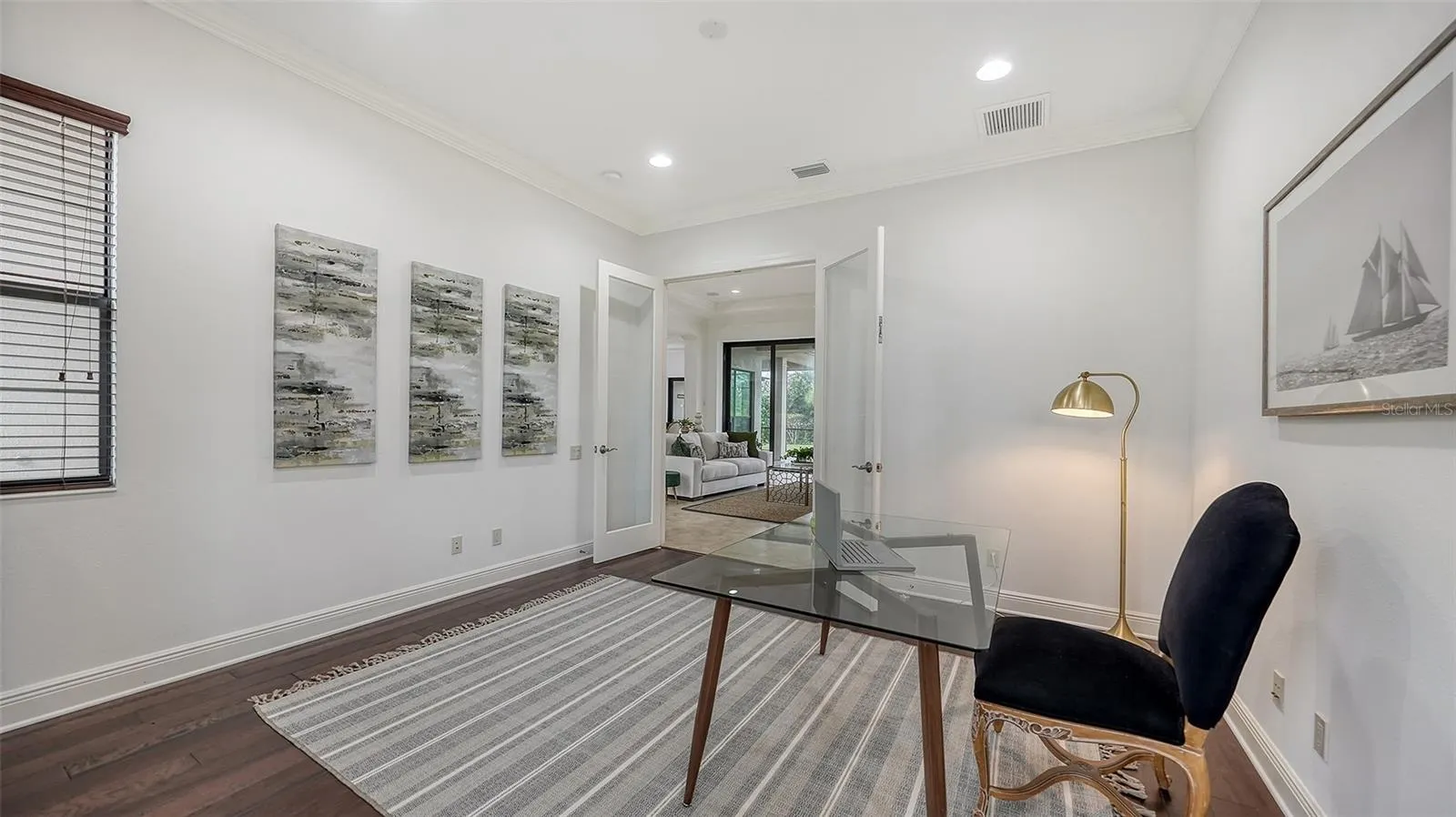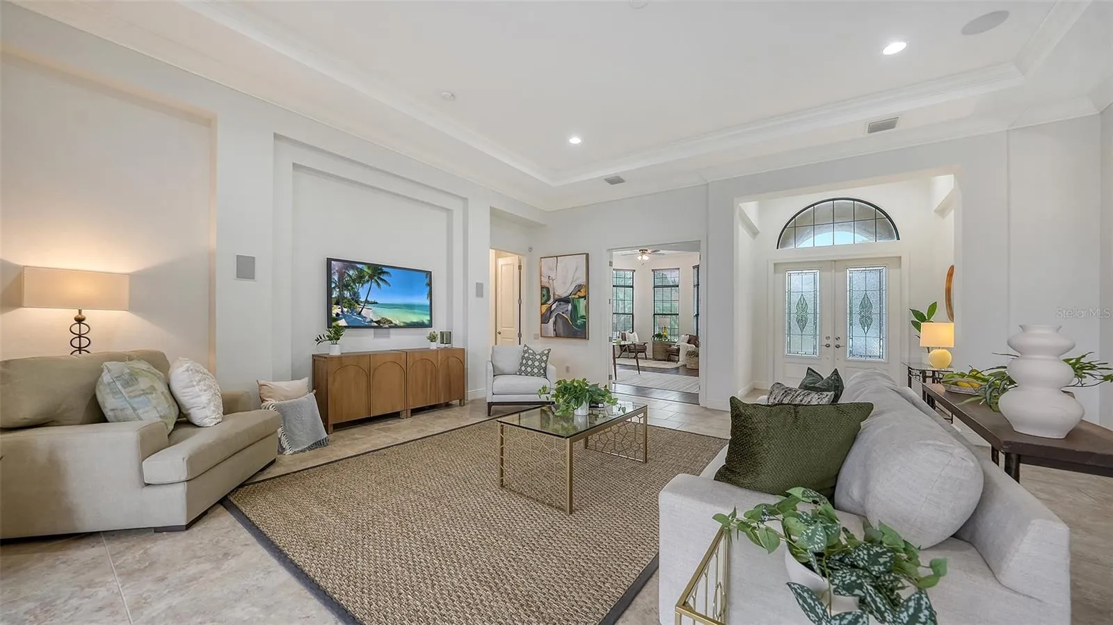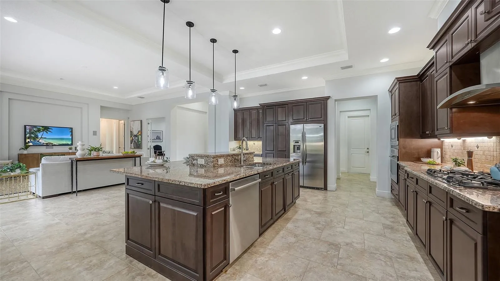 Nestled on an expansive homesite within the Royal Valley neighborhood of Country Club East, this custom Rutenberg home is a testament to sophistication and style. Boasting exceptional curb appeal, the residence showcases custom features and upgrades, including newly installed light fixtures, new carpeting, as well as the CABINETRY THROUGHOUT THE HOME WILL BE FRESHLY PAINTED. The well-designed open floor plan, complemented by a casual dining area, introduces a move-in ready dwelling. With three bedrooms, three full baths, a bonus room, and a spacious office/den adorned with engineered hardwood floors, this home exudes comfort and luxury. Neutral tile floors, fresh paint, and extensive crown molding grace the living areas, creating an inviting atmosphere. The gourmet kitchen, perfect for culinary enthusiasts, features stainless steel appliances, solid wood cabinetry with soft-close drawers, granite countertops, a custom stone backsplash, dry bar with a wine refrigerator, hidden walk-in pantry, and a sizable single-level island with ample seating. The primary retreat is a haven, offering a sitting area with bay windows, tray ceiling, two walk-in closets, private pool access, and a sumptuous bathroom with separate vanities, tiled walk-in shower, and jetted tub. Expansive disappearing sliders seamlessly connect the living and dining areas to the covered lanai adorned with brick pavers, leading to an inviting heated pool and spa. Surrounded by tropical landscaping, this outdoor space creates a serene and private oasis. Additional highlights include laundry room with cabinetry, granite counters, and utility sink, as well as abundant closet/storage spaces, tankless water heater, iconeyne insulation and spacious 3 car side load garage. Country Club East ensures gated-community living, three community pools, a fitness center, and convenient access to world-class shopping, dining, medical facilities, and I-75. Embrace an unparalleled blend of relaxation and recreation in this remarkable home.
