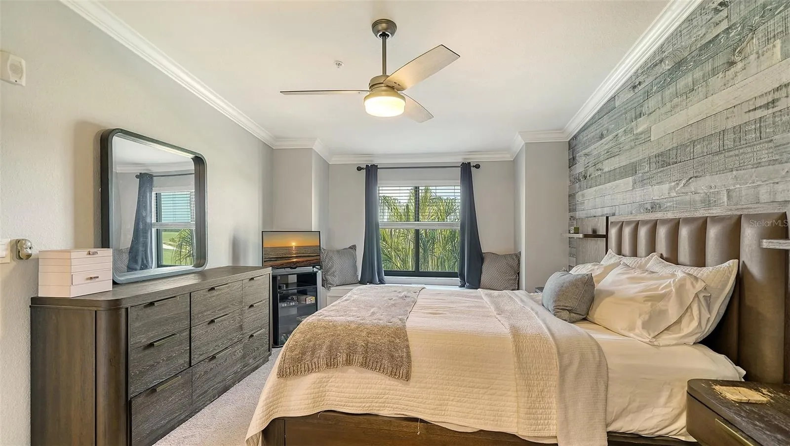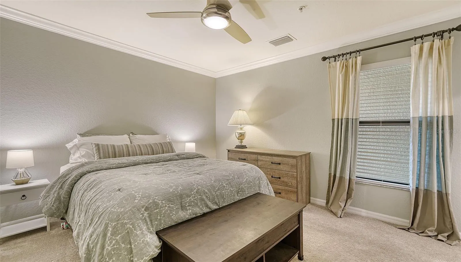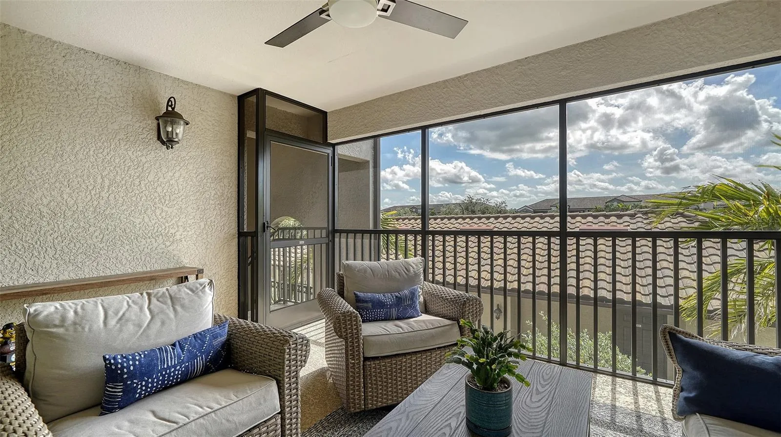Lakewood National offers the total experience of resort style living with two golf courses, fitness center, poolside tiki bar, resort style pool with rock wall feature, restaurant with indoor and outdoor dining, pro shop and more! Enjoy the full-service spa, eight lighted Har-Tru tennis courts, bocce ball, pickleball, six satellite pools, and a full-time lifestyle director. This 2 bedroom, 2 bath second floor unit has two porches and a one car garage! The floorplan is wide open and has a flex room that could be a third bedroom or office! This unit has gorgeous molding detail throughout! Take note of the detail in the dining room and family room. The primary bedroom has built in window bench seating, wood accecnt wall, two walk in closets and beautiful views of the golf course and lake! The primary bath has dual sinks, large walk-in shower, wood cabinets and granite counter tops. Kitchen has stainless appliances, wood cabinets, bar seating, granite counters and large closet pantry! There is ample space for a breakfast table! Secondary bath has wood cabinets, granite counters and tub shower. The laundry is in the unit and conveniently located off the kitchen. This unit has many upgrades and the views are spectacular! Make your offer today!