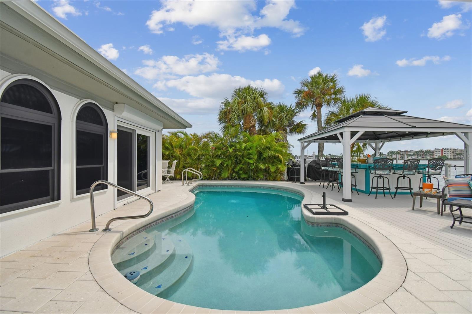 This is the epitome of waterfront luxury living in Pasadena Golf Club Estates, where breathtaking open water views invite you to embrace your tropical dream home oasis. Nestled amidst the swaying mature coconut palm trees on a generous 0.39-acre lot, this property boasts an impressive 85 feet of pure waterfront frontage. The thoughtfully designed front, adorned with glistening seashells, transports you to a private island retreat. Step into this split bedroom floorplan home with elegant tile flooring and plantation shutters throughout that capture captivating water views from every room. The remodeled kitchen boasts white cabinetry with double glass doors, granite countertops, and two serving bars. Stainless steel appliances, including a natural gas stove and wine cooler, elevate the space. The oversized owners retreat features a renovated en-suite bathroom with dual sinks and exquisite tilework. French doors lead to the backyard paradise, perfect watching the sunrise over Boca Ciega Bay. Two generously sized bedrooms accommodate queen-sized beds and offer privacy, with a guest bathroom that has been thoughtfully renovated nearby. The inside laundry room boasts new cabinets, washer and dryer. For your comfort and convenience, a new water softener and a tankless gas water heater have been installed. The show-stopping backyard fulfills your waterfront dreams, featuring the largest dock in Pasadena Golf Club Estates, with not one, but two boat lifts (16,000-pound and 10,000-pound), AND a kayak lift. Boating enthusiasts will revel in the ease of accessing the Intracoastal waterways, Tampa Bay, and the Gulf of Mexico. Picture yourself casting a line from your very own dock, marveling at the view of the iconic Don Cesar or catching a glimpse of dolphins frolicking in the water as manatees serenely glide by. Your backyard oasis beckons featuring a stunning freeform pool enveloped by shellock pavers enhanced by multicolored lighting. Thanks to solar and natural gas heating, swimming becomes a year-round option, while an outdoor shower provides a refreshing cleanse after a day of poolside relaxation. This truly is an entertainer’s paradise, with a covered 12×14 gazebo tiki bar comfortably seating 10 guests, complemented by a grilling area complete with a sink. Adjacent to the pool, a covered patio with electric roll-down shutters offers 95% sun coverage, ensuring a cool and inviting space to unwind, rain or shine! In terms of security and durability, this concrete block home boasts a concrete tile roof and hurricane-rated windows coupled with roll-down hurricane shutters and hurricane stainless steel security screens that adorn every window. Rest assured, this property has recently completed and passed a thorough 4-point inspection, reaffirming its safety. Pasadena Golf Club Estates is a proactive homeowners association that comes with just a voluntary $25 annual contribution. The home’s enviable location places you a mere 10 minutes from St. Pete Beach and the vibrant Gulfport waterfront arts community. Within 15-minutes, you’ll find the bustling Downtown St. Pete, offering an abundance of dining, shopping, and entertainment options. It’s time to embrace your best life in paradise! Be sure to check out the full tour!