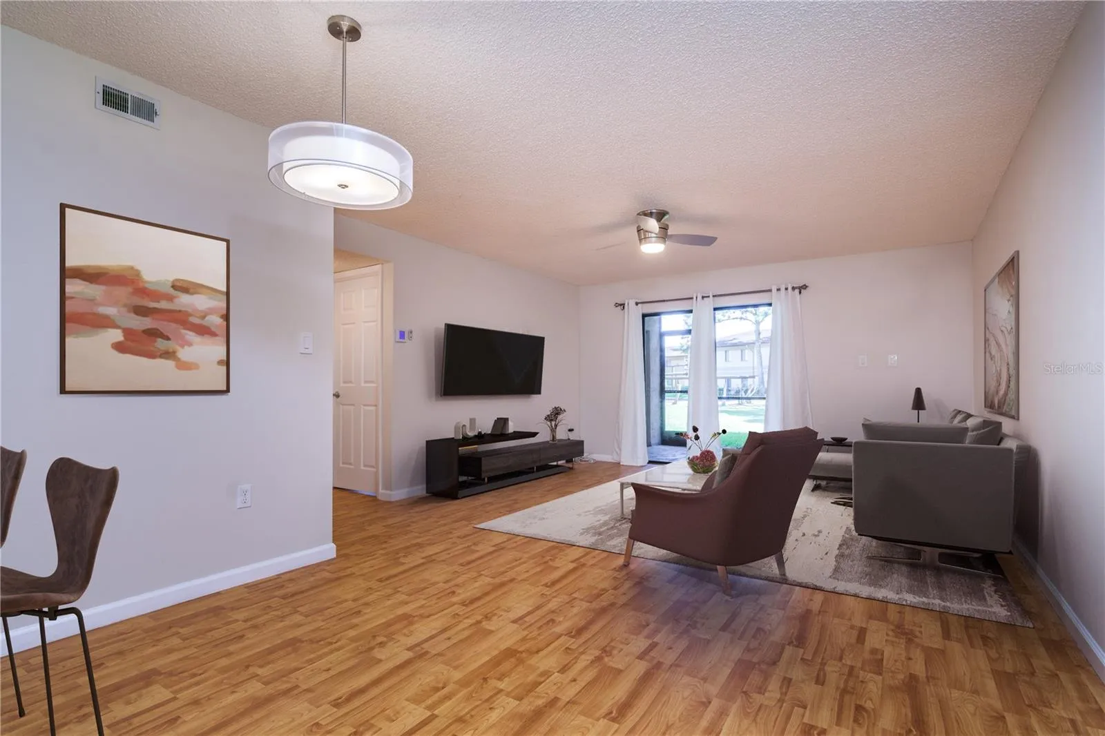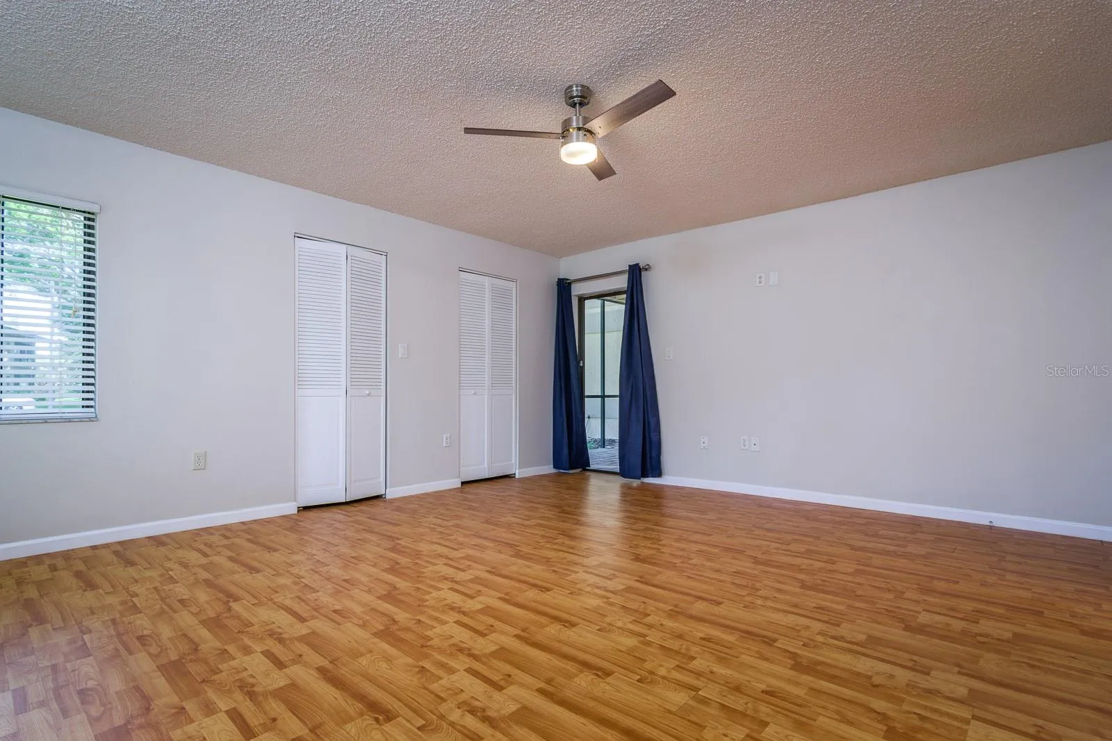 - Ceiling Fans(s), Thermostat, Living Room/Dining Room Combo, Eat-in Kitchen, Primary Bedroom Main Floor, Split Bedroom, Window Treatments, Stone Counters, Solid Wood Cabinets, Solid Surface Counters