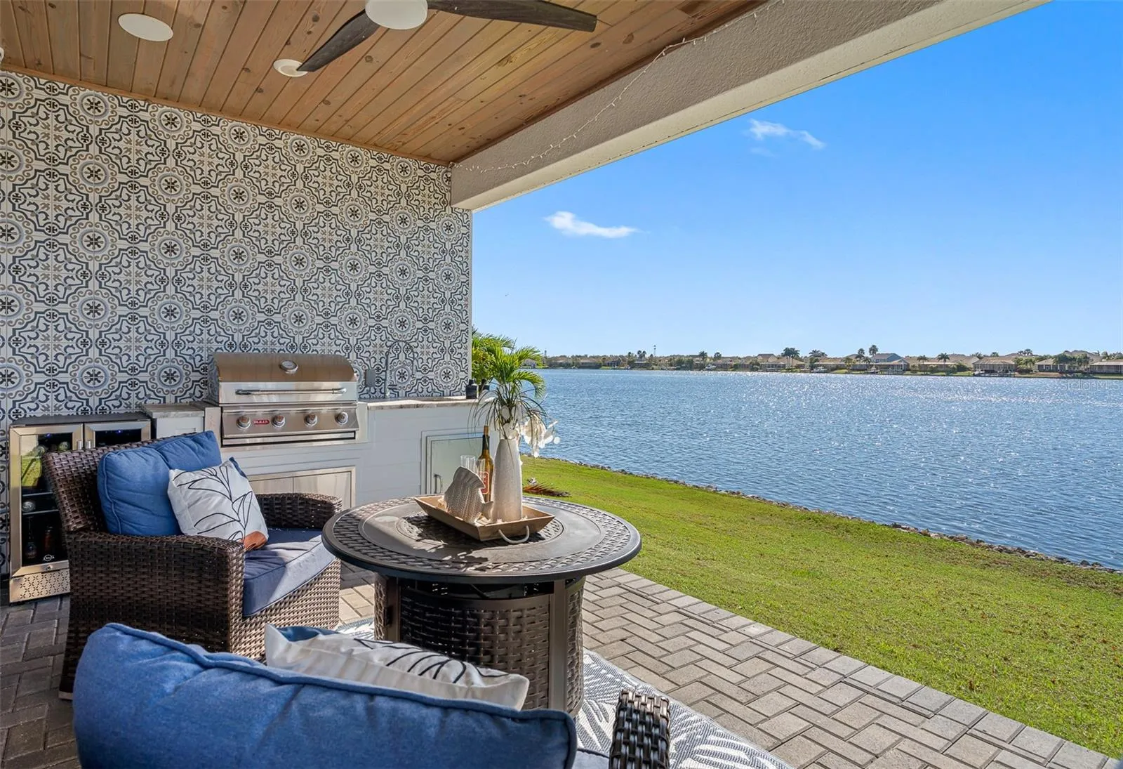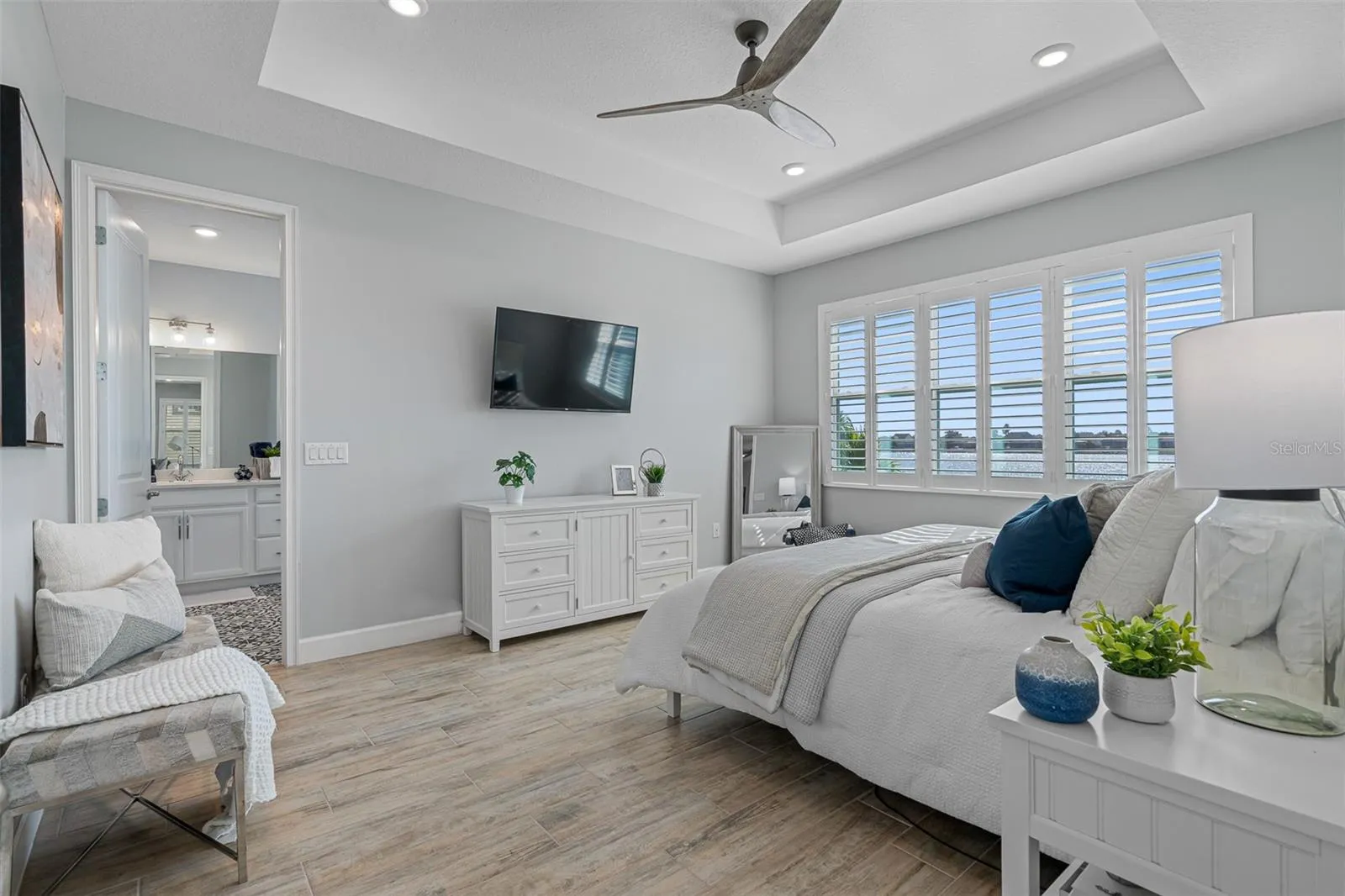 Welcome to Mira Bay’s Luxury Waterfront home! This stunning residence boasts 4 bedrooms and 3 baths, situated on a waterfront property that offers a truly breathtaking view as you enter the home. Immediately upon entering is the gourmet cook’s dream kitchen featuring a sizable island with a breakfast bar seating eight, and beautiful stately 42” cabinets, quartz countertops complemented by a white subway tile backsplash. The kitchen is equipped with top-of-the-line stainless steel appliances, including a gas cooktop with professional style “pot filler” at the stove, plus hood and double oven. The space outside the kitchen makes a great gathering spot for additional dining or casual sitting. The elegance of this home extends throughout, with tile floors seamlessly adorning every space. Plantation shutters grace each window, providing a touch of sophistication. The master bedroom is a sanctuary with a walk-in closet featuring built-ins, a tray ceiling, and a stunning water view. The master bath provides a place for tranquility and quiet, a very spa-like retreat, showcasing quartz dual sinks, a massive shower, and beautiful black and white tile floors. Attention to detail is evident with the many upgrades. The wood-look tile creates a light and bright atmosphere, while the bathrooms showcase designer-style tiles. The front room can easily be a formal dining room or a great office/den for working at home. The bedrooms are generously sized, with the first guest bedroom and bath situated in its own hall for added privacy—a perfect in-law suite option. The bath is complete with walk-in shower and single sink vanity. The secondary guest bedrooms are in their own area sharing bathroom with tub/shower and double sink vanity, great place for the kids! Inside the home, the focal point is the exceptional water view, visible from various vantage points. Step outside onto the covered pavered porch to enjoy the superb location for both sunrise and sunset views. The outdoor kitchen, accented with coordinating tile and a wood ceiling, is perfectly planned for entertainment. The composite dock ensures splinter-free enjoyment for years to come with space for a boat lift. The spacious backyard allows room for a pool. Additional features include surround sound throughout the house, hurricane shutters, and a tankless water heater. MiraBay, a spectacular master-planned community, provides resort-style living and amenities such as multiple pools, waterslide, clubhouse, tennis courts, fitness center and community docking. The area continues to grow with the addition of new restaurants, wine bars, coffee shops, medical facilities, Publix and much more. Easy access to I-75 providing easy access to I-4 and the Orlando Disney area, downtown Tampa, and all it has to offer, all the major sports venues, plus the Sarasota and Siesta Key beaches and shopping. There is no better place to live! The chandelier in the office does not convey. Owner will be replacing the light with a fan.