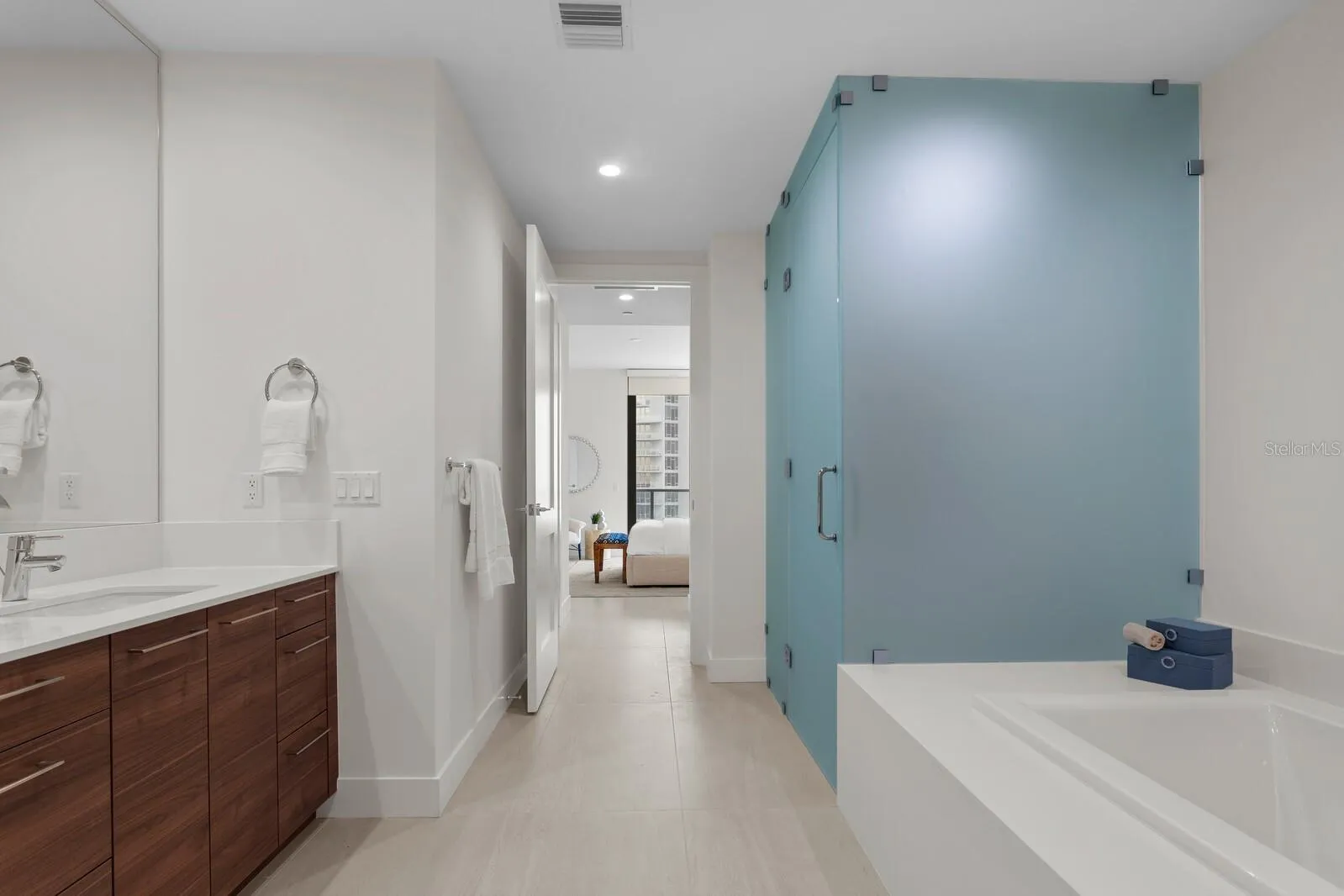 TWO COVERED BALCONIES beckon, extending your living space to the outdoors, where you can immerse yourself in the splendor of the waterfront from multiple vantage points. The owner’s suite, a sanctuary of serenity, captivates with its water vistas, private balcony, and dual walk-in closets. Luxuriate in the owner’s bath, a haven of relaxation featuring lavish vanities, a sumptuous soaking tub, and a spacious walk-in shower.