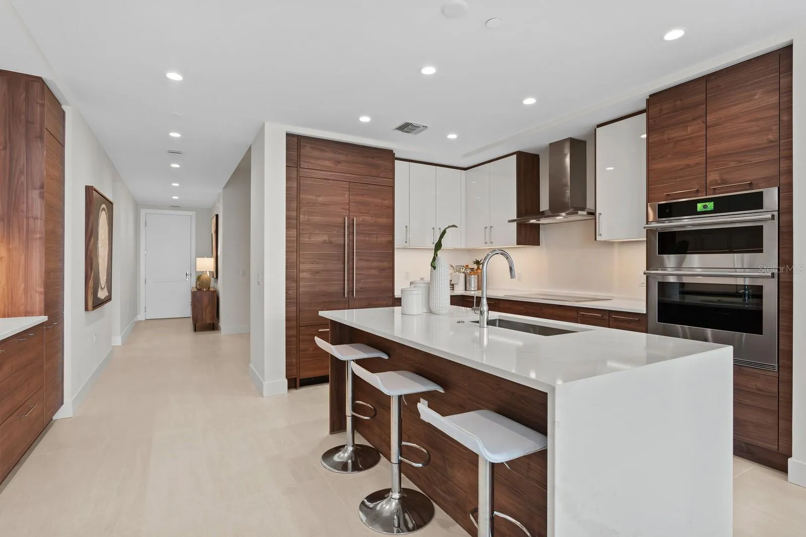 Enter a realm of refined elegance as natural light floods the grand great room through floor-to-ceiling sliders, unveiling the mesmerizing allure of St. Petersburg’s waterfront. The gourmet kitchen stands as a testament to culinary indulgence, adorned with top-of-the-line appliances, exquisite cabinetry, and quartz surfaces, all centered around a welcoming breakfast bar.