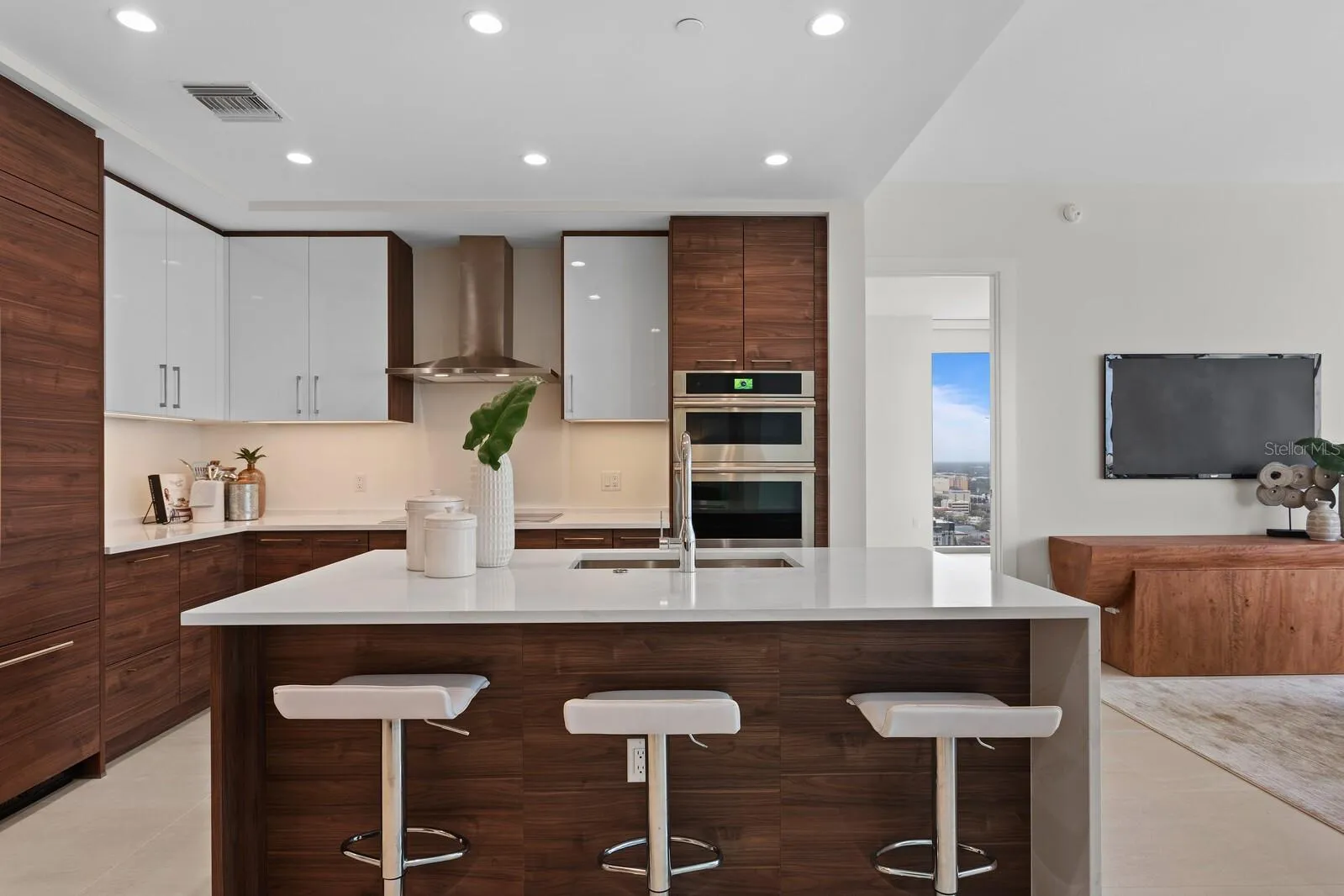 The second bedroom suite offers its own retreat, with city views, a walk-in closet, and a private balcony, while the third bedroom serves as an ideal den or office space. Roller shades have already been installed for your convenience, while the exceptional laundry room boasts quartz counters and custom cabinetry.