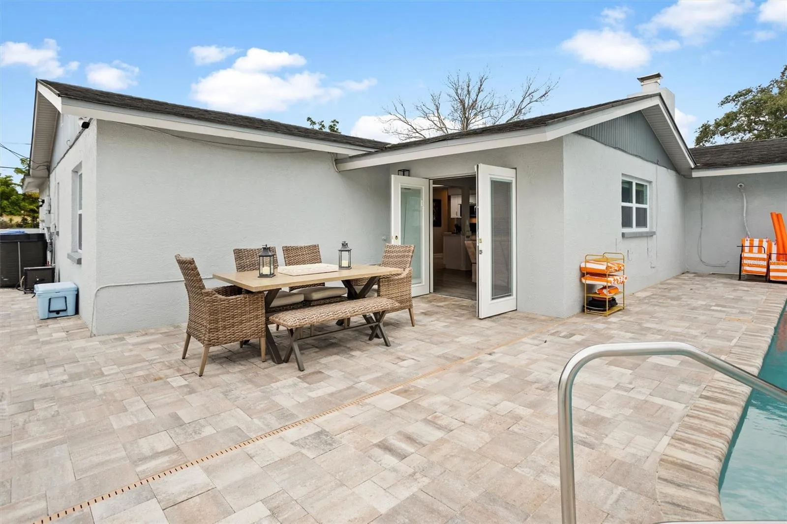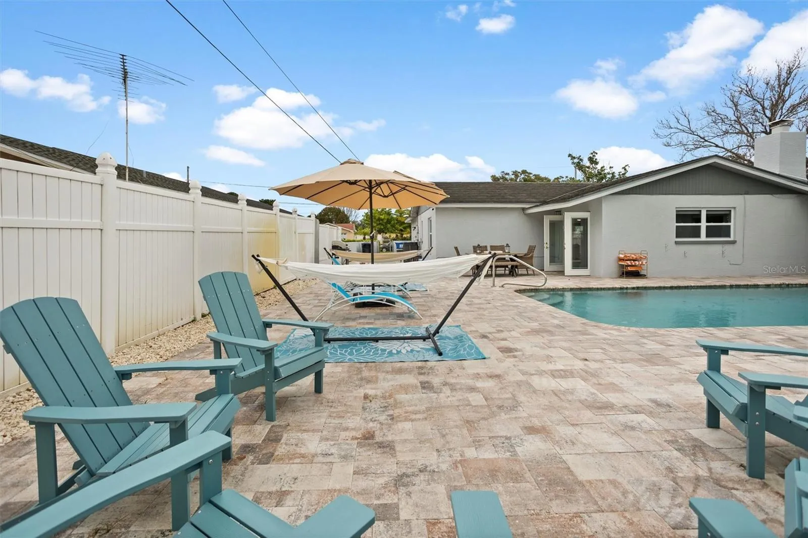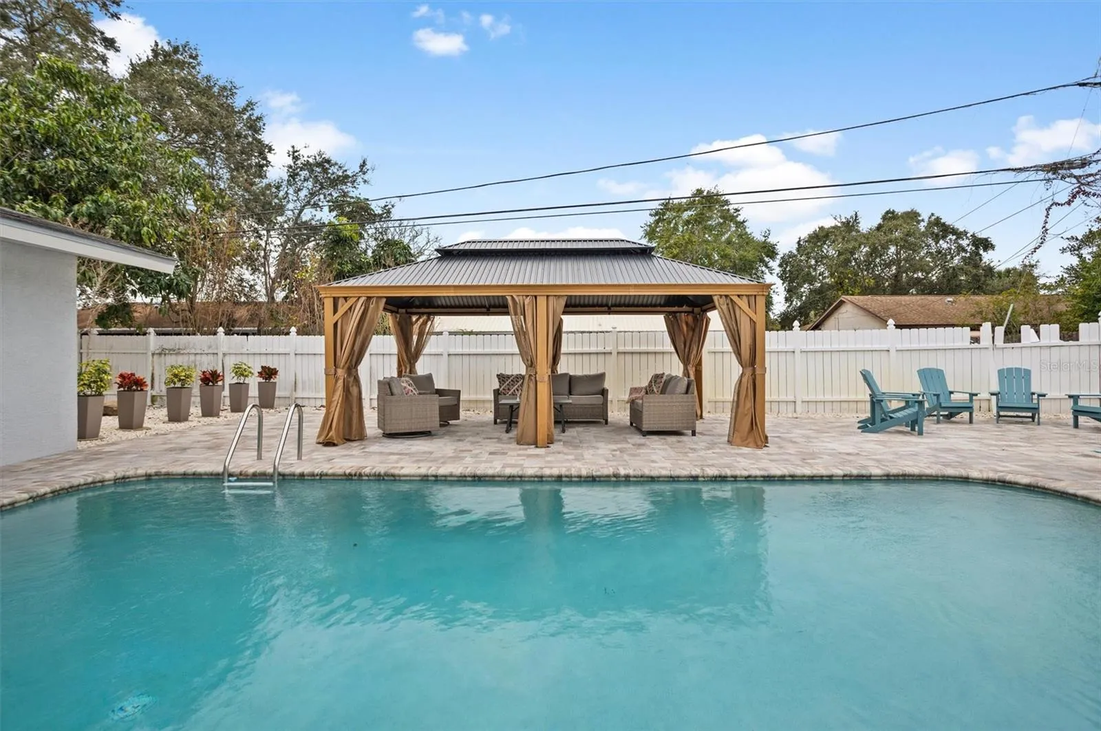 tiling and coping, surrounded by 2,100 sq/ft of brand-new pavers, a double-sized pergola for