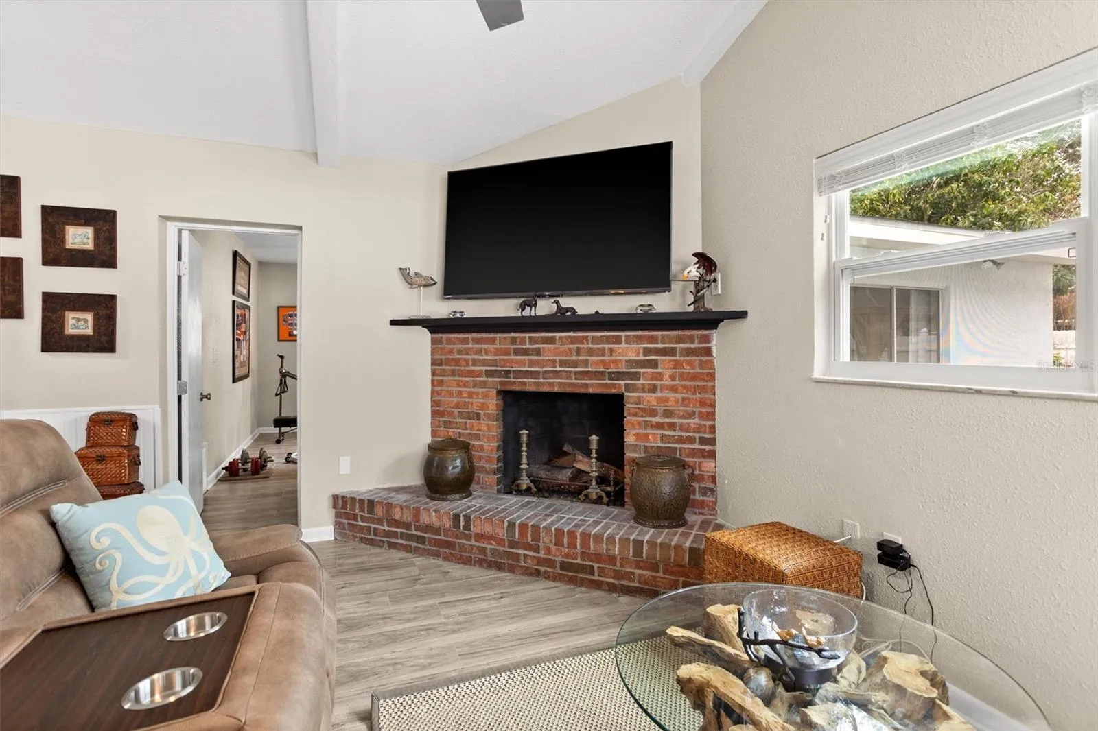 impeccable main living area in the back of the house, complete with a wood-burning fireplace,