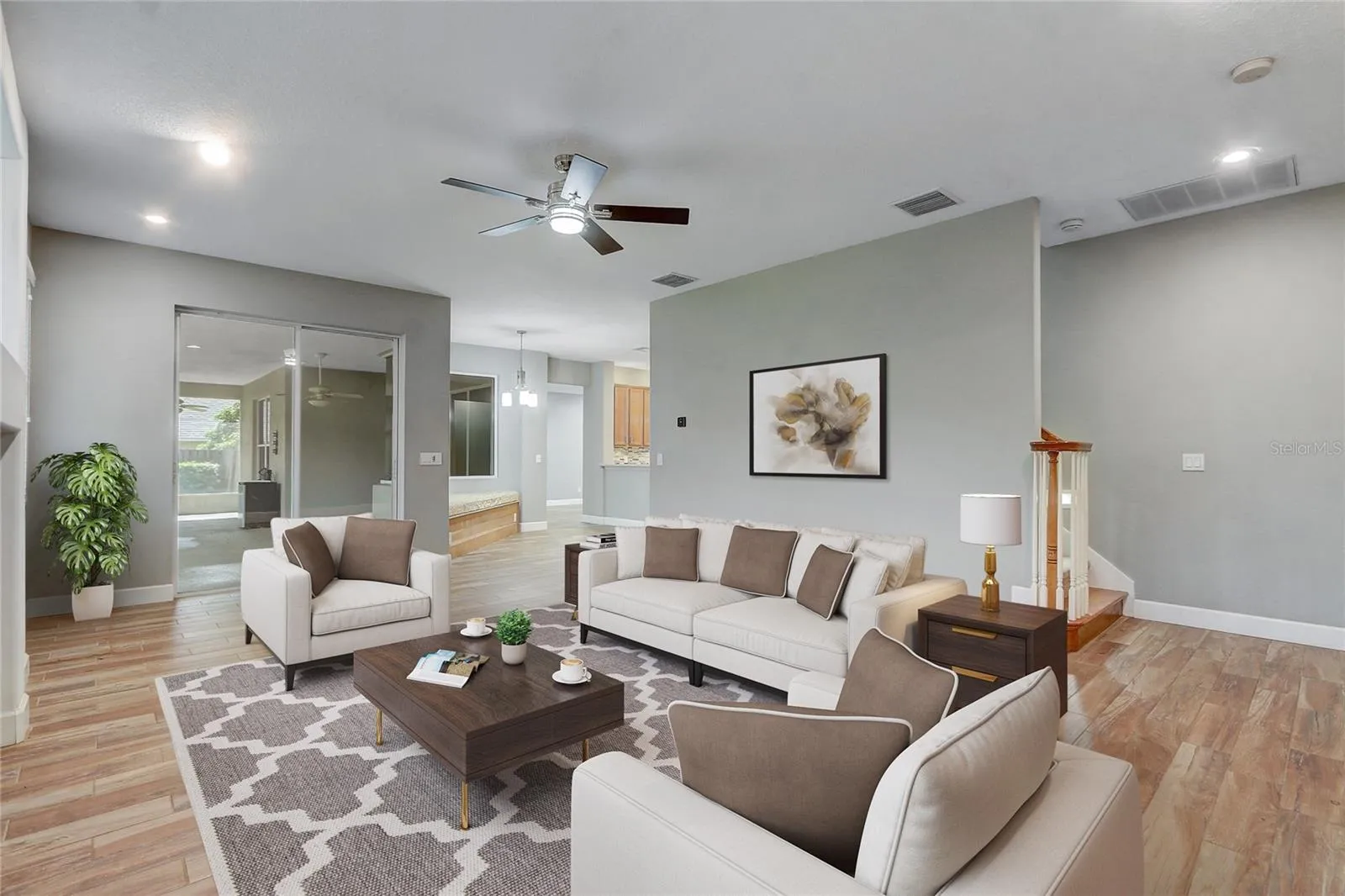 Step into luxury with this stunning residence situated in the Gated community of Lake Weeks Boasting 5 bedrooms and 3 full bathrooms across over 3400 sq ft of living space, this home offers an unparalleled level of comfort and style. The main level welcomes you with the primary bedroom and bath featuring 2 massive walk-in closets, dressing room and jetted tub. There are also 3 additional bedrooms and another full bathroom on the main level, providing ample accommodation for family and guests. Entertain with ease in the formal dining room, living room, and expansive family room, all thoughtfully designed for both relaxation and socializing. Prepare meals in the remarkable eat-in kitchen, featuring a gas stove, dual sinks, and a stylish glass backsplash. Enjoy panoramic views of the meticulously landscaped yard through seamless windows, adding a touch of serenity to your culinary experience. Venture upstairs to discover another large family room, a spacious bedroom, and yet another full bathroom, offering flexibility and convenience for your lifestyle needs. Experience the ultimate in modern living with updated wood-look tile floors throughout the main living area. Additional highlights include a large screened in lanai, laundry room with sink and cabinets, crown molding, 3-car garage, tankless hot water heater for efficiency, a 2020 ROOF for peace of mind, and solar panels, to be fully paid for at closing by seller, providing sustainable energy solutions. Recent 4-point inspection available by request. Don’t miss this opportunity to own a piece of paradise in Lake Weeks. Schedule your showing today and make this dream home yours!