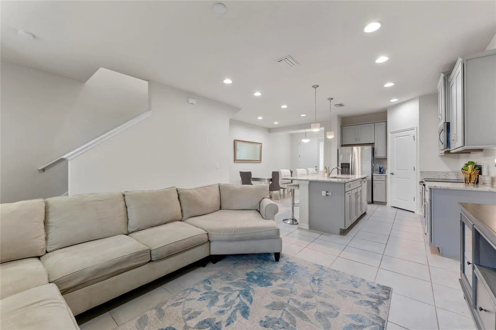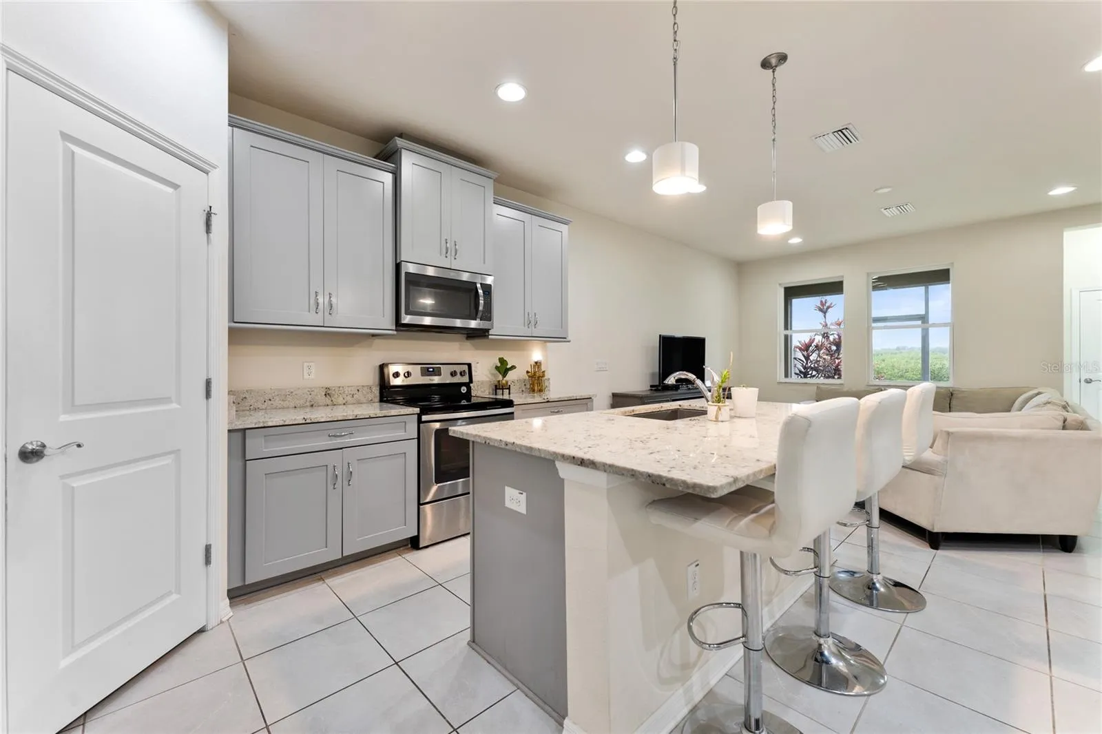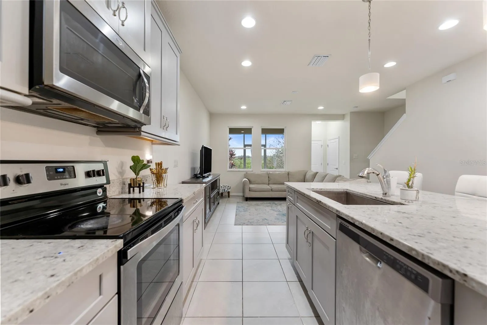 - Ceiling Fans(s), Open Floorplan, Thermostat, Walk-In Closet(s), Living Room/Dining Room Combo, Eat-in Kitchen, Kitchen/Family Room Combo, High Ceilings, Stone Counters, Solid Wood Cabinets, PrimaryBedroom Upstairs