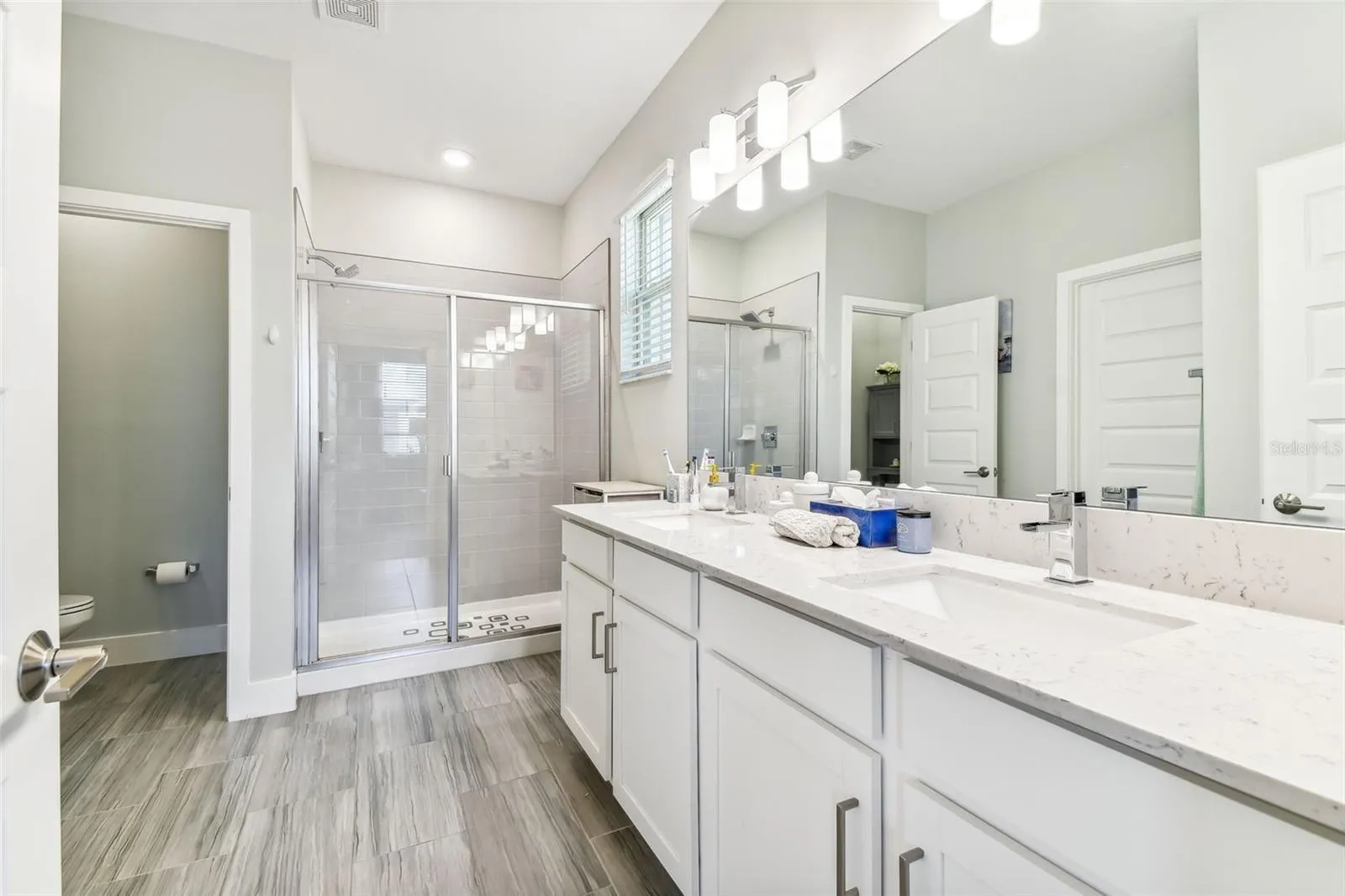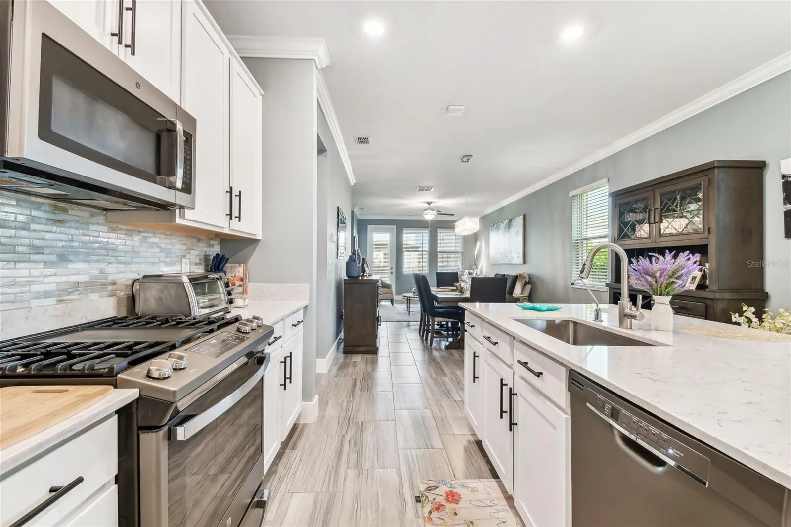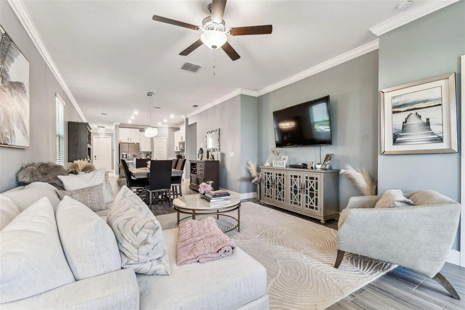 MOTIVATED SELLER, BRING ALL OFFERS! Here’s your opportunity to own a practically brand new home in the coveted Bexley community of Land O Lakes! Built in 2021, this 3 bedroom, 2 bathroom residence features modern coastal chic elements with beautiful wood look tile flooring, fresh paint, high ceilings, crown molding, decorative lighting and an open floor plan. A convenient mudroom as you enter from the garage and a long entrance hallway lead to the home’s gorgeous kitchen with a large center island, bar top seating, white shaker cabinets, quartz countertops, a new decorative high-gloss tile backsplash, stainless steel appliances, gas powered range and a walk-in pantry closet. Continuing on past the kitchen is an open dining area with a decorative chandelier, and a neighboring living room that provides access to the screen enclosed rear lanai and fenced backyard. Highlights of the primary bedroom include carpet flooring, crown molding, a walk-in closet and a huge ensuite bathroom with a private toilet room, large white shaker dual sink vanity and large standalone shower. This home is located in the Bexley community that offers residents and their guests 2 resort-style pools, a fitness center, open-air game room, multiple playgrounds, 7 unique parks, a dog park, and miles of multi-surface walking, jogging and biking trails with fitness stations throughout. The Hub at Bexley includes shopping and dining options, coworking spaces, gyms, an escape room coming soon and healthcare services. They thought of everything when they built this home and the lovely community it resides in. Property taxes include CDD. Don’t wait, come see it today!