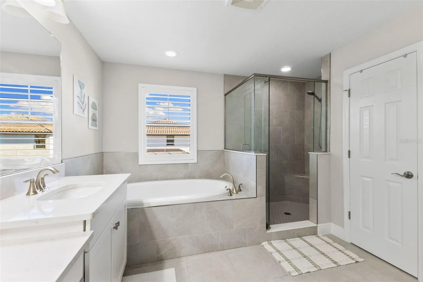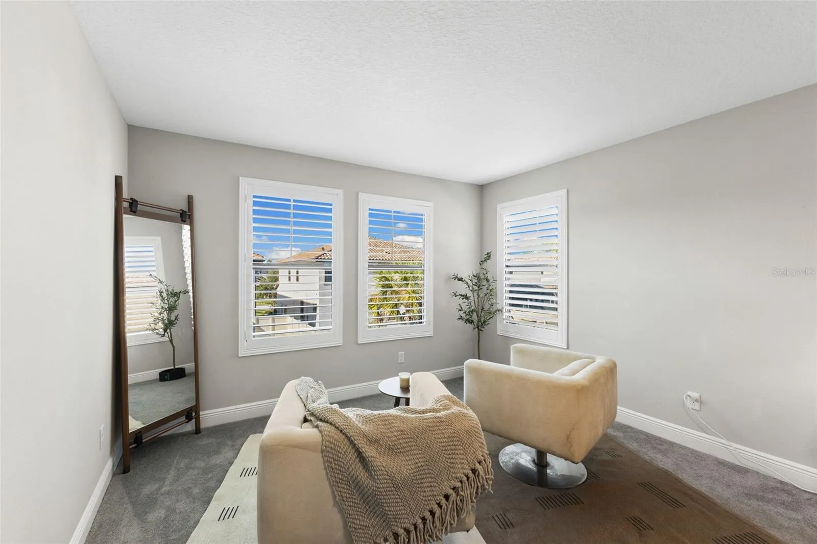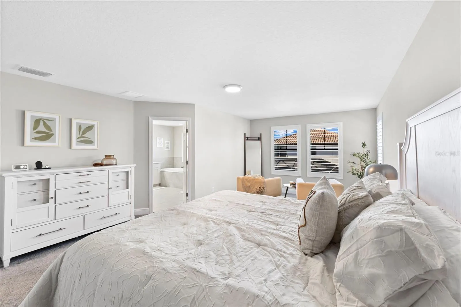 The master suite is a haven of relaxation with a designated sitting area perfect for reading or winding down. The master ensuite features a dual sink vanity with quartz countertops, a garden tub, stand-up shower with a glass door, a walk-in closet, and a separate water closet.