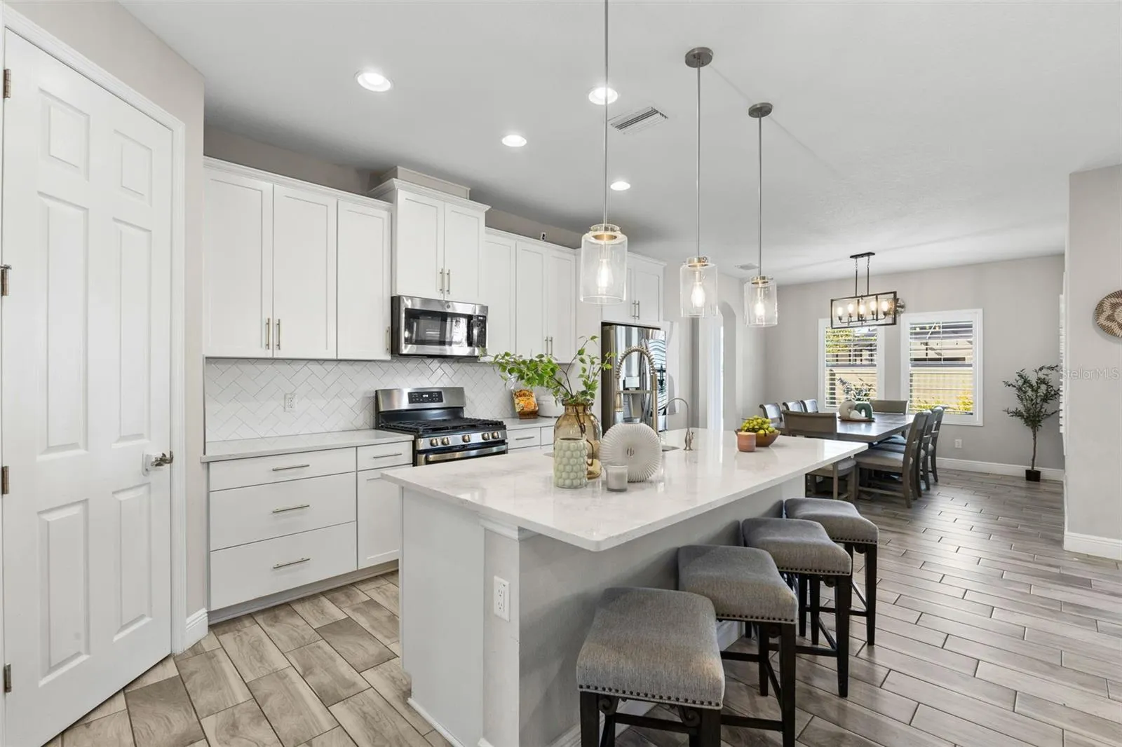 Indulge in the epitome of luxury living with this stunning WestBay Home, the Avocet II model, situated in the coveted Starkey Ranch neighborhood. The covered arched entryway and beautiful glass-inlay front door are the perfect invitation to what this home has in store. As you enter the home you will discover a meticulously designed interior showcasing a seamless blend of sophistication and comfort. Offering 5 Bedrooms, 3 Baths, and an expansive upstairs Loft. A separate den/office and a formal dining room add to the functional layout while still providing an open concept. The heart of this home lies in the impeccable kitchen, featuring an Oversized Island, Quartz Countertops, Subway Tile Backsplash, Stainless Steel Appliances, Gas Range, 42-inch Cabinets with Crown Molding, and a Large Pantry. Additionally, the first floor boasts a convenient full-size bedroom and bathroom, perfect for accommodating guests. The second floor hosts the master suite, additional bedrooms, and a strategically placed laundry room with built-in sink.