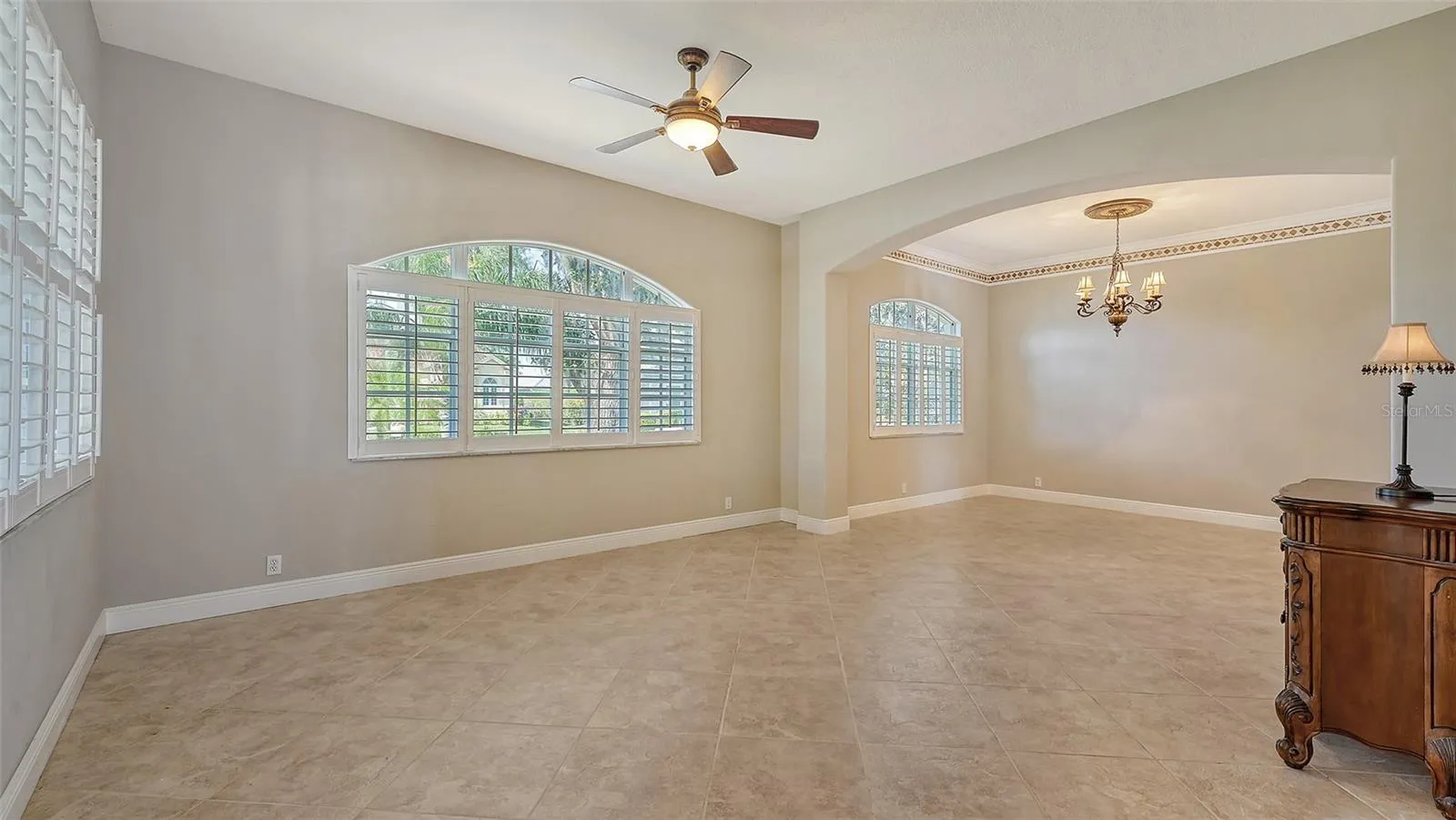 - Ceiling Fans(s), Crown Molding, Thermostat, Walk-In Closet(s), Living Room/Dining Room Combo, Kitchen/Family Room Combo, Primary Bedroom Main Floor, High Ceilings, Vaulted Ceiling(s), Solid Wood Cabinets, Solid Surface Counters