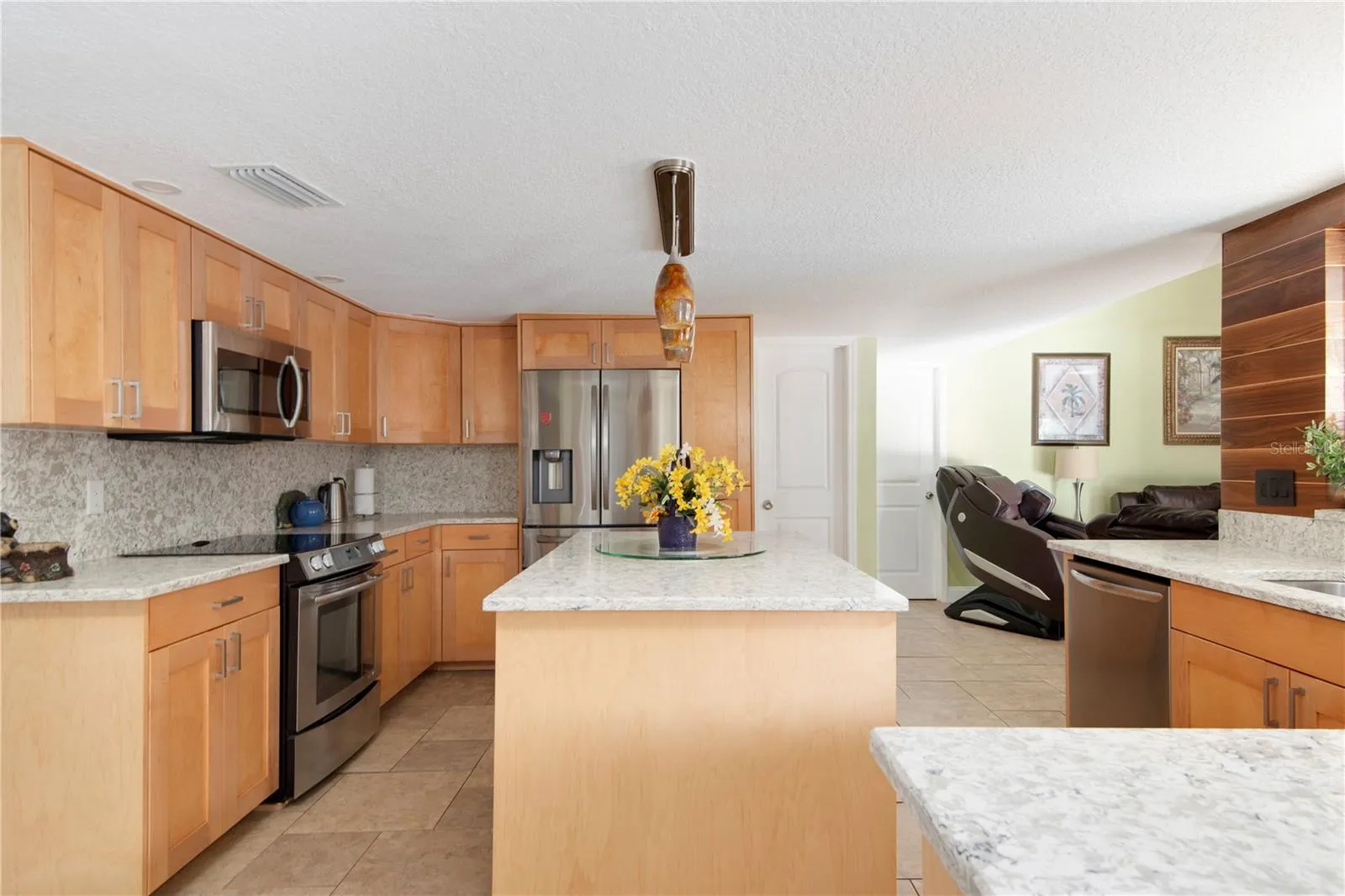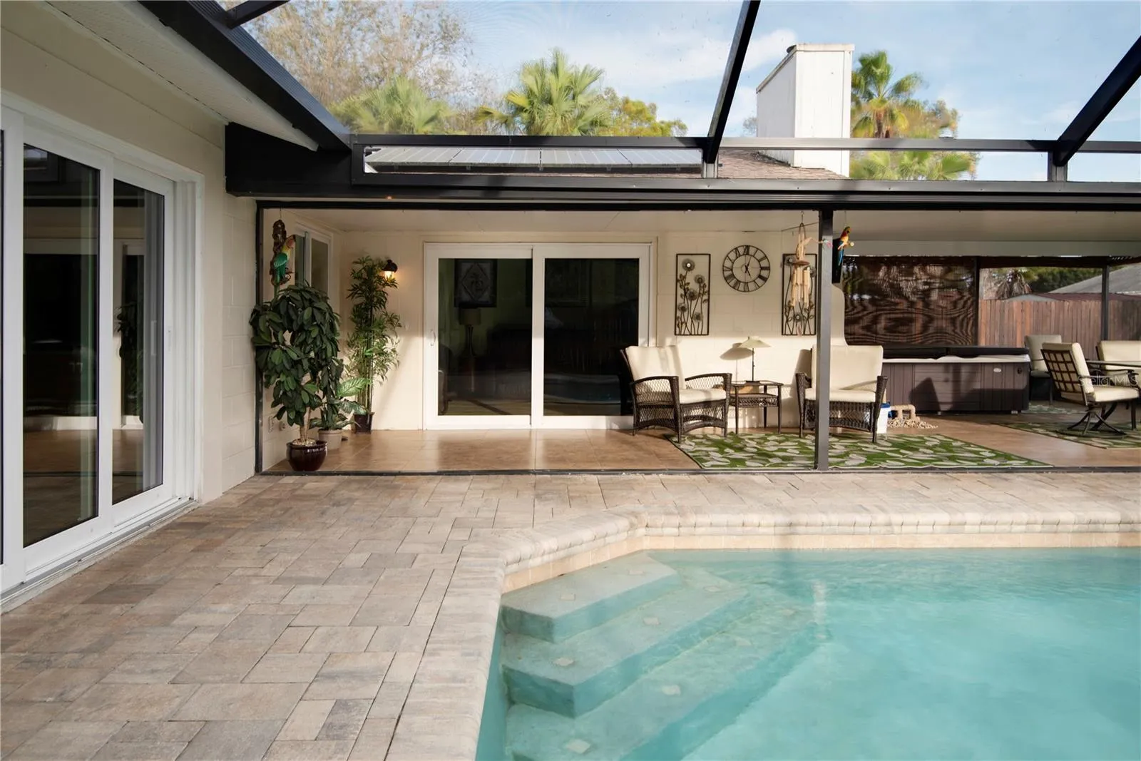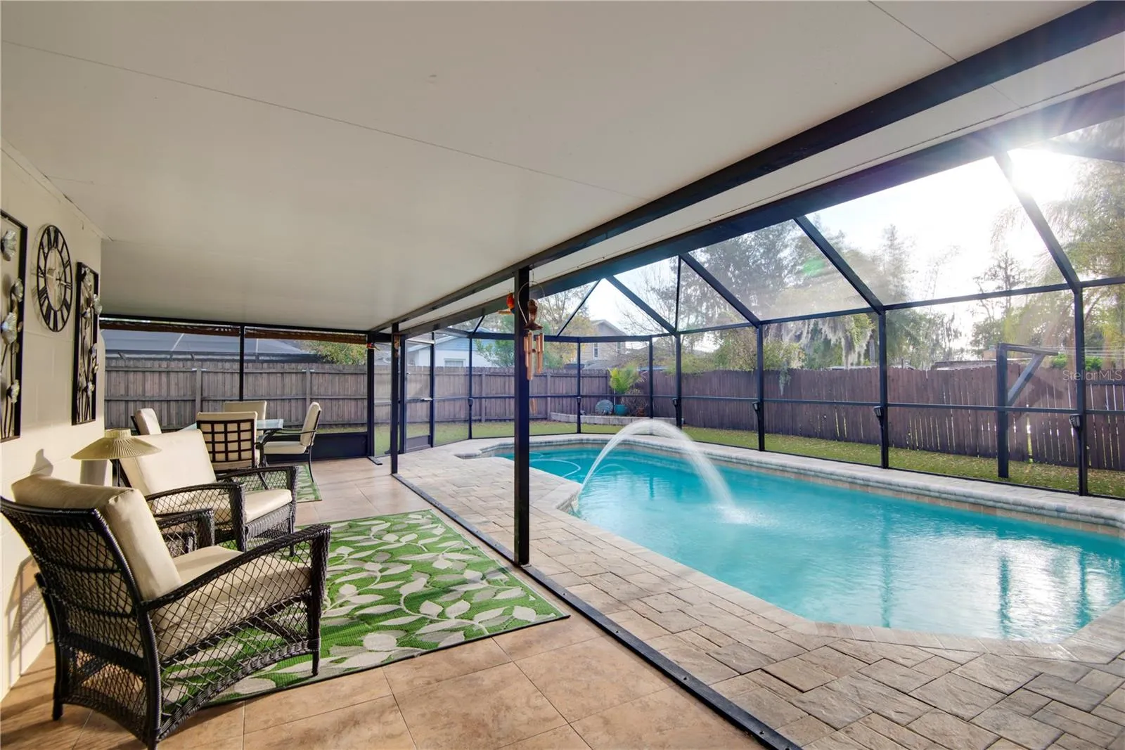 The home offers a fully remodeled kitchen with REAL MAPLE cabinets, stainless steel appliances, quartz countertops, custom built walnut/maple wood backsplash over the double sink area, oversized closet style pantry and so much more! Air conditioned garage with professionally installed epoxy flooring (MAN-CAVE???). Make your way to the Backyard through the newly installed triple slider off the dining room or through the living room out into the covered patio area. Relax with your morning coffee or evening cocktail to the sound of the water feature in the oasis of a fenced backyard that never needs mowing! The beautiful pool includes a large screen enclosure, detached hot tub (included with purchase). Modernized local park, walk-able within minutes! Park includes pickle-ball courts, Tennis courts, Basketball courts and more, a MUST-SEE! Come and see the home, you DESERVE, before someone else beats you to it!