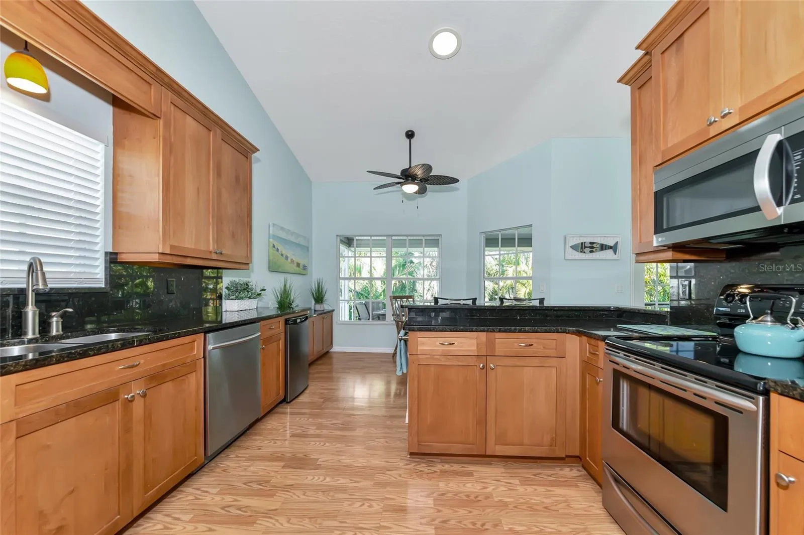 - Ceiling Fans(s), Open Floorplan, Walk-In Closet(s), Living Room/Dining Room Combo, Eat-in Kitchen, Primary Bedroom Main Floor, Window Treatments, High Ceilings, Vaulted Ceiling(s), Stone Counters, Solid Wood Cabinets, Cathedral Ceiling(s), Built-in Features