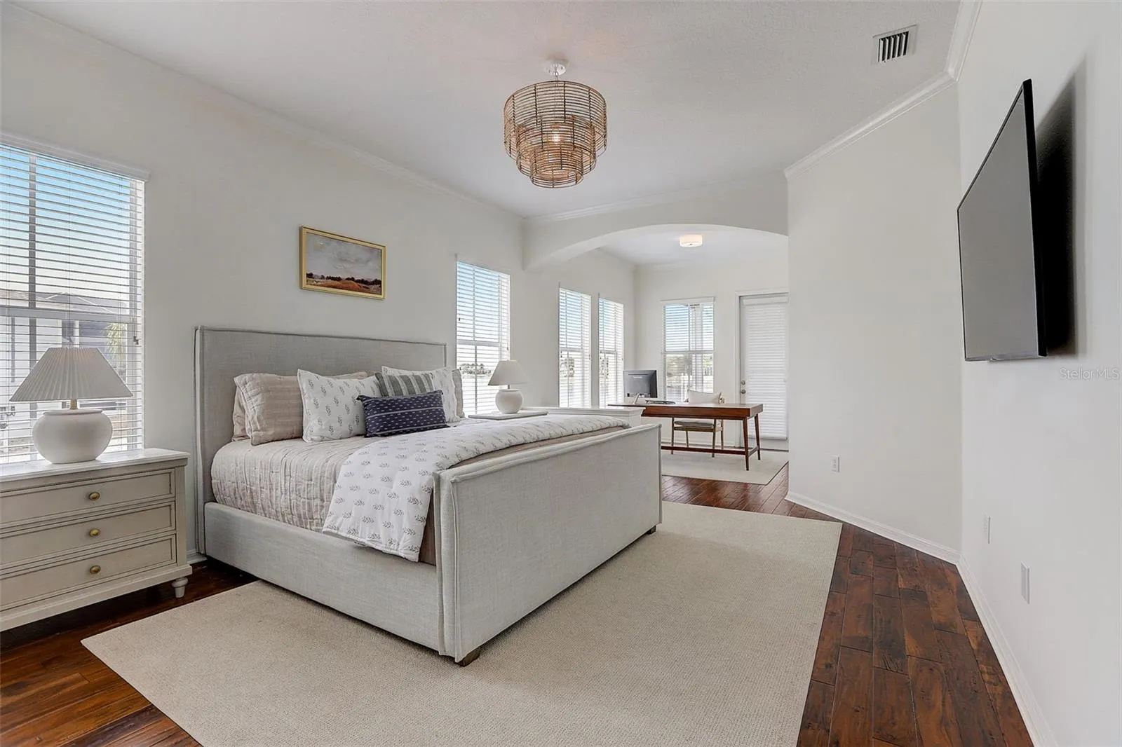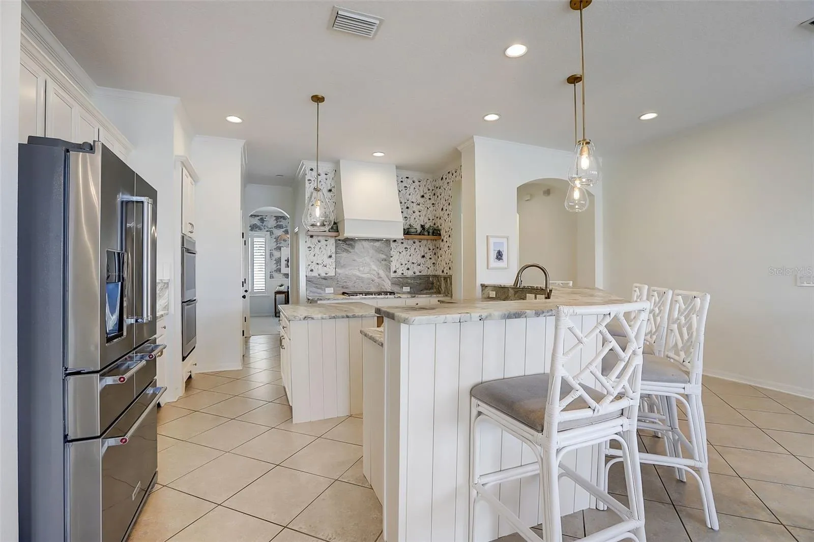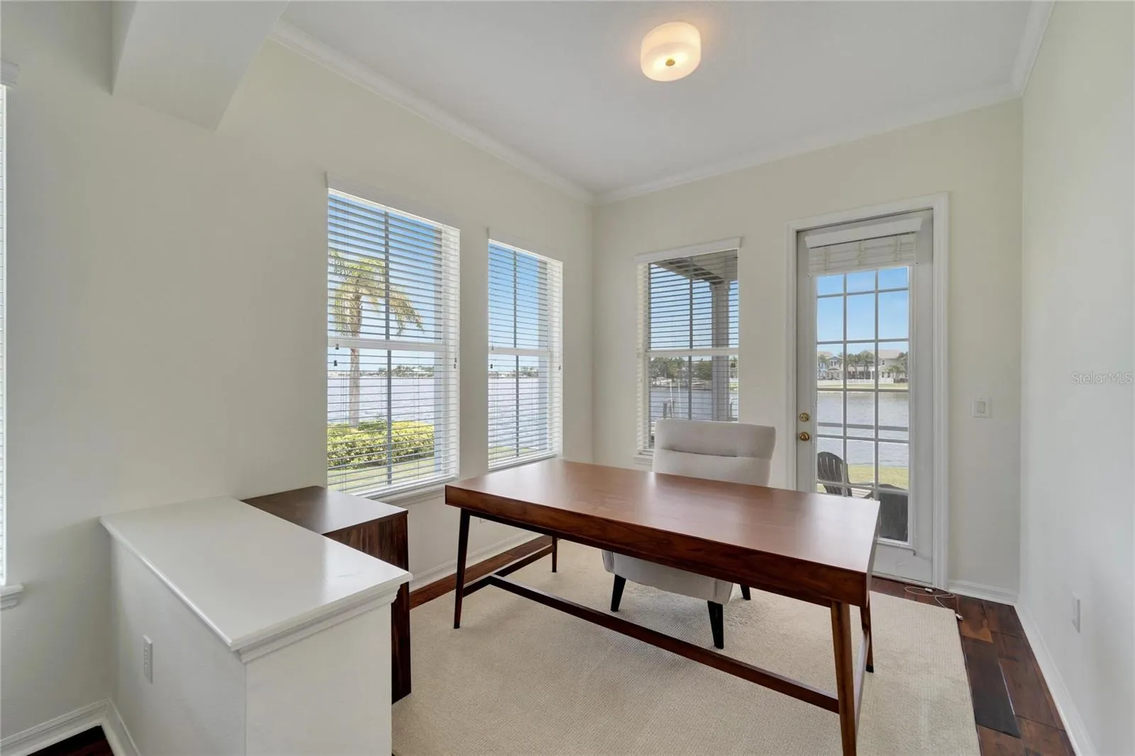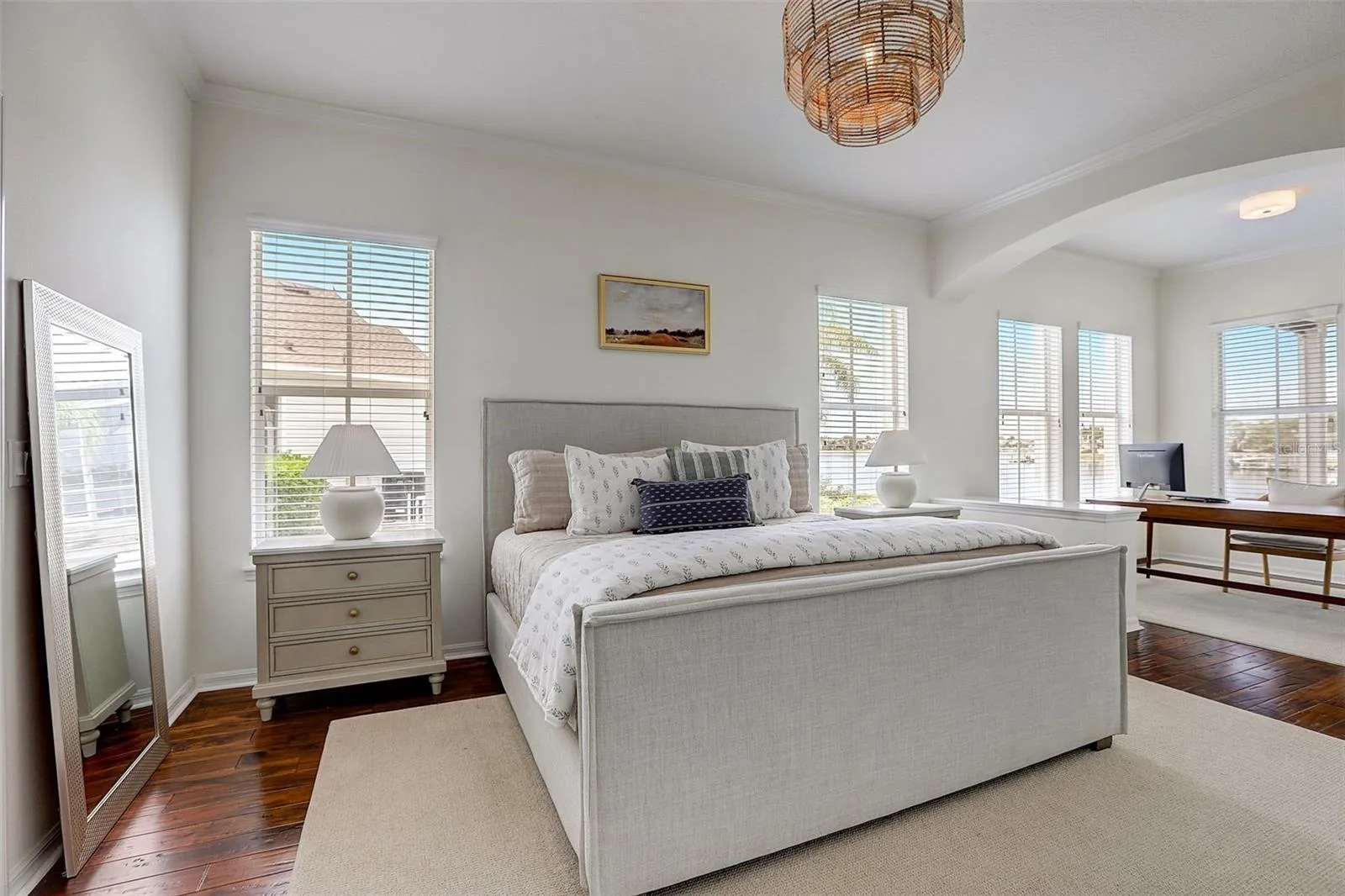 The flex room can be utilized as a formal dining space, office, or second living room. The completely remodeled kitchen features leathered quartz countertops and backsplash, a new gas cooktop, double ovens, custom vent, new sink, undercabinet lighting prewired, and upgraded touchless faucet. The adjacent dining area provides ample space for family dinners or casual meals. The spacious master suite features a large walk-in closet and an en-suite bathroom with dual sinks, a soaking tub, and a separate shower. A dedicated flex space in the master suite can be utilized to fit your needs, such as an office overlooking the lagoon, a workout area, or a morning reading nook. The two additional bedrooms aregenerously sized and sit opposite the master.