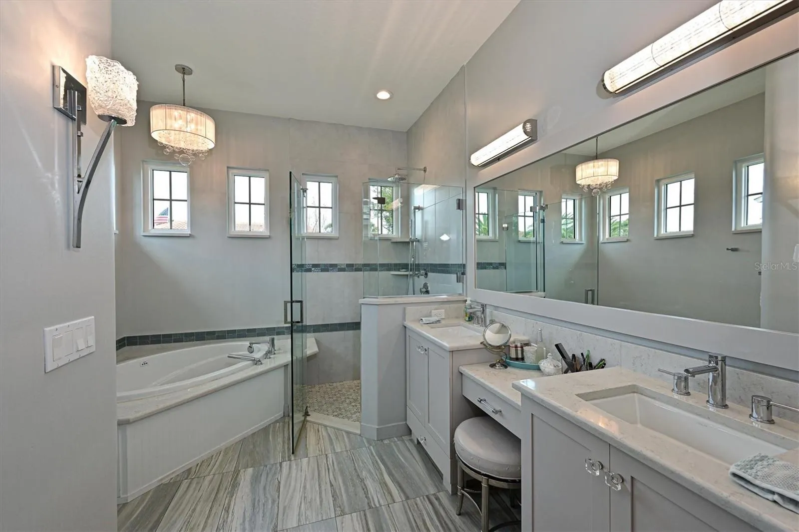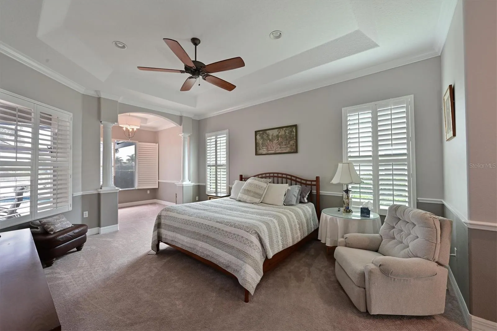 - Crown Molding, Thermostat, Walk-In Closet(s), Living Room/Dining Room Combo, Kitchen/Family Room Combo, Primary Bedroom Main Floor, Split Bedroom, Window Treatments, Stone Counters, Solid Wood Cabinets, Tray Ceiling(s), Built-in Features