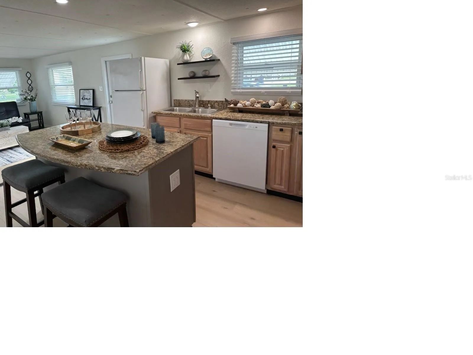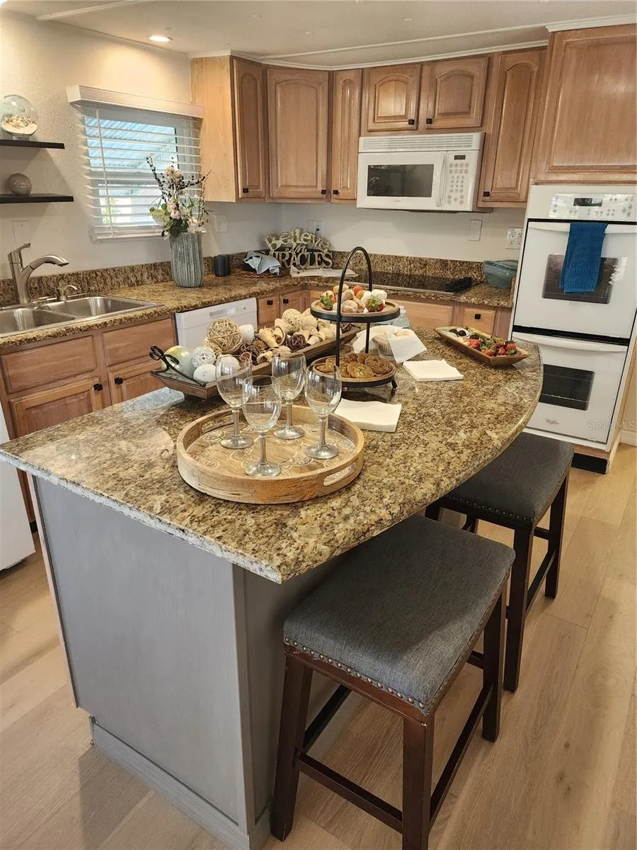 One or more photo(s) has been virtually staged. This residence is precisely what you’ve been searching for, nestled in a superb 55+ community where you own your lot share. The home boasts a stunning Dream Kitchen equipped with genuine wood cabinets, granite countertops, and a Center Island perfect for all your entertaining and culinary aspirations. It features Double Ovens, a 4 Burner Cooktop with a warmer, Microwave, and a Brand New Dishwasher. The bathroom, reminiscent of a magazine showcase, includes designer ceramic tile and a modern aesthetic. It’s equipped with new frameless glass shower doors, a fresh bathroom vanity with a quartz countertop and sink, and all-new faucets. Additional highlights include updated double pane single hung windows with new blinds, an elegant leaded glass front door, a New 24 seer A.C./heat unit installed in 2024, new engineered wood – 100% life-proof wood plank flooring (with new subflooring where necessary), freshly applied knockdown texture on interior drywall and new paint throughout, IG sprinklers using reclaimed water with a new timer, a gas hot water heater, washer/dryer connections and cabinets, a tool pegboard, and hurricane/shade shutters. The lot adjoins a privacy fence providing ample space and seclusion to relish the all-weather screened patio with new tinted vinyl windows, plus an extra paver patio at the back for barbecues. An external shed is also present at the rear of the home. The covered carport and screened patio floors are coated with 2-part epoxy for effortless upkeep. Situated conveniently near both St. Pete and Tampa, this home lies within an active 55+ waterfront community, granting access to numerous amenities such as a boat launch and slips (along with storage for recreational vehicles), a gym, billiards, shuffleboard, a waterfront clubhouse, a heated pool, a hobby shop, and a plethora of onsite clubs and activities. Proximity to local beaches, museums, golf courses, and international airports enhances its appeal. Seize this chance to embrace an exceptional lifestyle! A modest HOA fee of $360 covers a 24-hour manned gate, water, trash, lawn maintenance, and use of all communal areas and facilities. Furniture can be included.