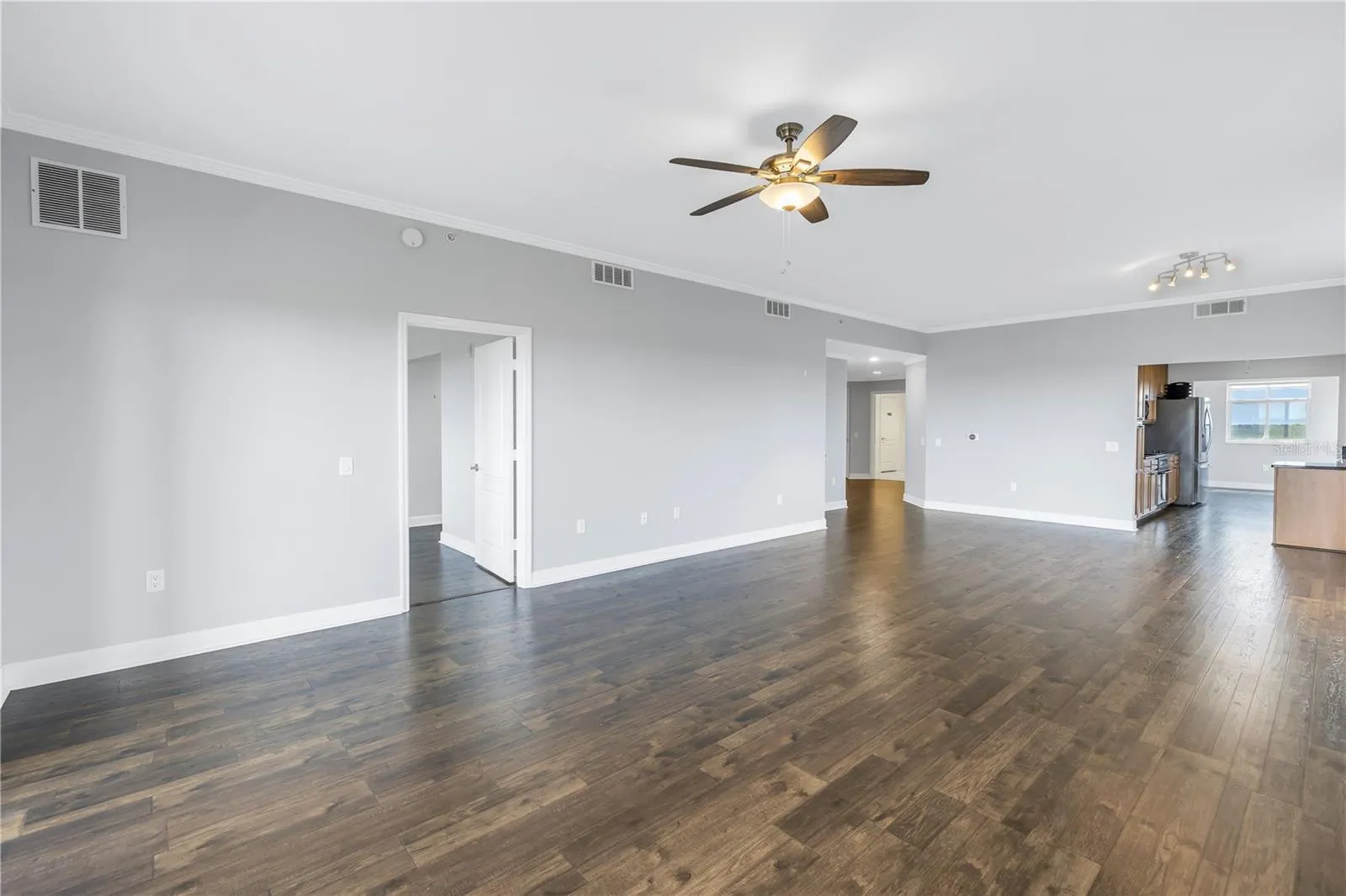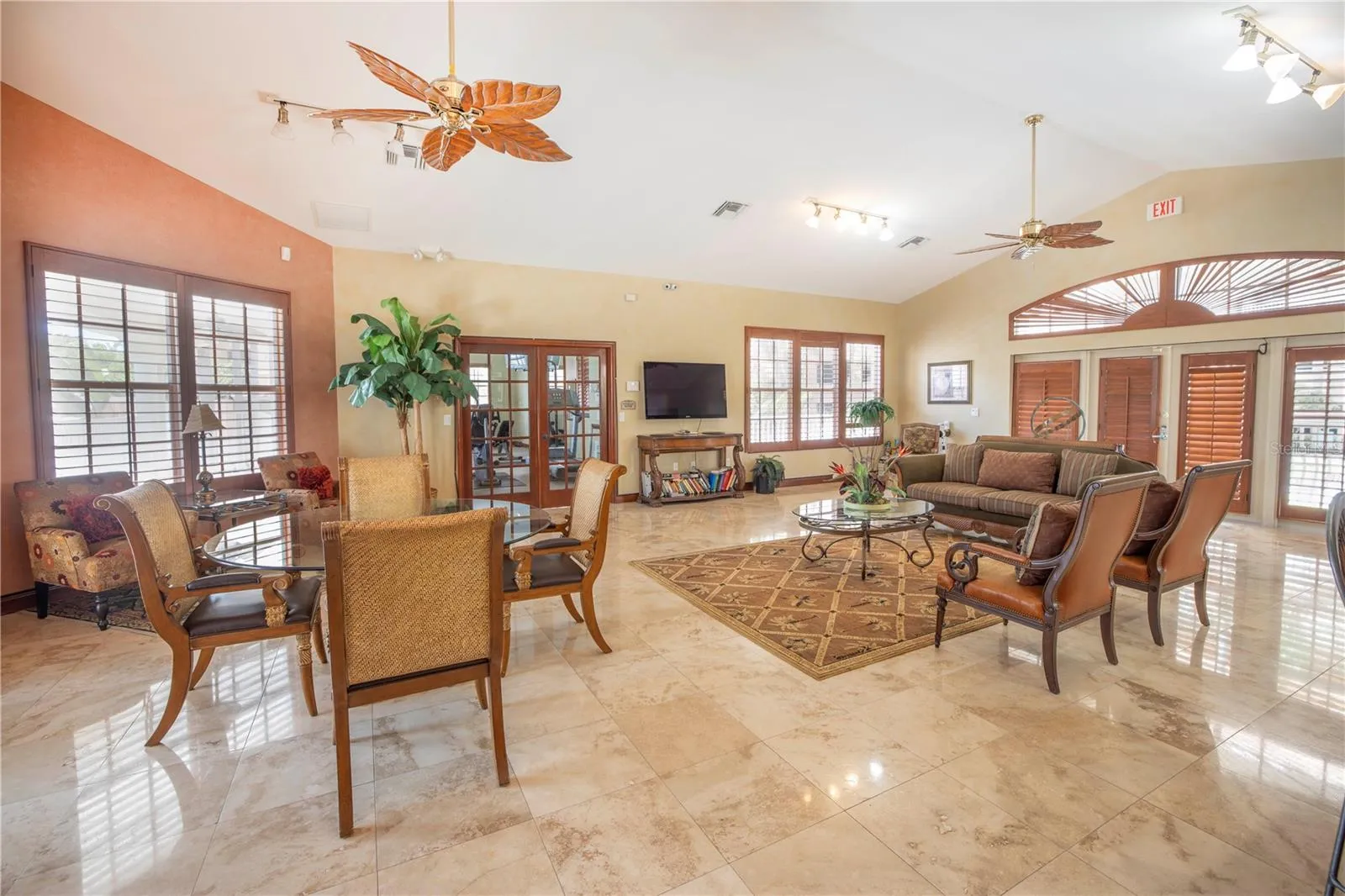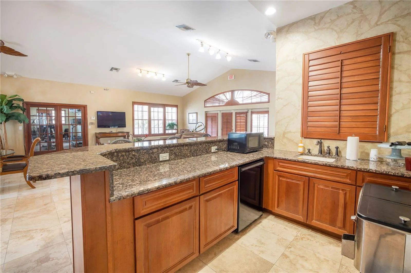- Ceiling Fans(s), Open Floorplan, Thermostat, Walk-In Closet(s), Living Room/Dining Room Combo, Eat-in Kitchen, Primary Bedroom Main Floor, Split Bedroom, High Ceilings, Stone Counters, Solid Wood Cabinets