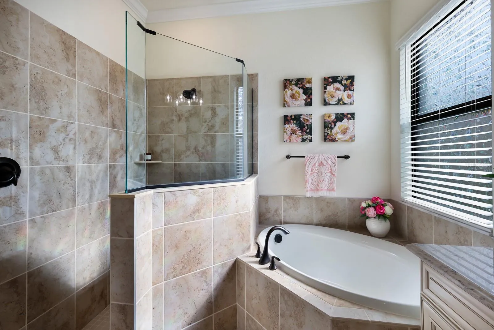 - Ceiling Fans(s), Crown Molding, Open Floorplan, Thermostat, Walk-In Closet(s), Eat-in Kitchen, Kitchen/Family Room Combo, Primary Bedroom Main Floor, Split Bedroom, Window Treatments, High Ceilings, Stone Counters, Solid Wood Cabinets, In Wall Pest System, Tray Ceiling(s)