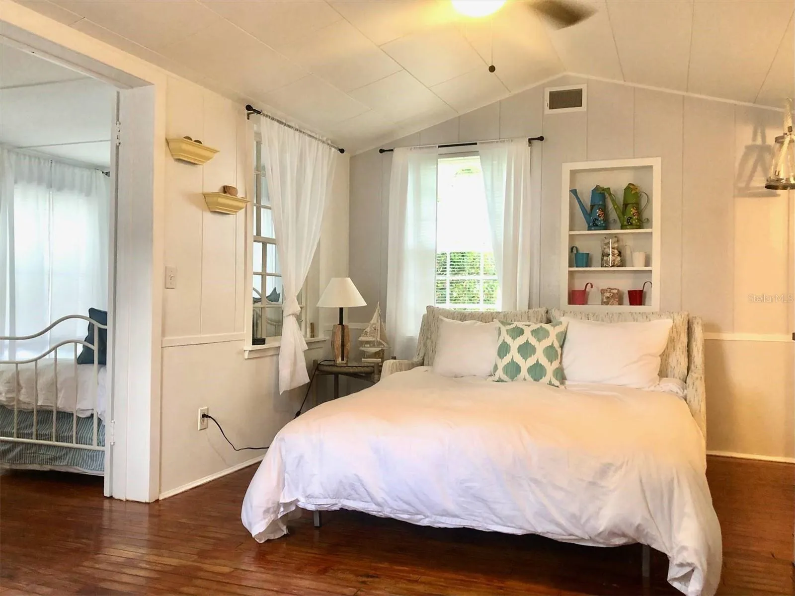 Discover this charming cottage tucked away on a serene corner lot. Inside this delightful space, you’ll find high ceilings, a nice remodeled kitchen & bath. Loft-like setting features a queen-size Tempurpedic, ensuring a cozy, restful night. A separate room awaits, overlooking a beautifully landscaped yard, offering a tranquil home office. The cottage is bathed in natural light, with windows generously scattered thru-out, creating a warm ambiance. THE perfect haven for two lovebirds seeking a romantic getaway.