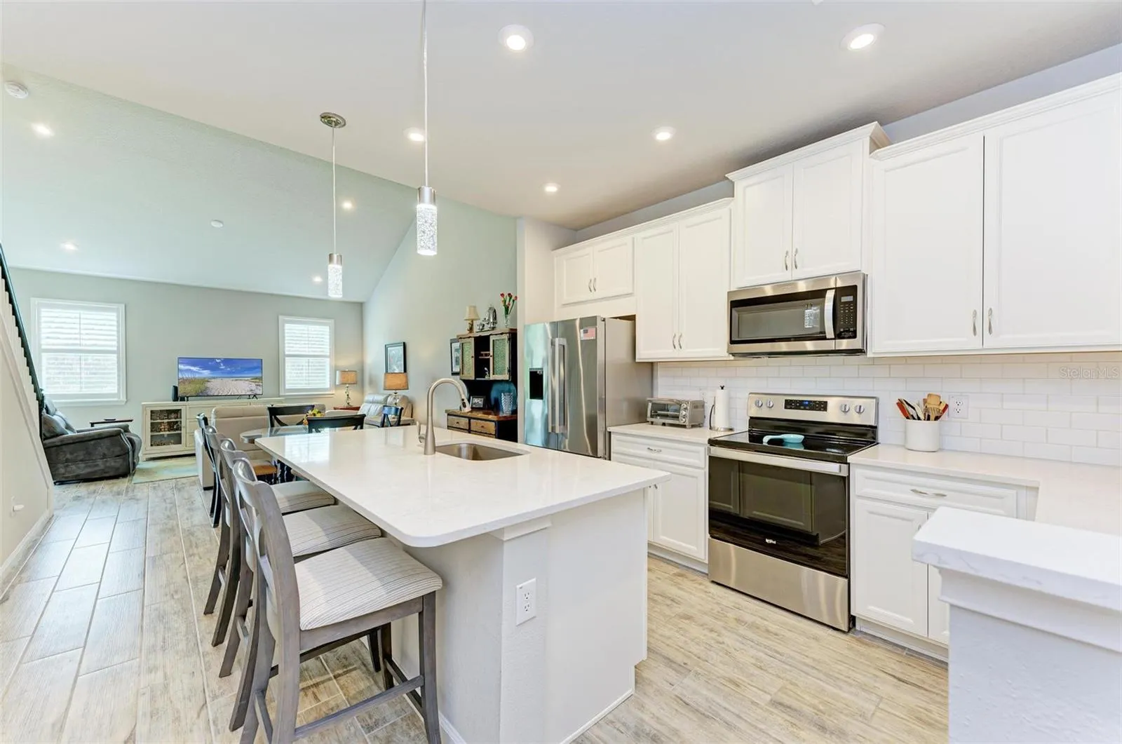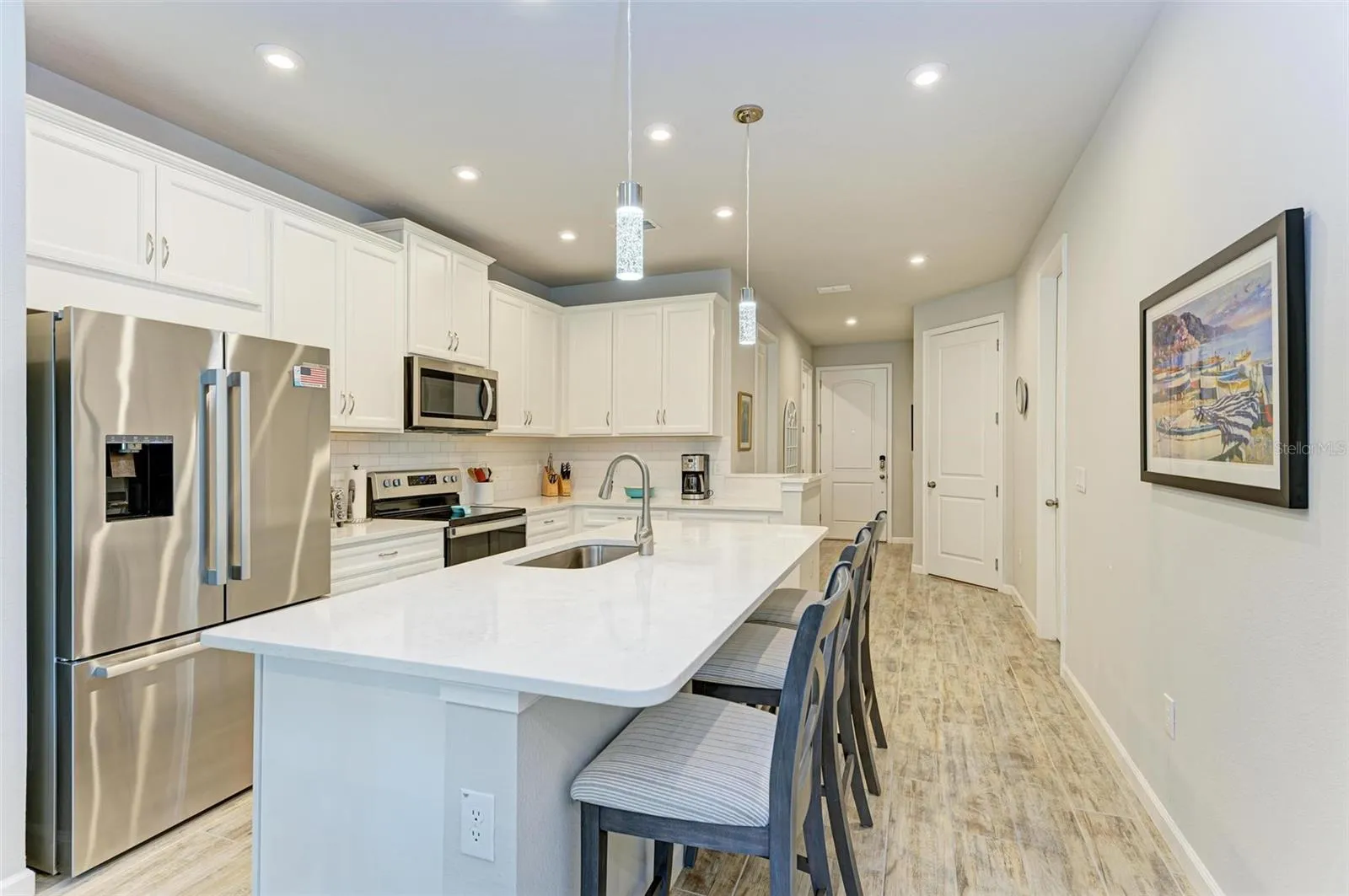 PRICE DROP & READY TO SELL!!!This move-in ready Townhome is located in the desirable Harmony/Lakewood Ranch and offers a “maintenance free” lifestyle full of amenities and in a “prime” location. As you enter, you will see the inviting bright open floorpan. The foyer offers a guest bath and laundry room w/ extra storage. Step into your beautiful modern chefs kitchen with white quartz countertops, a huge eat in island, white wood cabinets with lower custom pull-out shelving, stainless whirlpool appliances, along with a Bosch stainless refrigerator. The kitchen is perfect for entertaining family and guests as you enjoy the open floorpan to the dining and living room so everyone can be together. The high ceilings make this 3 bed/3 bath, 1,904sf home feel larger than it is. The spacious primary bedroom retreat is on the 1ST Floor and overlooks the private, serene water view & preserve. The ensuite offers a large quartz vanity w/ double sinks, plenty of storage cabinets, an extra large walk-in closet with added storage space, and a walk-in oversized shower. Off the main living area you also have a private patio that is all screened for you to enjoy throughout every season, and perfect for watching nature, and the Florida sunsets as you enjoy your favorite beverage at the end of the day. A rare find with this floorpan is the 2nd floor bonus loft area that offers an additional TV/living space, and the other side allows you to have an office/den space without sacrificing a bedroom. The two additional guest bedrooms are spacious, offer great closet space, and share a large bathroom w/ tub. This newer 2022 townhome truly feels like a single family home and has been extremely maintained by the owners. Added features include downstairs plantation shutters, a motorized electronic blind over the sliding doors to the lanai, sealed tile/grout on first floor, an epoxy garage floor, smart thermostats for climate control, Ring security doorbell, and a keyless entry. As a bonus, the owner’s added a “Aquasana” Water Filteration System throughout the entire home that is safe to drink, and for beautiful soft glowing skin & hair.