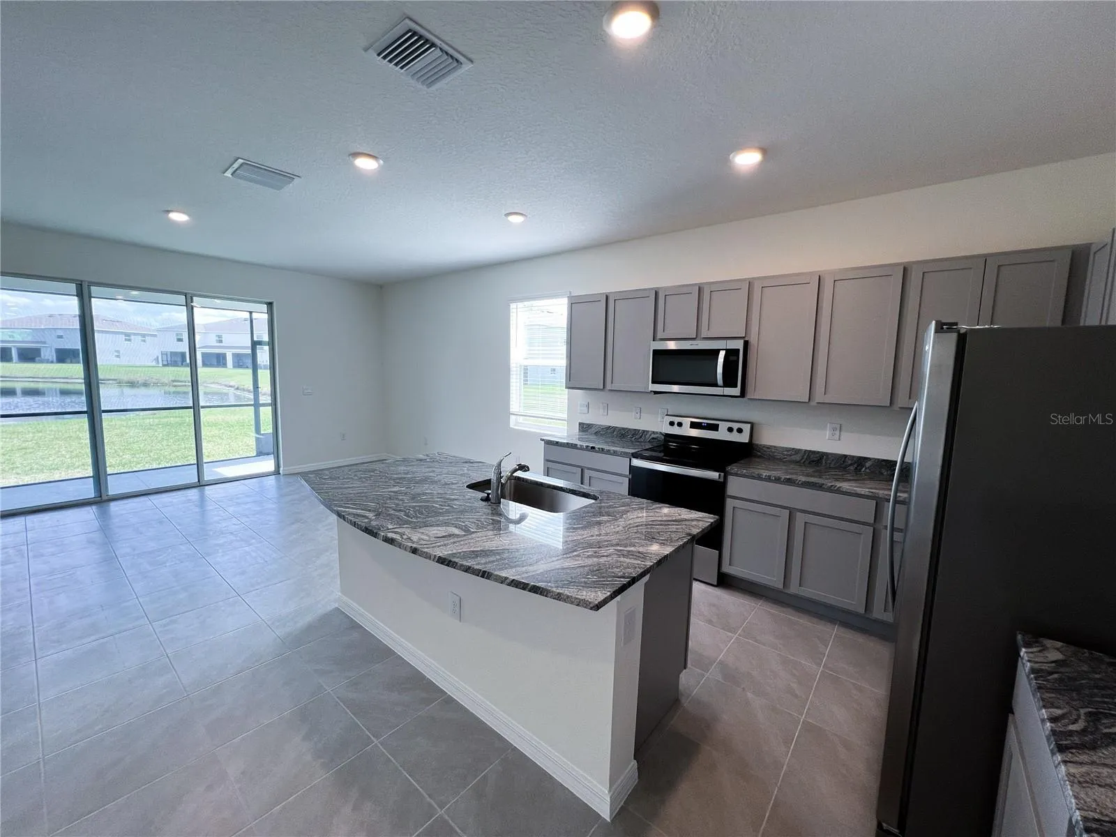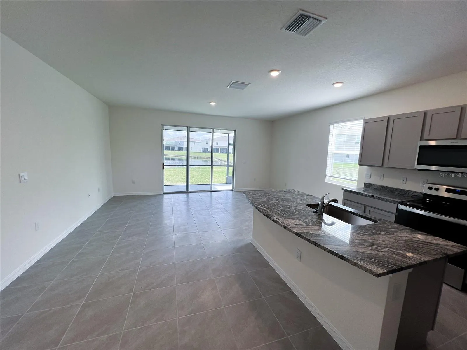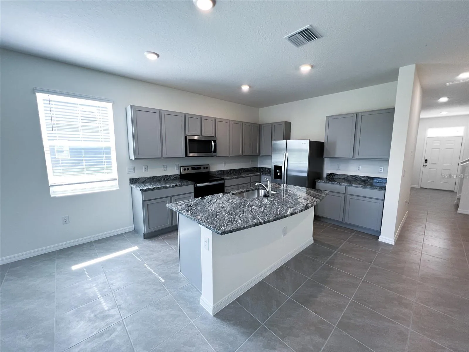 - Open Floorplan, Thermostat, Kitchen/Family Room Combo, Window Treatments, High Ceilings, Smart Home, Solid Surface Counters