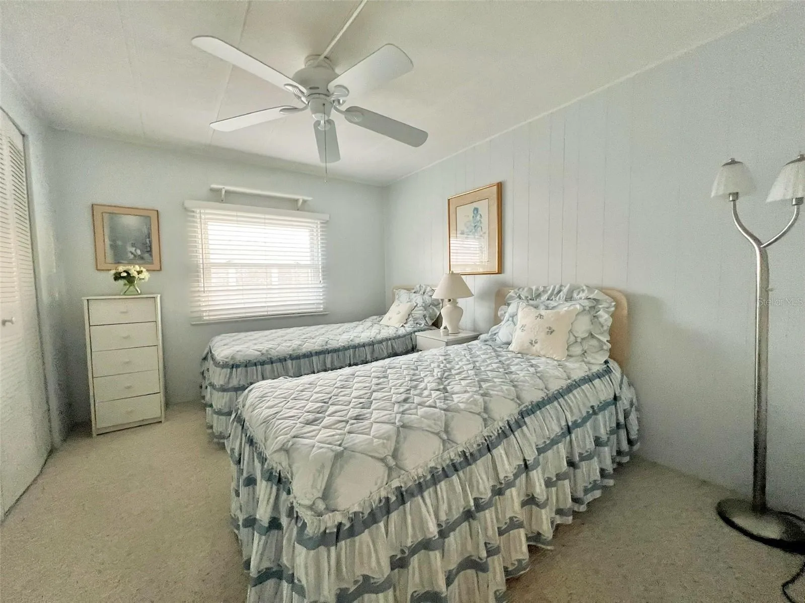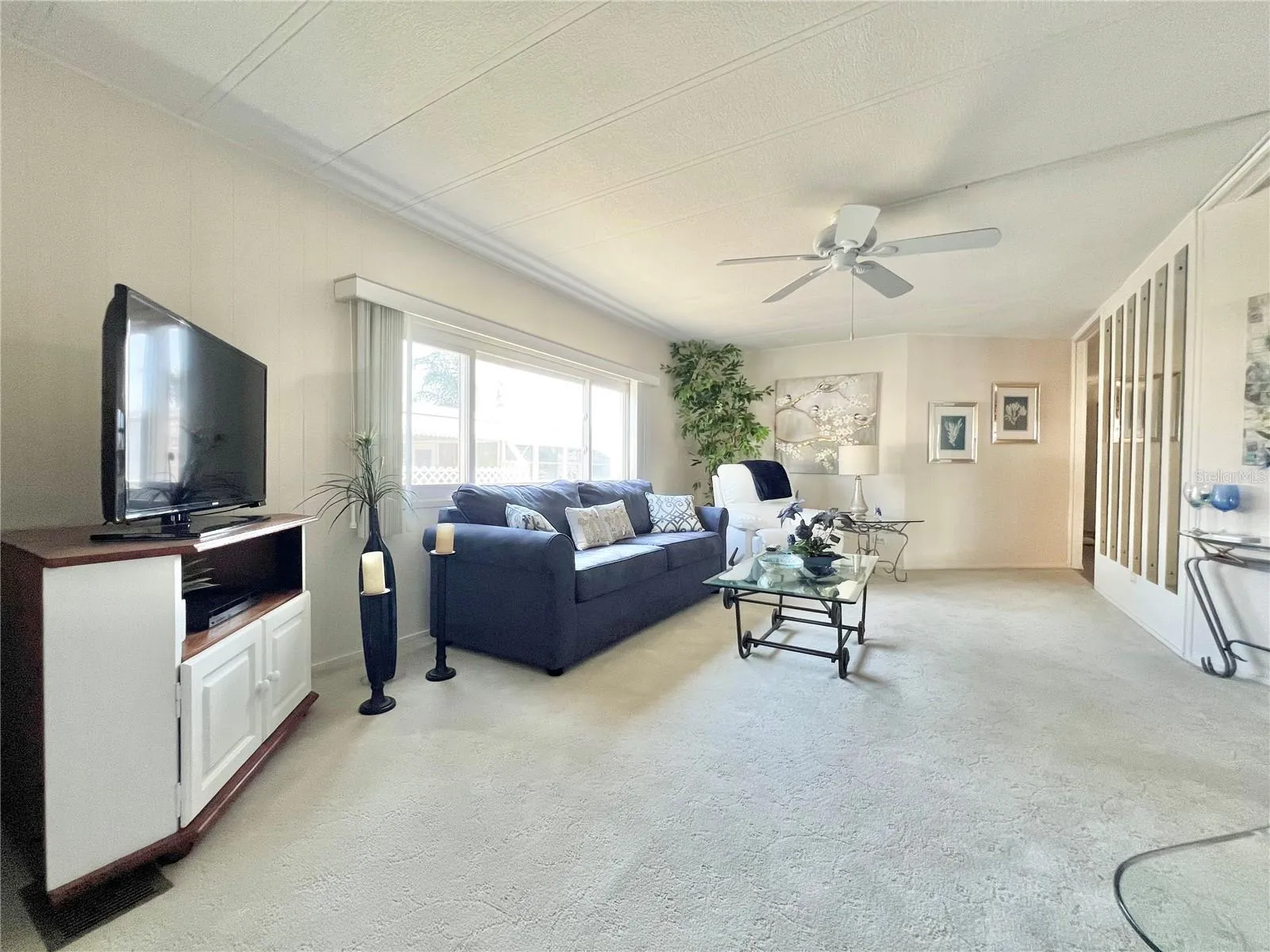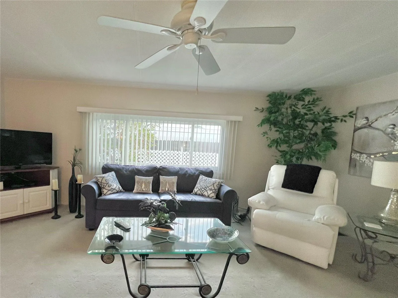 This residence features a roof over, vinyl siding, and newer windows, accompanied by a modernized kitchen. The interior was tastefully painted throughout with neutral colors, offering a harmonious aesthetic. While the flooring in the kitchen and bathrooms mimics the appearance of ceramic tile, it is, in fact, constructed from durable vinyl. The primary bedroom is appointed with a spacious walk-in closet and double sinks in the en-suite bathroom. The property includes a Florida room at the front of the house and a screened room on the north side beneath the carport, complemented by an extended driveway. A/C installed in 2015. Furnished and convenient to the south pool. The co-op land share, integral to every Fairway Village home sale, is included in the list price. Fairway Village stands as a premier manufactured home community, offering an ideal living environment for individuals aged 55 and above, whether they choose to reside year-round or spend part of the year elsewhere. As a 100% Resident Owned Manufactured Home Community comprising 751 homes, we pride ourselves on providing a sense of spaciousness with wide curbed streets, street lights, and sidewalks, ensuring a safe and inviting atmosphere for our residents. All homes are strategically located with established setbacks from the street, contributing to a well-planned and aesthetically pleasing neighborhood. For pet owners, we offer a restricted pet section allowing one pet per household weighing 45 pounds or less. Our community boasts an array of amenities designed to enhance the quality of life for our residents: Private 9-hole par 3 golf course with lakefront fairways and a practice putting green, Five-plus acre lake for catch and release fishing, Two swimming pools with hot tubs, Eight sheltered shuffleboard courts for friendly competition. A brand new 19,000+ sq. ft. Clubhouse completed in January 2022, featuring: 700-seat Auditorium/Ballroom for events and gatherings, Large commercial kitchen for culinary activities and events, Stage for chorus performances and other programs, Separate conference rooms for meetings and discussions, Fitness center to promote health and wellness among residents, Library, billiard room, card playing room, and comfortable sitting areas, Wi-fi service throughout the clubhouse for connectivity needs. Fairway Village’s 2024 maintenance fee of $396/month covers a comprehensive range of services, including water, sewer, in-home high-speed internet access, 220+ Spectrum cable TV channels, curbside trash pickup, lawn pest control, and lawn care, ensuring a hassle-free living experience for our residents. Additionally, residents have the option to enjoy annual golf memberships for $435/year plus 7% sales tax, offering unlimited play on our beautiful golf course. Non-members can also access the course by paying a nominal greens fee during the season. Our vibrant community spirit is further enriched by the Fairway Village Social Committee (FSC), which organizes and coordinates over 50 social activities, fostering connections and creating memorable experiences for our residents. Come and experience the unparalleled lifestyle and amenities that Fairway Village has to offer—your dream home awaits! All dimensions provided are approximate and should be verified by the prospective buyer, emphasizing the importance of independent verification for accuracy in listing information.