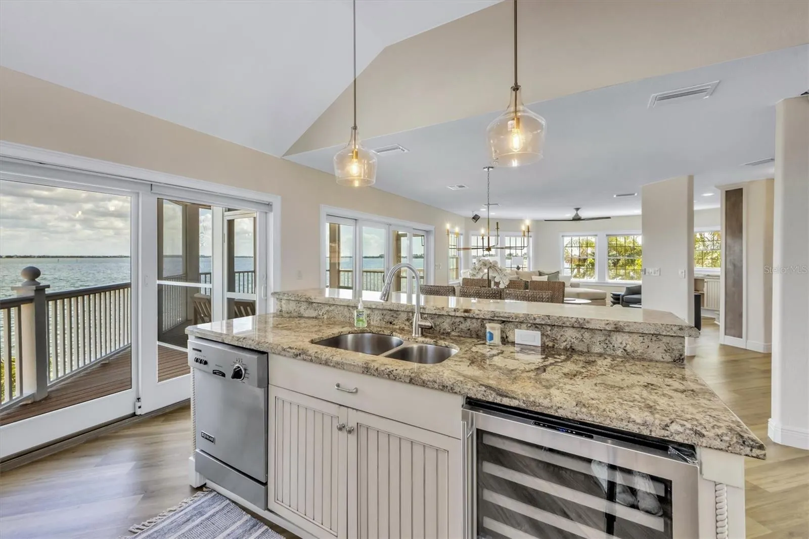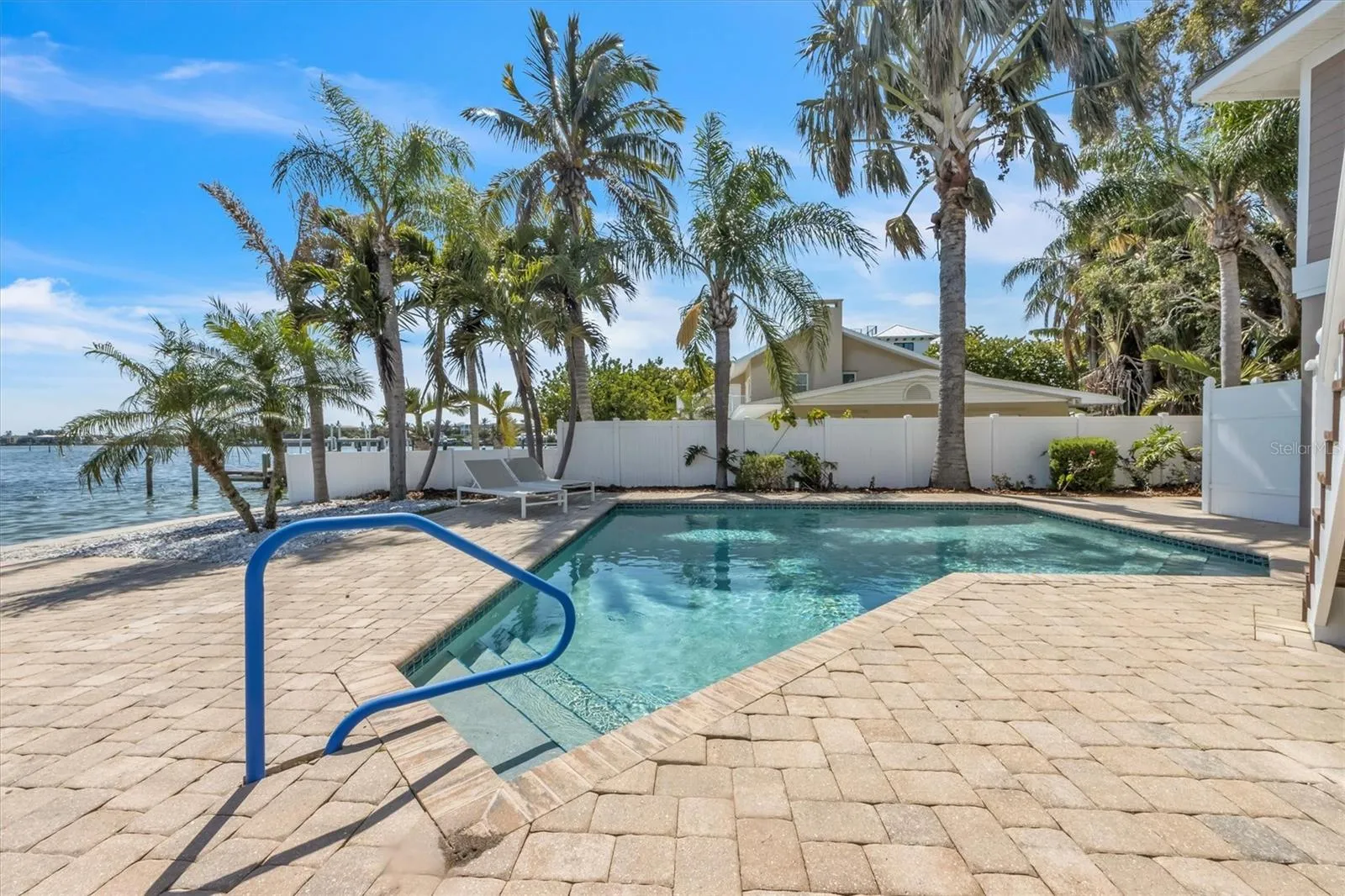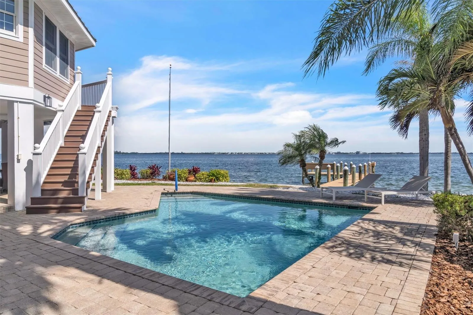 The living room opens up to a large screened patio that is perfect to relax and have your morning coffee greeted by intercostal breeze. The kitchen is a culinary enthusiast’s delight, featuring a large island, wine fridge and more. Whether you’re preparing a casual breakfast or hosting a gourmet dinner party, this kitchen is sure to inspire your inner chef. On the main level, there are two bedrooms with a shared bathroom with a walk in shower, and a half bath for guests. This floor has elevator access from the ground level foyer. The top floor is complete with a large Master ensuite with a private screened in porch with panoramic views for ultimate peace and privacy. The backyard is fenced with landscaping, heated pool and private dock. The private dock, providing direct access to the intercostal waterway for boating, fishing, and water sports enthusiasts. Whether you’re an avid sailor or simply appreciate the beauty of waterfront living, this home offers the ultimate coastal lifestyle experience. More features is a covered area that is the perfect spot for an outdoor kitchen or bar area and there is a side entry garage as well as an additional garage and storage area that would be perfect to store all your beach toys and fishing poles. Located in a sought-after neighborhood, very quiet, 30 day rental minimum, this property is just minutes away from pristine Gulf beaches, local restaurants and shopping ensuring that every day feels like a vacation in paradise. Don’t miss your chance to own this breathtaking waterfront haven – schedule your private showing today and start living the life you deserve.