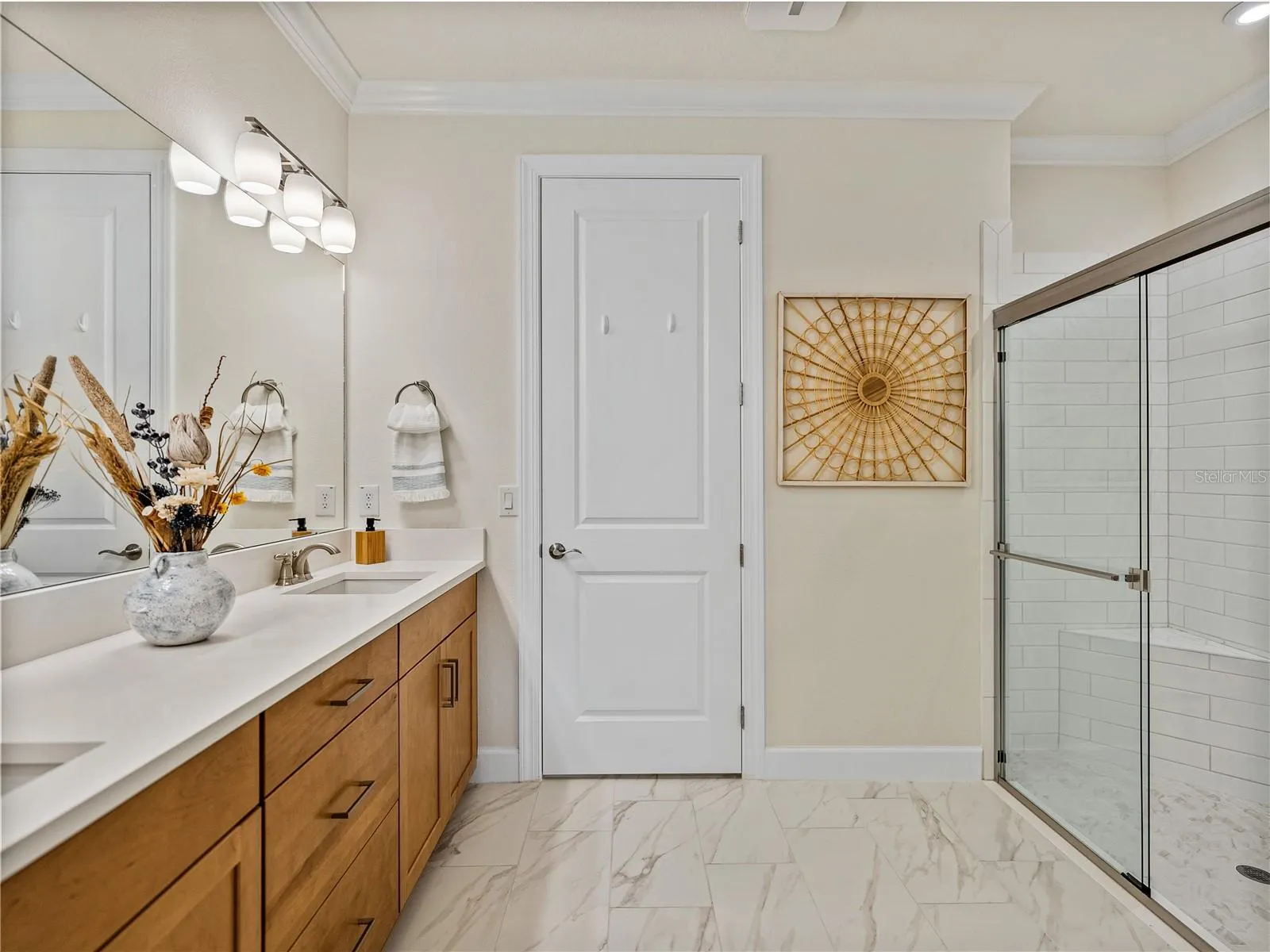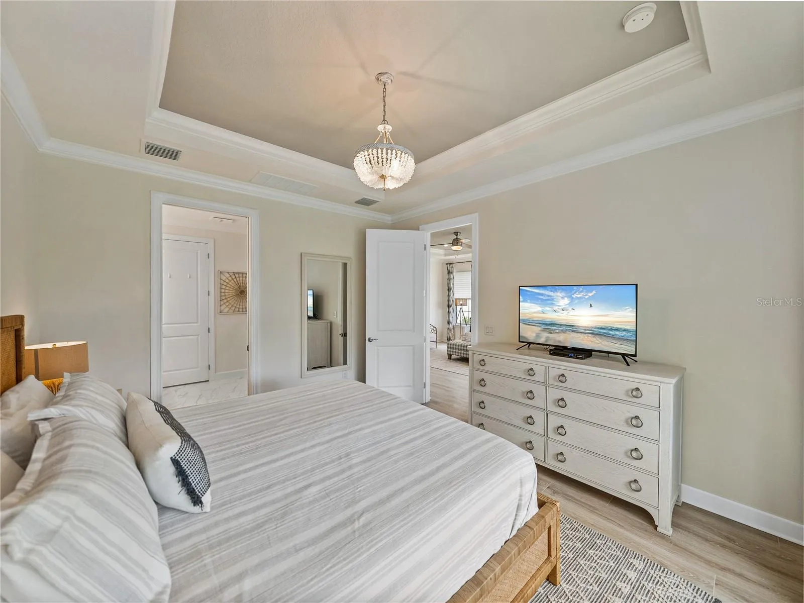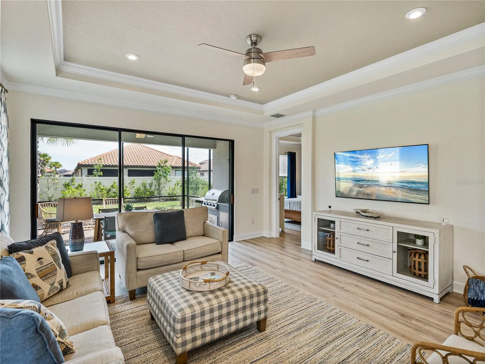 Welcome to your new extraordinary home. Esplanade at Wiregrass Ranch is one of the highly acclaimed exclusive neighborhoods in the area: experience resort-style and maintenance-free luxury living at its finest. Impeccably detailed this flawless Taylor Morrison single-story home features some of the finest upgrades and designer finishes spaced over its 1,926-sf living space of the popular “Arezzo” floor plan. The Arezzo floor plan includes three bedrooms, plus a study. It is a fantastic floorplan whether you are looking for a full-time residence or a seasonal one. Upon entering you will be taken in by the tastefully decorated home which makes a dramatic statement, complimented by natural interior colors that are highlighted via an abundance of natural light from large windows and glass sliding doors throughout. As you stroll around you will notice the fine details that were added to make this home unique such as but not limited to; Mohawk Revwood plank flooring, custom window treatments, crown molding, tray ceilings with crown molding, 8-foot interior doors, professionally painted interior with accent features, whole house water softener, upgraded lighting, custom cabinetry in the laundry room with sink, extended paver lanai with electric shade, custom built-in summer kitchen, epoxy garage floor, and upgraded landscaping to mention a few. With its open floor plan, it is easy to feel right at home, yet it is a versatile floor plan that makes it a fantastic home for entertainment too. The gourmet kitchen is every chief’s dream with a natural gas cooking range, ample quartz countertops, 42” cabinetry with molding, GE stainless steel appliances, subway tile backsplash, counter-height seating, and a pantry. A separate dining room is great for formal dinners with friends and family alike. Have to do a little work, or perhaps you just want to catch up on your favorite book. You can do so in your private study with beautiful glass French doors. The spacious primary suite is complete, with an en-suite bath, dual vanity, a large walk-in shower, a private water closet, and ample closet space with two large walk-in closet areas combined. This split floor plan makes it great for welcoming family and or guests, with guest suites at the other end of the house. Enjoy your evenings on your extended lanai whether enjoying cocktails, tea, or preparing a meal in your fully equipped custom summer kitchen. The paver lanai with its electric sun shade is a wonderful space to sit back and enjoy your evenings, mornings, and even afternoons. Esplanade at Wiregrass Ranch Lifestyle includes a resort-style pool and spa, cabanas, a state-of-the-art fitness center, a billiard/card room, a fire pit area, a dog park, pickle ball courts, bocce ball, tennis courts, and a full-time on-site lifestyle manager. You can also indulge in decadent signature spa treatments and concierge services. As if this could get any better, furnishings/turn-key options are available for purchase under a separate contract. Schedule your private showing today and start living an extraordinary lifestyle in an extraordinary home. Room Feature: Linen Closet In Bath (Primary Bathroom).