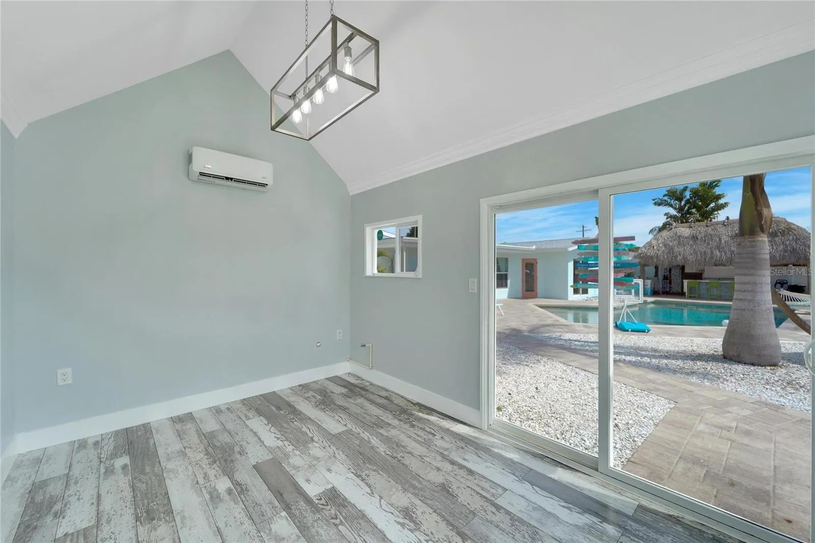Venture outdoors to a freshly installed roof with insulation (2023), a newly concreted driveway (2022) for up to six cars, RV, or boat trailer parking, and a convenient Tesla charger (2024). The resort-style atmosphere awaits in the custom 20×10 Tiki with fans and a TV mount, alongside a slide-pool featuring a new energy-efficient pump (2023), paying homage to mid-century aesthetics.