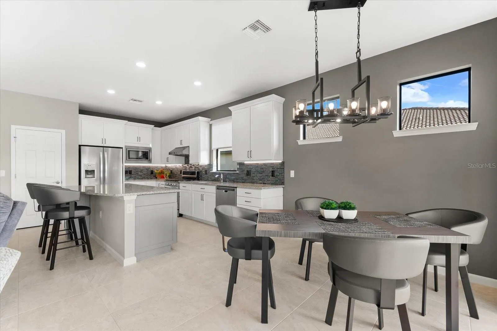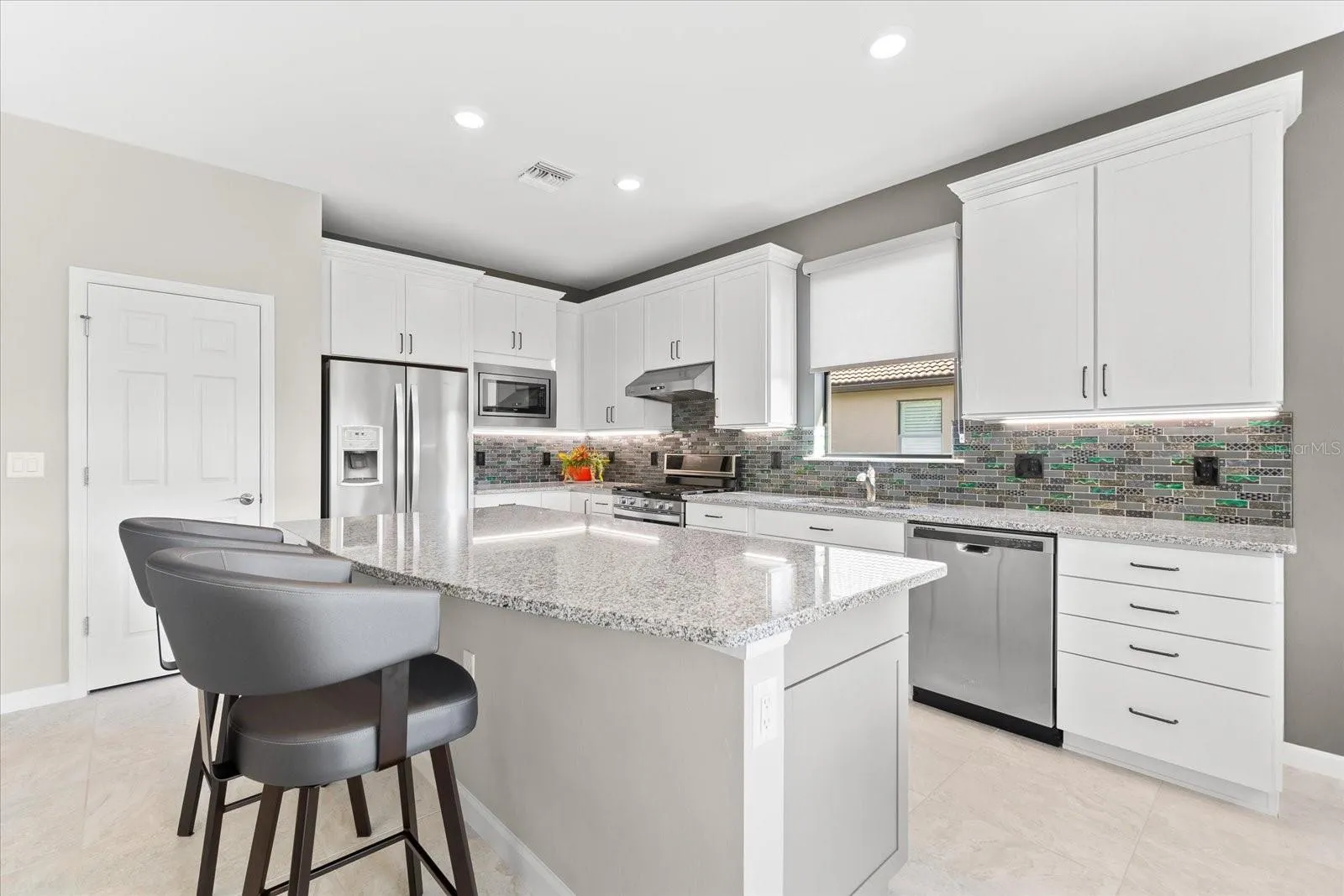 The heart of the home, the kitchen, will delight the chef within you, featuring granite countertops with complementary glass backsplash, light cabinets with undermount lighting, a gas range, and stainless-steel appliances, ensuring both functionality and style.