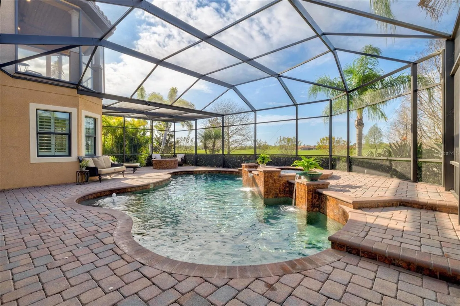 Luxury awaits in this gorgeous Keystone Grand II – Former Model Home – in the prestigious and amenity rich community of Country Club East! If you are looking for the WOW factor, you will get it as soon as you walk through the double front doors and take in the stunning open foyer with high ceilings, custom marble and hardwood flooring throughout, custom wood details including crown molding, wainscoting and designer coffered ceilings! And that view!! Situated perfectly to soak up all that glorious sun with southwestern exposure overlooking the vast greens of the 15th hole, you may never want to leave! With an expansive floor plan and 4000 sf of living space, you will find that this home offers the perfect space to entertain while also allowing for privacy! The main floor features a large master bedroom with fabulous soaking tub, oversized walk-in shower and a dreamy closet, additional bedroom with ensuite, amazing great room and formal dining room, oversized laundry room, office/den space with french doors that can easily be transformed into a 4th bedroom and expansive gourmet kitchen equipped with all GE Monogram appliances, custom hardwood cabinets, granite countertops and Ecowater filtration system. The break away sliders allow for true indoor – outdoor living space as you are greeted by the large brick paved lanai, perfect for watching those cotton candy sky sunsets or for entertaining with its outdoor summer kitchen, gas fire pit, half bath exclusive to the lanai and heated saltwater pool/spa with outdoor shower. Second floor features a third bedroom with ensuite and ample possibilities with a large bonus room, wet bar and french doors that overlook the open patio and golf course. Current owners have spent over 100k in upgrades from landscaping, whole house paint, lighting throughout the entire home, whole house generator, HVAC, pool system and brand new pool pump! Other features include On-Q whole home integrated music system, hurricane impact windows and sliders. The long, extended two car garage allows for storage of two vehicles in addition to a golf cart! The lovely golf community of Country Club East offers a variety of amenities such as 3 community pools with the large heated Retreat pool, a social area with a pool table, bar and outdoor grilling area. The Retreat clubhouse also offers a fitness area featuring the latest work out equipment. Perfectly situated in the heart of Lakewood Ranch, you will find everything you need is right at your fingertips, from premiere shopping and dining, LWR Main St, Waterside, UTC and of course those award winning white sand beaches!