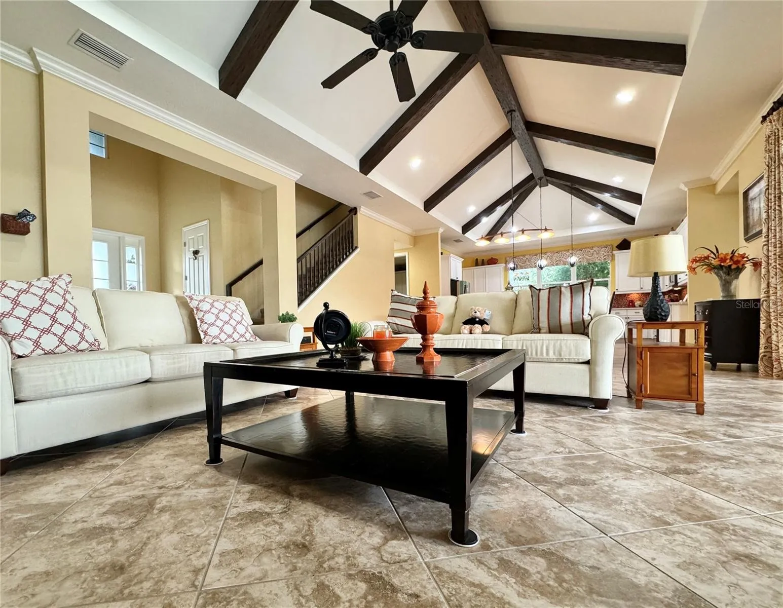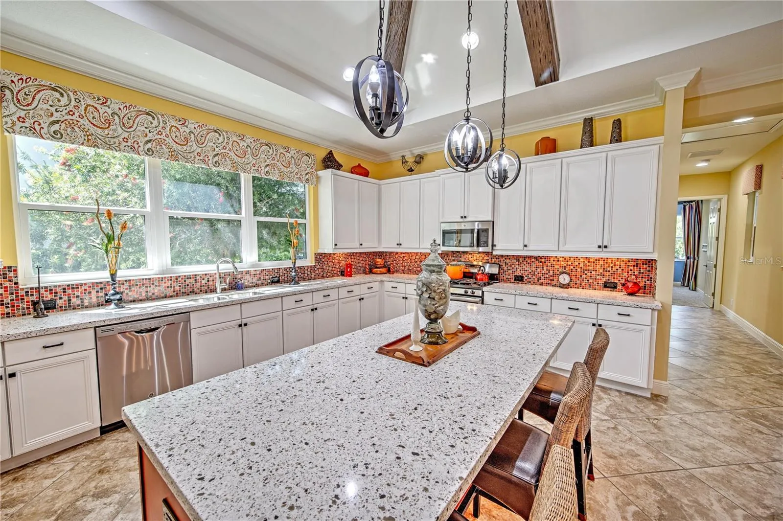 Indoors natural daylight accent the vaulted & beamed great room, dining room and kitchen ceiling. The kitchen is equipped with stainless steel appliances, natural gas stove, gorgeous quartz countertops, a walk-in pantry, and a large island that encourages visiting while preparing meals.