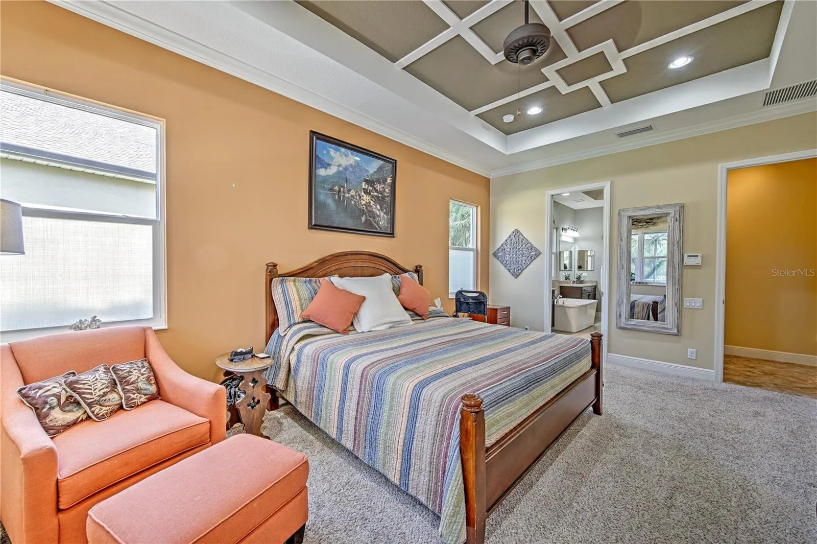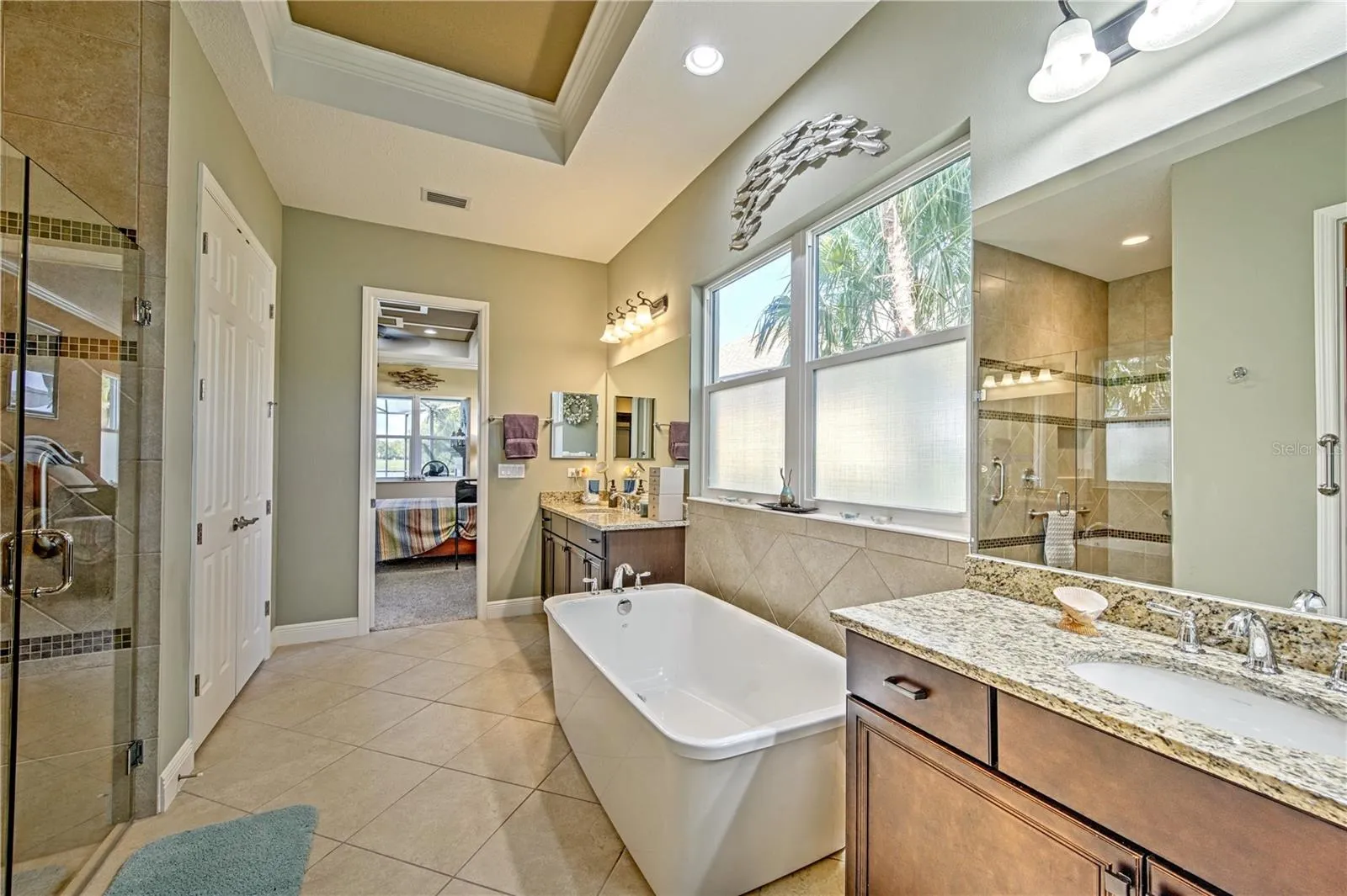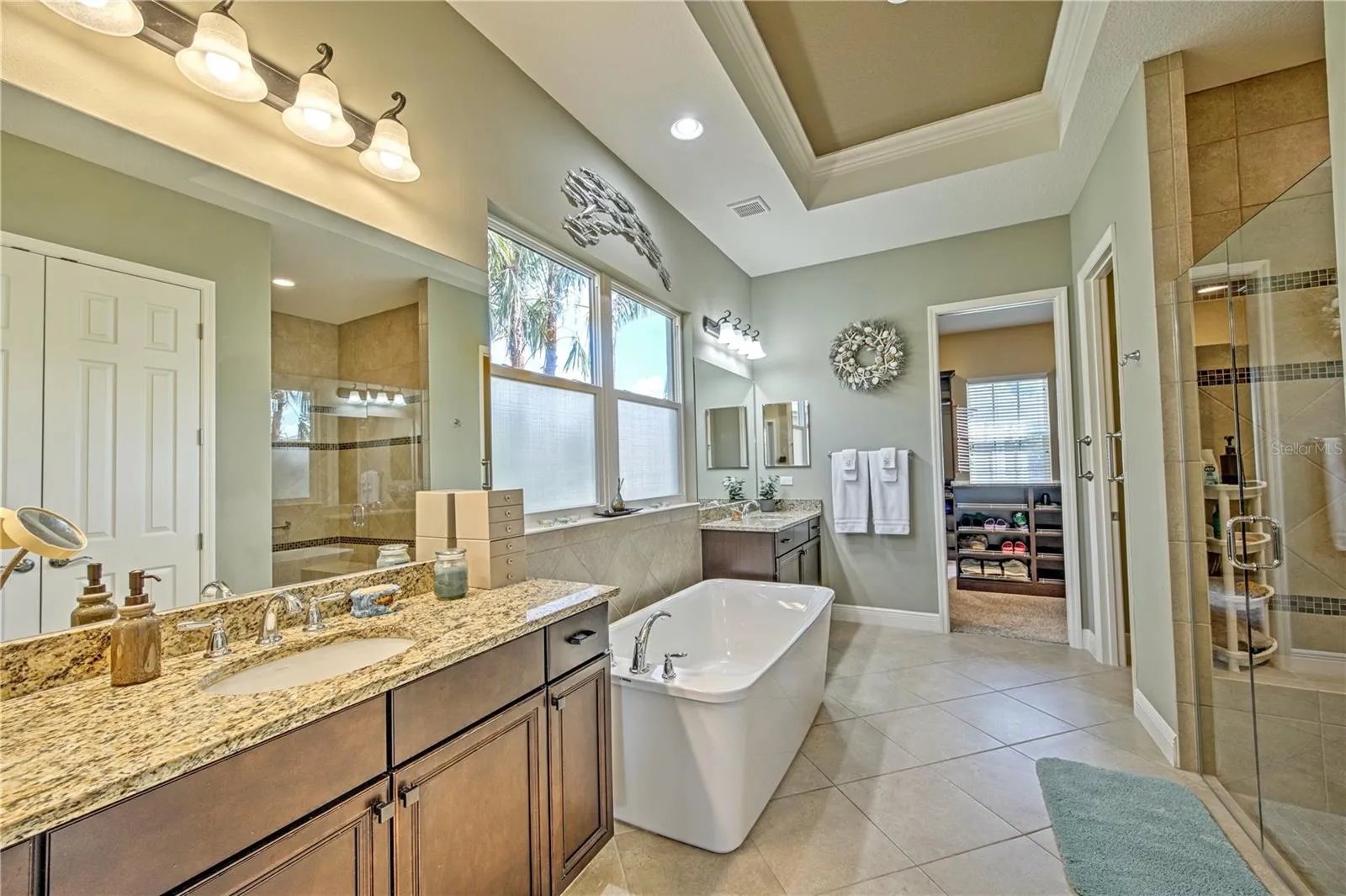 The master suite on the first floor is separated from the secondary bedrooms for privacy. The large master suite is spacious and features a private entry to the lanai and pool area. The master bath is bathed in natural light along with a high tray ceiling, a private water closet, a large walk-in shower with a long built-in bench, and dual vanity sinks flank a deep soaking tub. Feel like royalty in the master closet which is the equivalent of a dressing room with custom built-in features and a granite topped center island for additional storage.