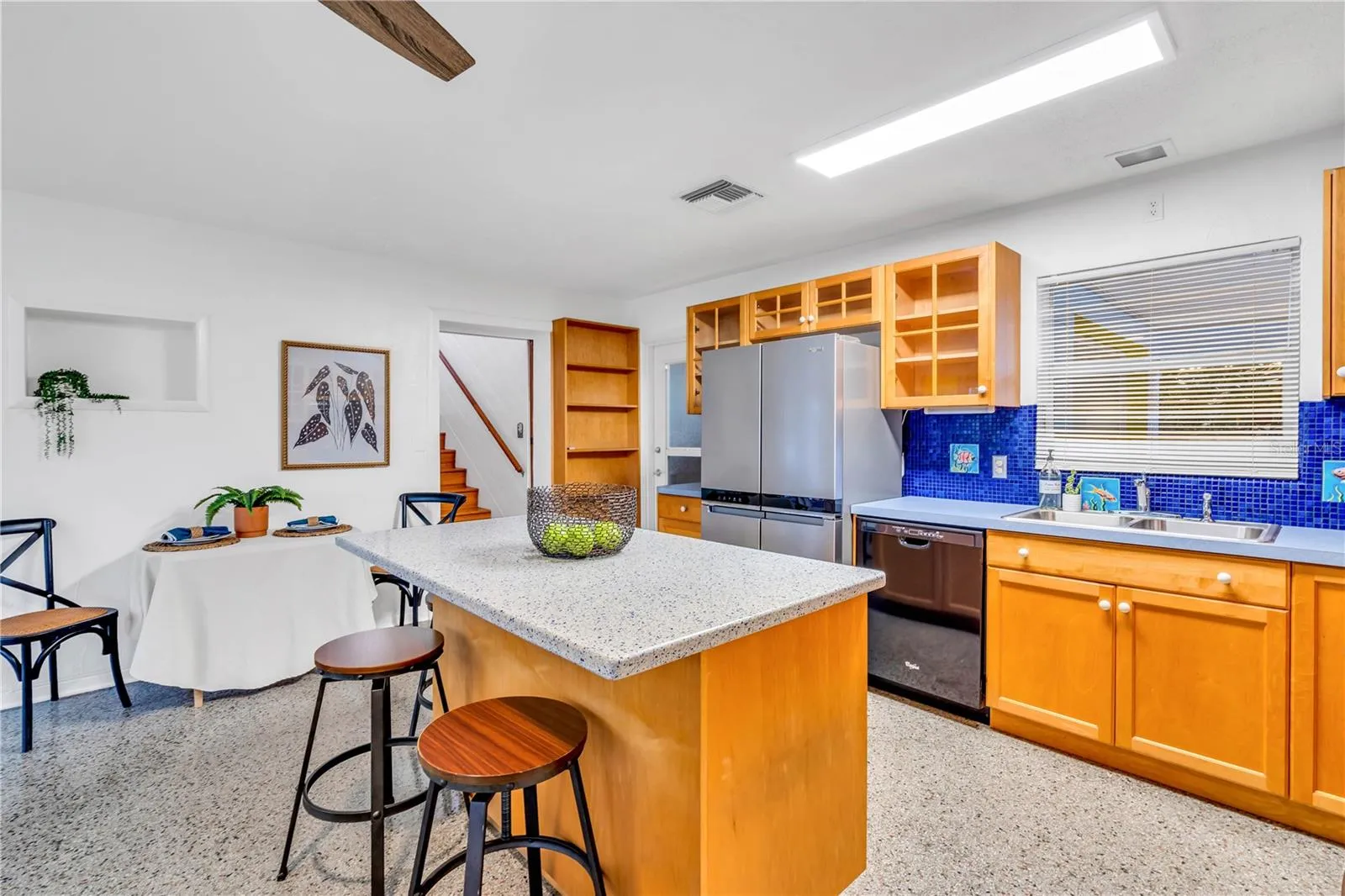 The Best of Gulfport life by the Bay! Situated directly across from Clam Bayou nature preserve and the Gulfport Marina, this 3 bedroom, 2 1/2 bath solid block home features an open floor plan, classic terrazzo flooring, and custom glass front kitchen cabinets. The AC/heat pump, water heater, waterline to the main, refrigerator, and ceiling fan are brand new. Adjoining an inviting kitchen area, the living room opens to a large, screened in porch and stunning gardens shaded by Live Oaks, native Saw Palms, Sea Grapes, and Peruvian Pear trees. View ship masts and sea birds from the airy second floor master suite which includes two walk-in closets, a double vanity sink, and private balconies. Admire the stars from the third, rooftop deck. The home has plenty of parking with an attached 1 1/2 car garage and circular driveway. The home is freshly painted, move-in ready, ideally located, and offers many possibilities for relaxing seaside living. Adjacent Vacant Lot is separate listing on MLS, under Vacant Land. Owner is open to offers that include both properties in one transaction. Make an offer!