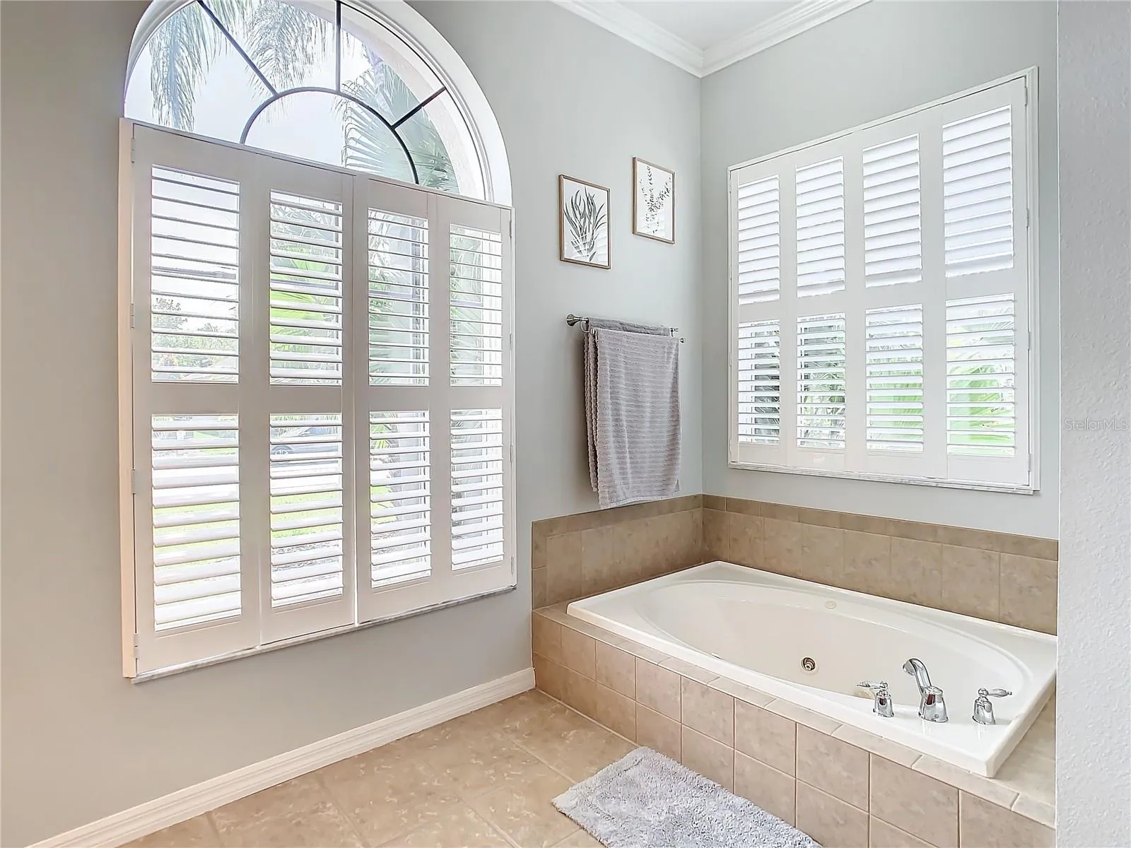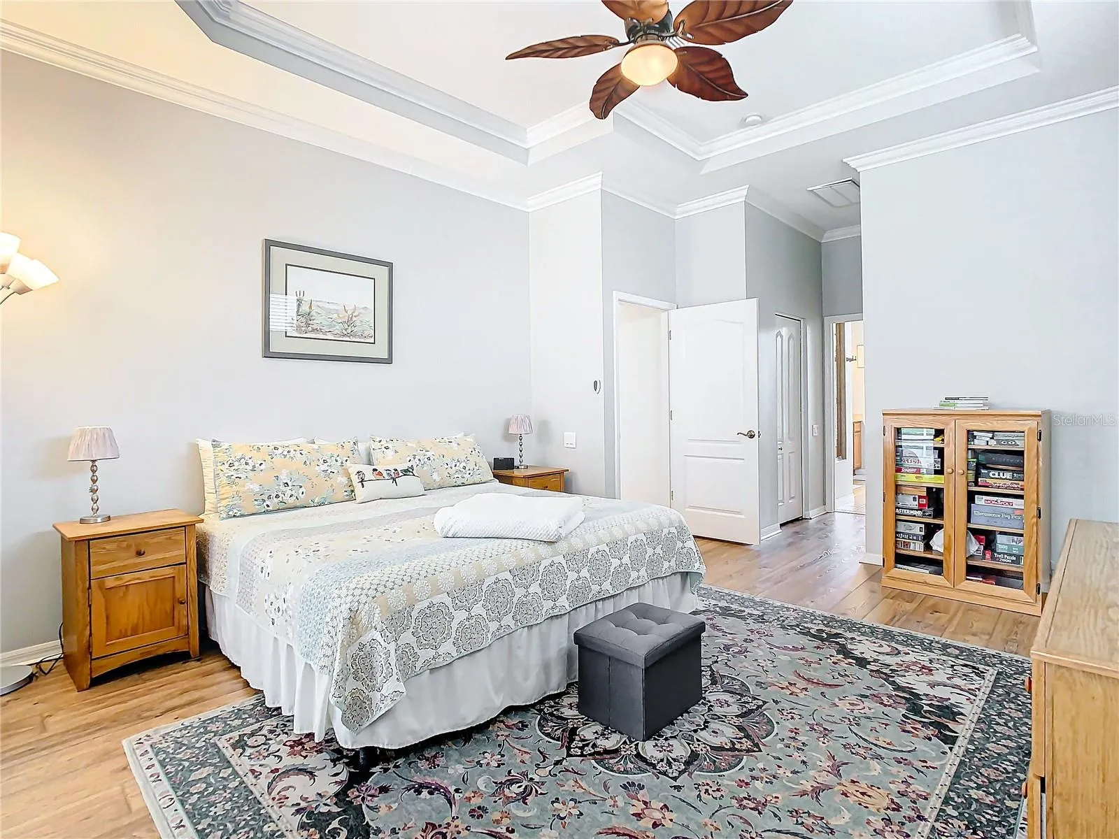 - Ceiling Fans(s), Crown Molding, Open Floorplan, Thermostat, Walk-In Closet(s), Living Room/Dining Room Combo, Eat-in Kitchen, Kitchen/Family Room Combo, Primary Bedroom Main Floor, Split Bedroom, Window Treatments, High Ceilings, Solid Wood Cabinets, Solid Surface Counters, Tray Ceiling(s), L Dining, Coffered Ceiling(s), Chair Rail, Attic Fan