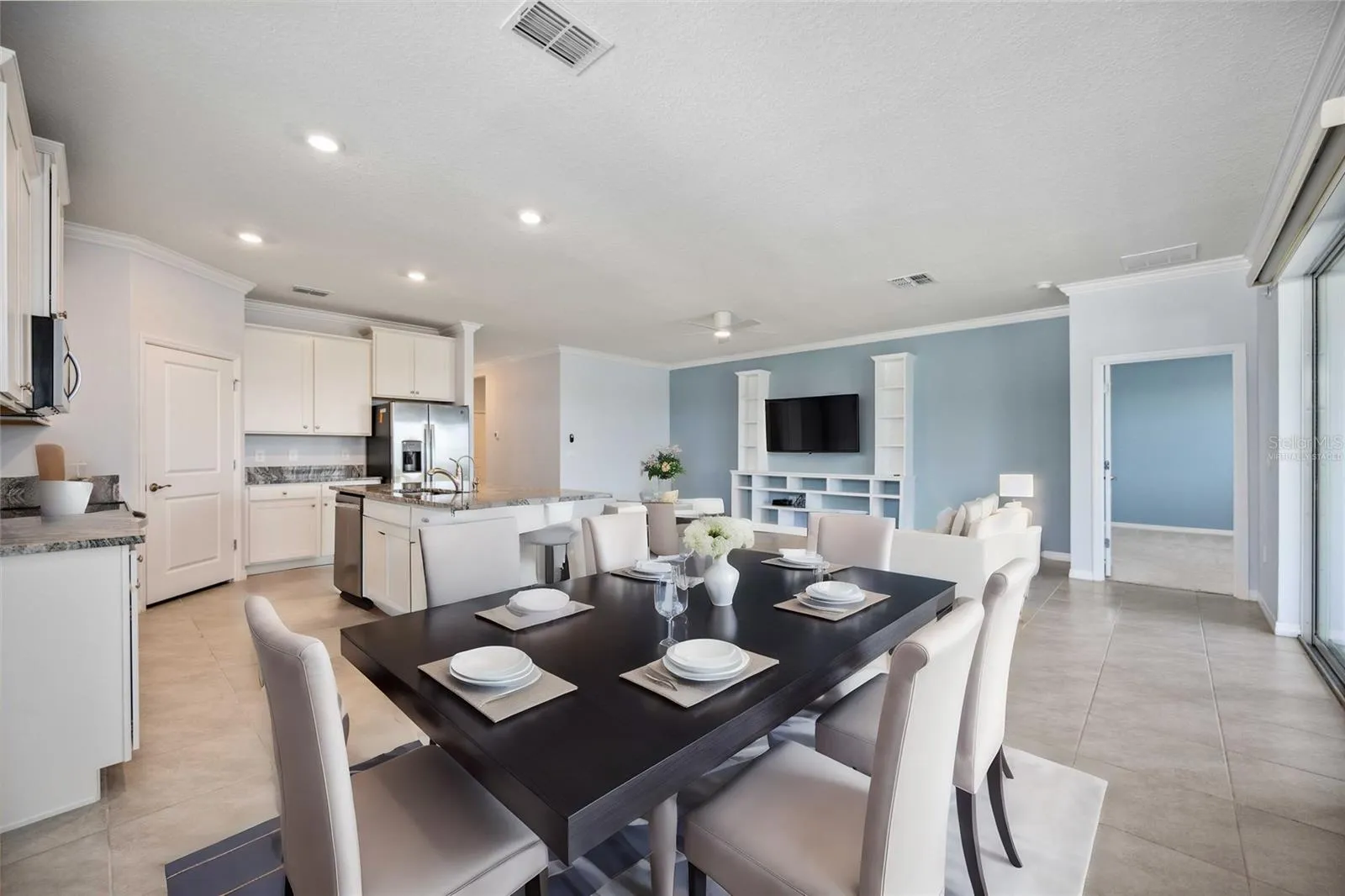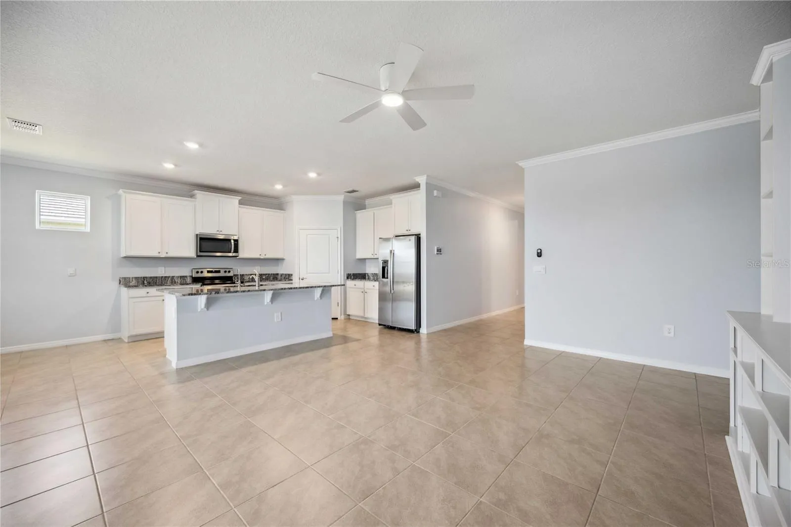 - Ceiling Fans(s), Crown Molding, Open Floorplan, Walk-In Closet(s), Kitchen/Family Room Combo, Split Bedroom, Window Treatments, High Ceilings, Stone Counters, Built-in Features