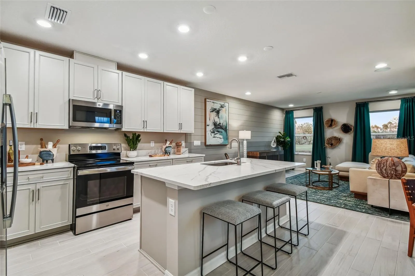 Enter through beautiful landscaping right into the heart of the home. A half bath powder room is set to the side, while the main view is comprised of the kitchen, dining, and great room area. A gourmet chef’s kitchen with beautiful cabinets and countertops, and elegant finishes surround a center island with a double sink.