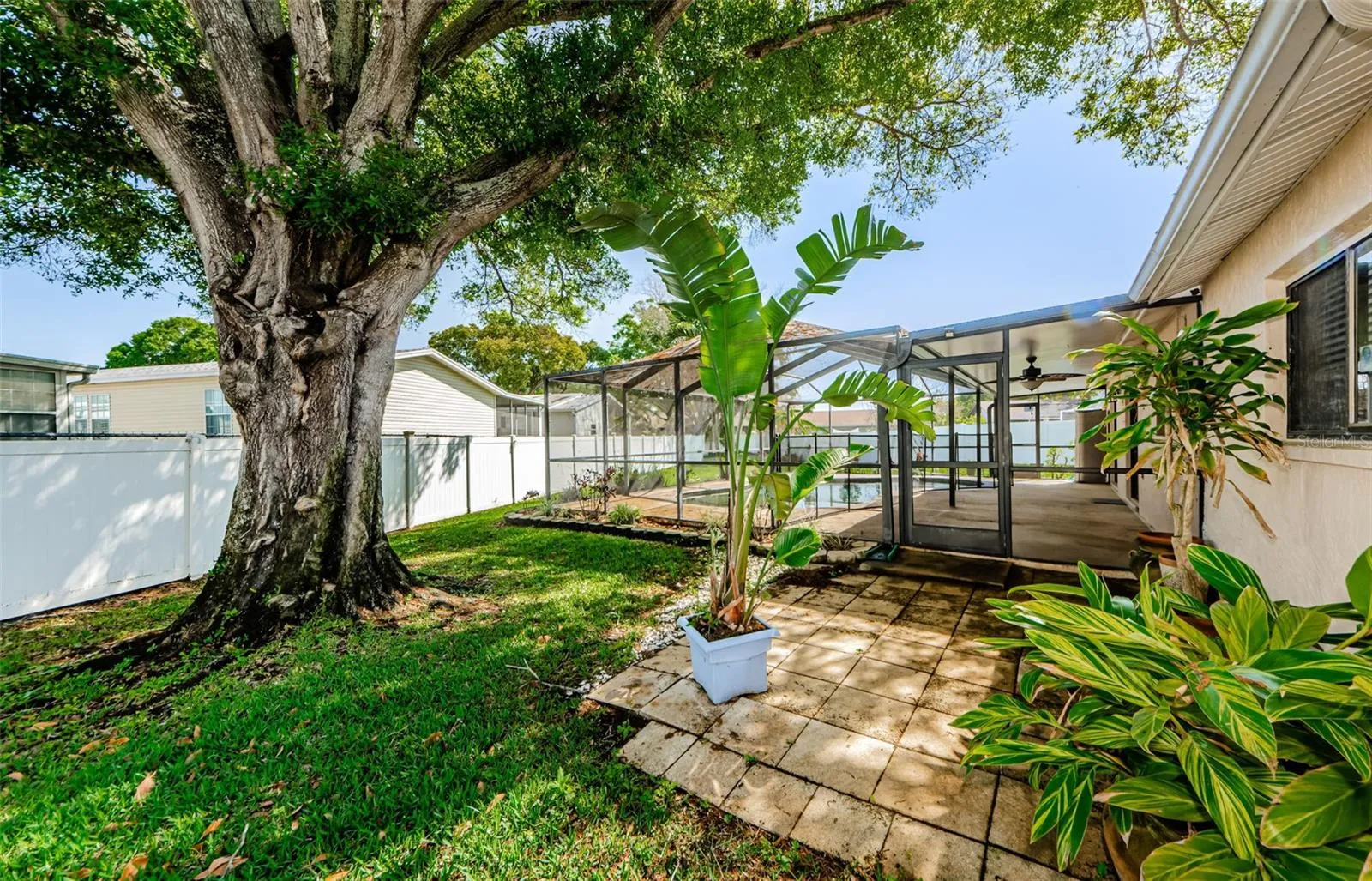 Sliding glass doors lead out to your private oasis – a screened-in pool surrounded by mature landscaping, creating the ultimate retreat for relaxation and outdoor enjoyment. The expansive backyard provides plenty of space for recreation and leisure activities, making it ideal for both hosting gatherings and enjoying peaceful moments.