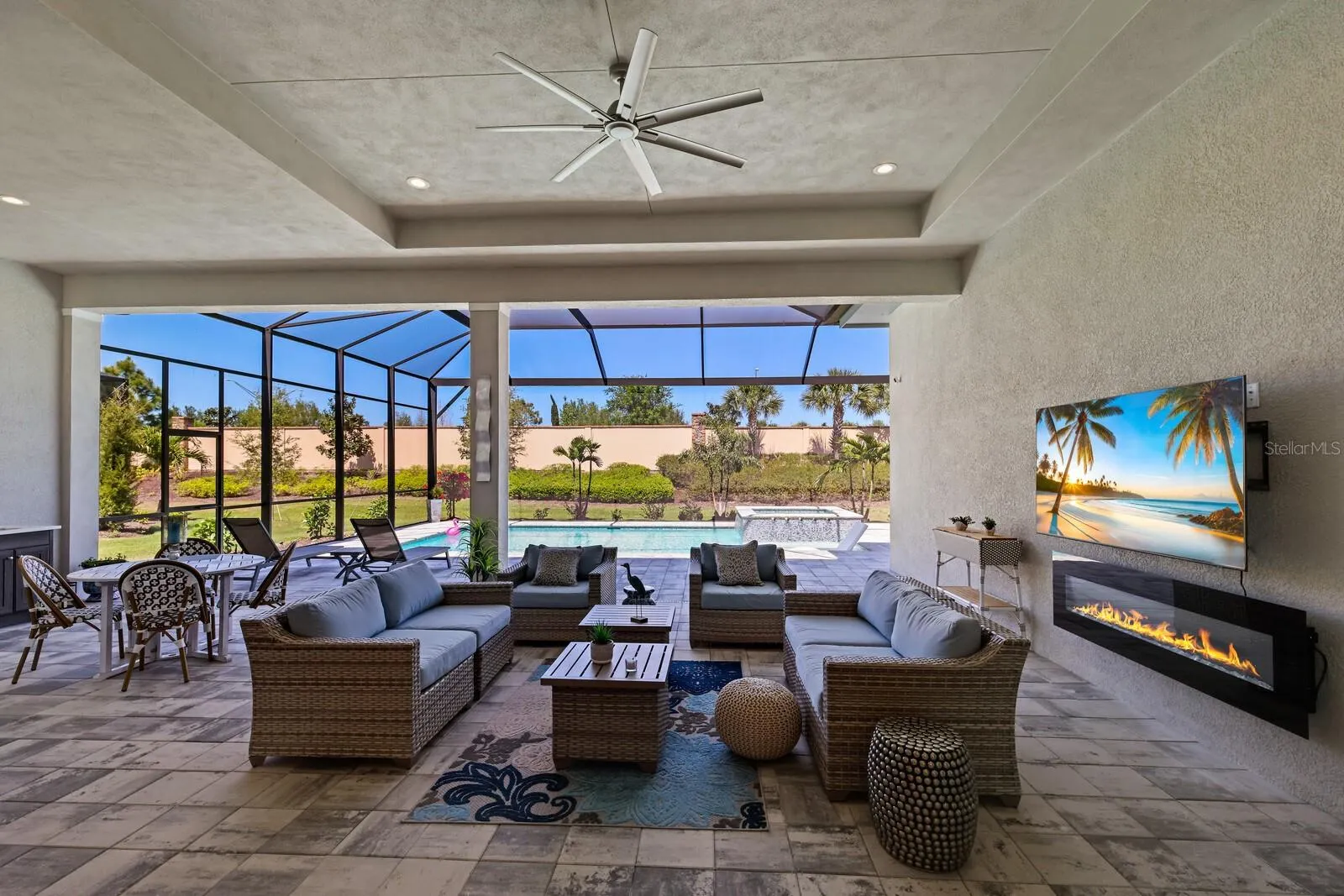 Situated in Lakewood Ranch’s most desirable neighborhood this stunning LAKE CLUB home embodies the true meaning of luxury living. Spectacular TURNKEY FURNISHED, 3702 sq ft 5 bedroom home is practically brand new and only occupied for 8 weeks. Nestled among beautiful lush landscaping on almost one third of an acre, this home offers complete privacy and tranquil preserve views where you can delight in seeing beautiful sandhill cranes. Greeted by a welcoming foyer and captivating views of the outdoor living space, this professionally designed masterpiece is well appointed with today’s finest features and a tasteful neutral palette. The Mayfield Grande III floor plan is well crafted, allowing for the ultimate entertaining experience on the first floor and a private retreat for family and guests on the second. The open concept kitchen is the epicenter of the home, where the chef of the family will delight in creating their culinary favorites. Gleaming stone countertops, designer backsplash, gas cooktop, stainless steel appliances, undermount single basin sink and expansive island are some of its most notable features. Thoughtfully designed with entertaining in mind, this home allows for the ultimate in indoor and outdoor living, where disappearing sliding glass doors open to the stunning paver lanai (almost 1500 sq. ft of outdoor living with almost 600 sq. ft of covered lanai) allowing you and your guests to experience swimming and lounging in the salt water pool, unwinding in the heated spa and enjoying the tranquil views through the clearview screen. Whip up an enticing feast with the smoker and rotisserie features and sit back and relax while watching your favorite sports teams. After a full day, retire to the primary suite, a sanctuary tucked away with its own private entrance to the lanai and soaring tray ceilings. The spa inspired en-suite has dual vanities, a seamless glass enclosed shower, standing soaking tub and separate water closet. Guests and family enjoy 4 additional bedrooms, 3 on the main floor with their own en-suite for added privacy and one located on the second floor designed with a private living area and full bath. This flex space is perfect for family visits, your favorite guests, the upstairs retreat has endless possibilities. Look out the second story window and you can see the large lake. Sparing no expense this home also features motorized interior shades throughout offering instant bright or dim lighting with the touch of a button, impact glass doors and windows, engineered wood flooring, designer tile, and outdoor landscape lighting that illuminates the home for evening ambiance. The gated community of Lake Club is one of the most prestigious communities on the West Coast of Florida offering a grand clubhouse for dining, resort style pool, tennis, pickleball, fitness center, dog park and a wide variety of lifestyle activities. A true masterpiece of luxury and refinement, this home is move-in ready, and waiting for you to enjoy the unparalleled lifestyle of Lake Club.