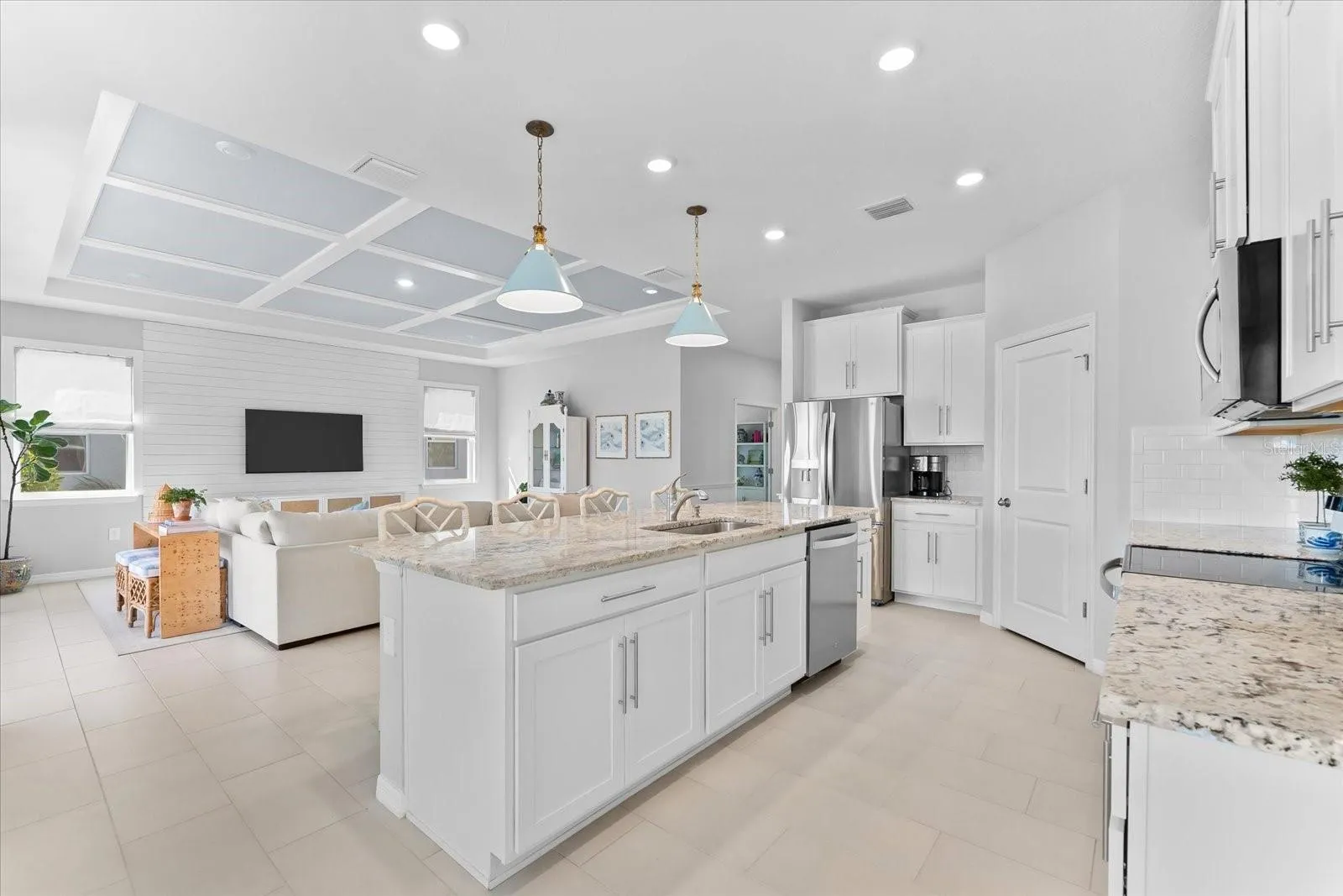 - Ceiling Fans(s), Open Floorplan, Thermostat, Walk-In Closet(s), Living Room/Dining Room Combo, Eat-in Kitchen, Primary Bedroom Main Floor, Split Bedroom, Window Treatments, Stone Counters, Tray Ceiling(s), Built-in Features, Accessibility Features, Coffered Ceiling(s)