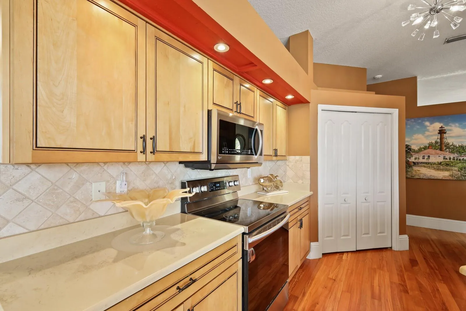 The heart of the home, a gourmet kitchen adorned with quartz countertops, maple cabinets, and stainless steel appliances, beckons both culinary enthusiasts and entertainers alike. Its open layout seamlessly integrates with the expansive living area, inviting you to unwind while soaking in the tranquil vistas of water and greenery beyond.