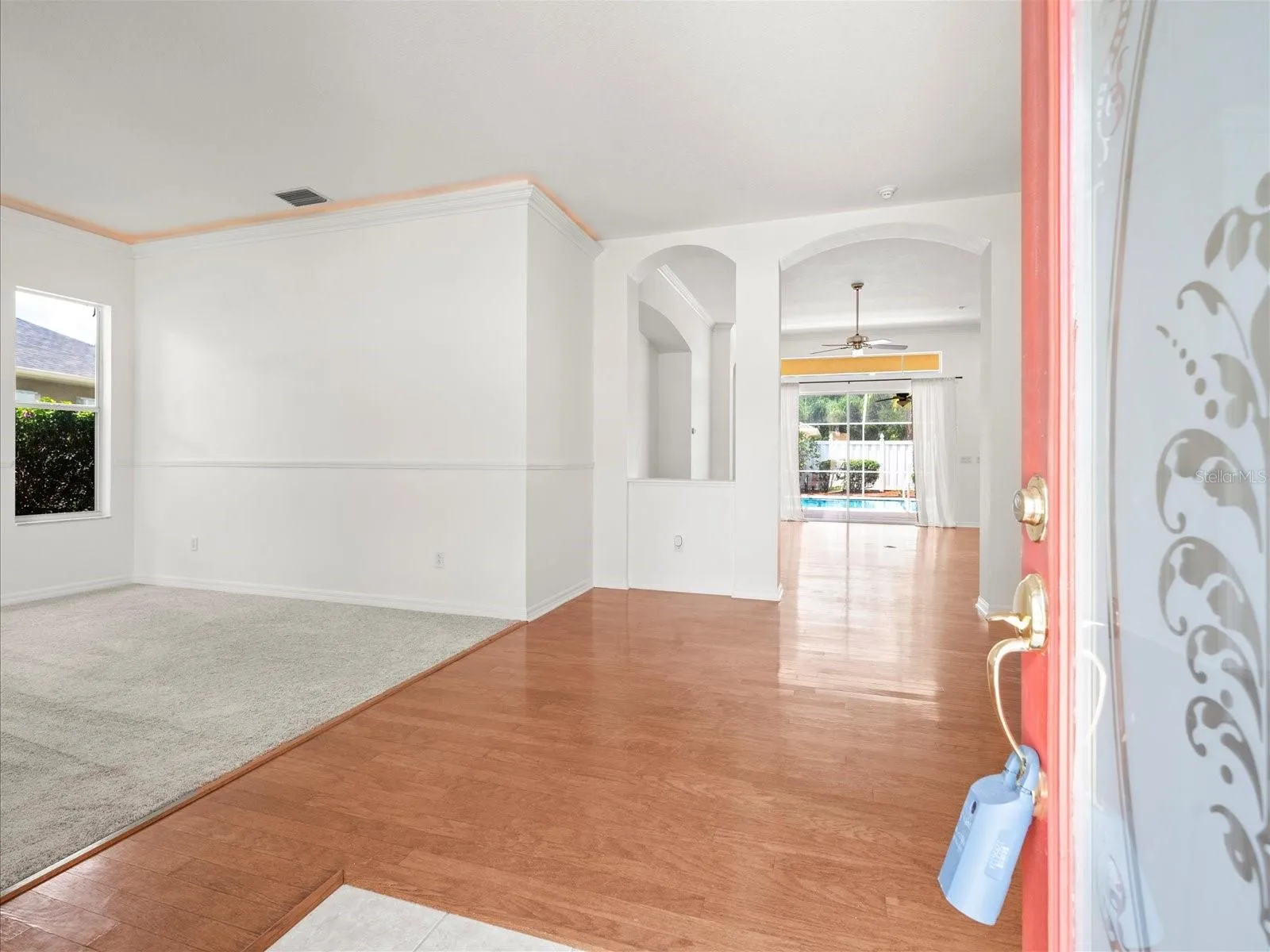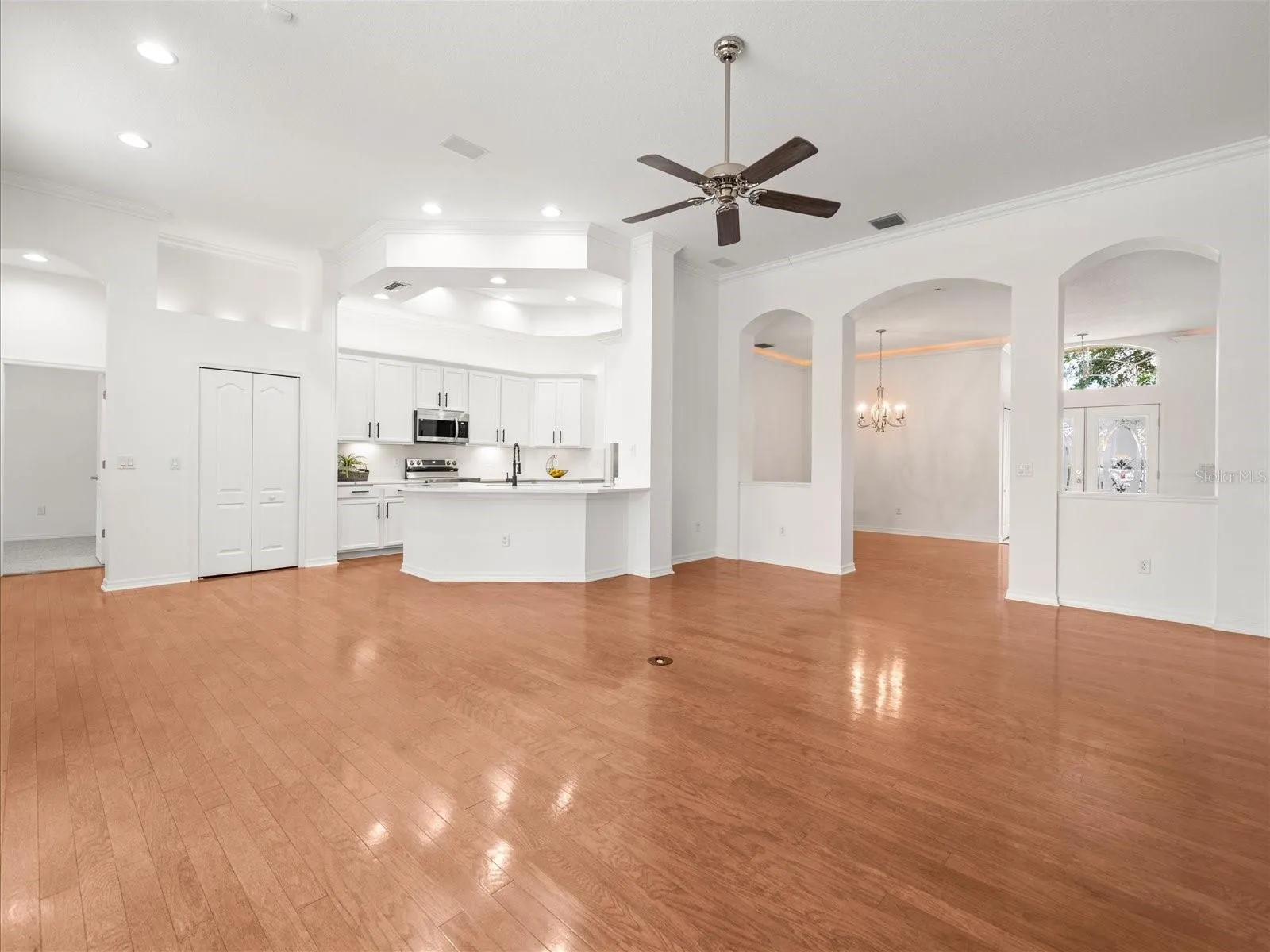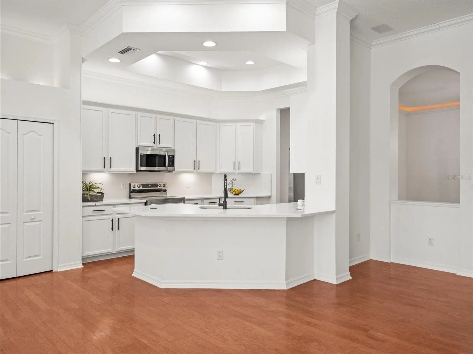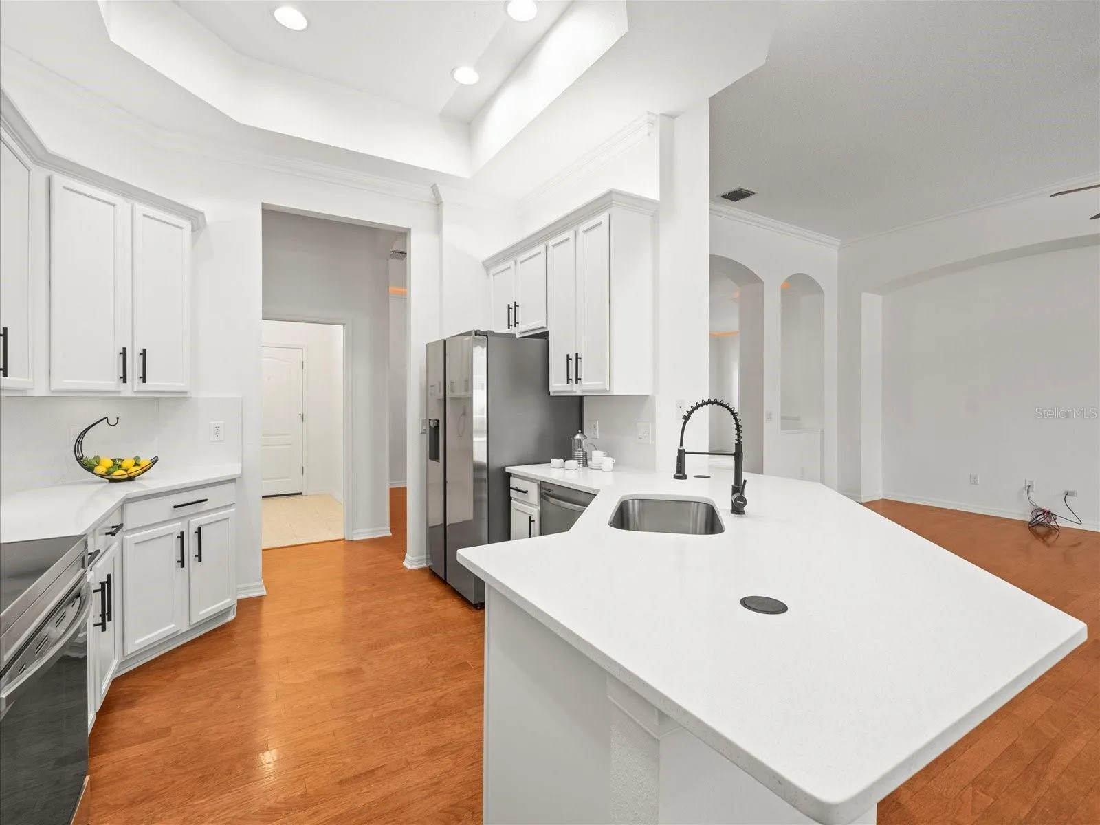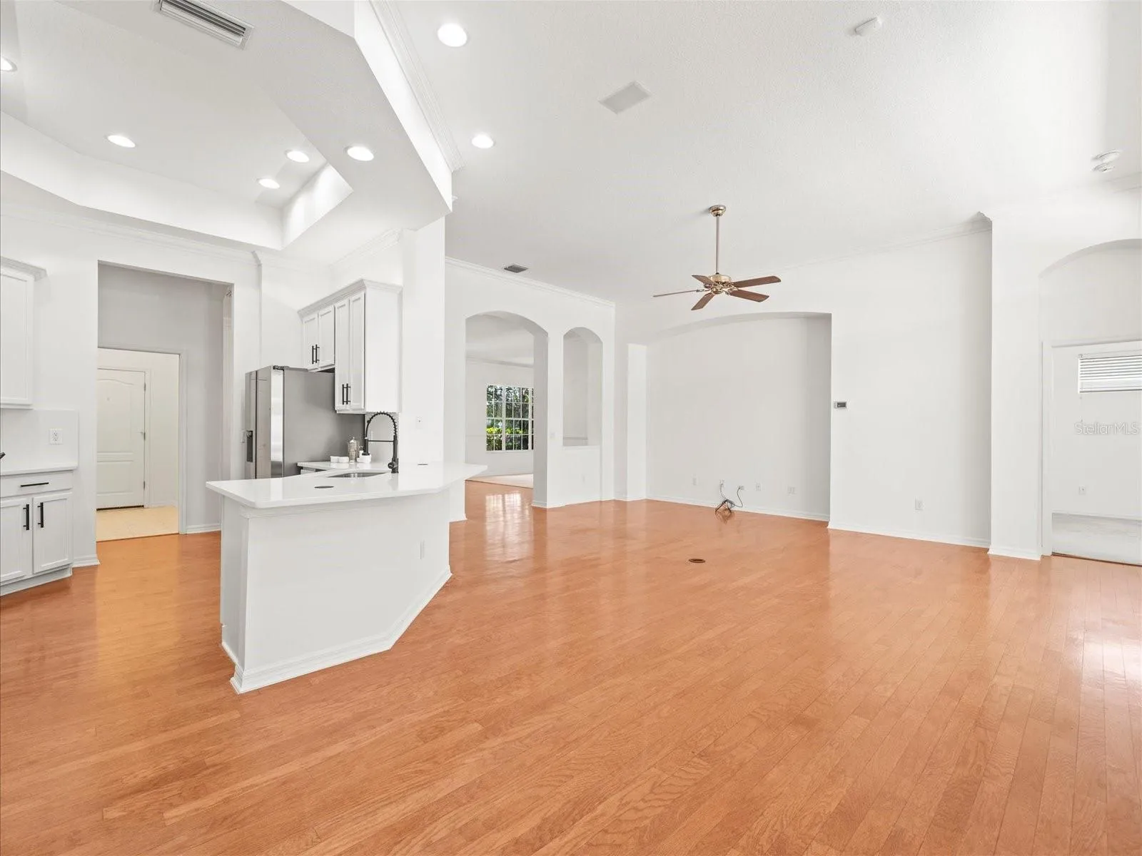 This 2,377 sq. ft. property features a LIGHT AND BRIGHT open floor plan with neutral decor and volume ceilings with transom windows! Upon arriving at the Property, you will notice a home that has been impeccably maintained, starting with a NEW ROOF (2022) and mature, lush landscape with up lighting (GORGEOUS AT NIGHT). As you enter the home, you will notice an abundance of natural light and updates such as a NEW HVAC (2019), NEW HOT WATER HEATER (2024), NEW INTERIOR PAINT (2024), NEW KITCHEN QUARTZ COUNTERTOPS AND STAINLESS STEEL APPLIANCES (2024), AND PROFESSIONALLY PAINTED KITCHEN CABINETS (2024). Additional features include crown molding, hardwood floors, a gorgeous kitchen with an abundance of cabinets and closet pantry, spacious bedrooms, recessed lighting, ceiling fans, window treatments and more! And no matter where you are in the house, the spacious lanai and inviting screened pool package (resurfaced and new screening in 2019) are easily accessed.