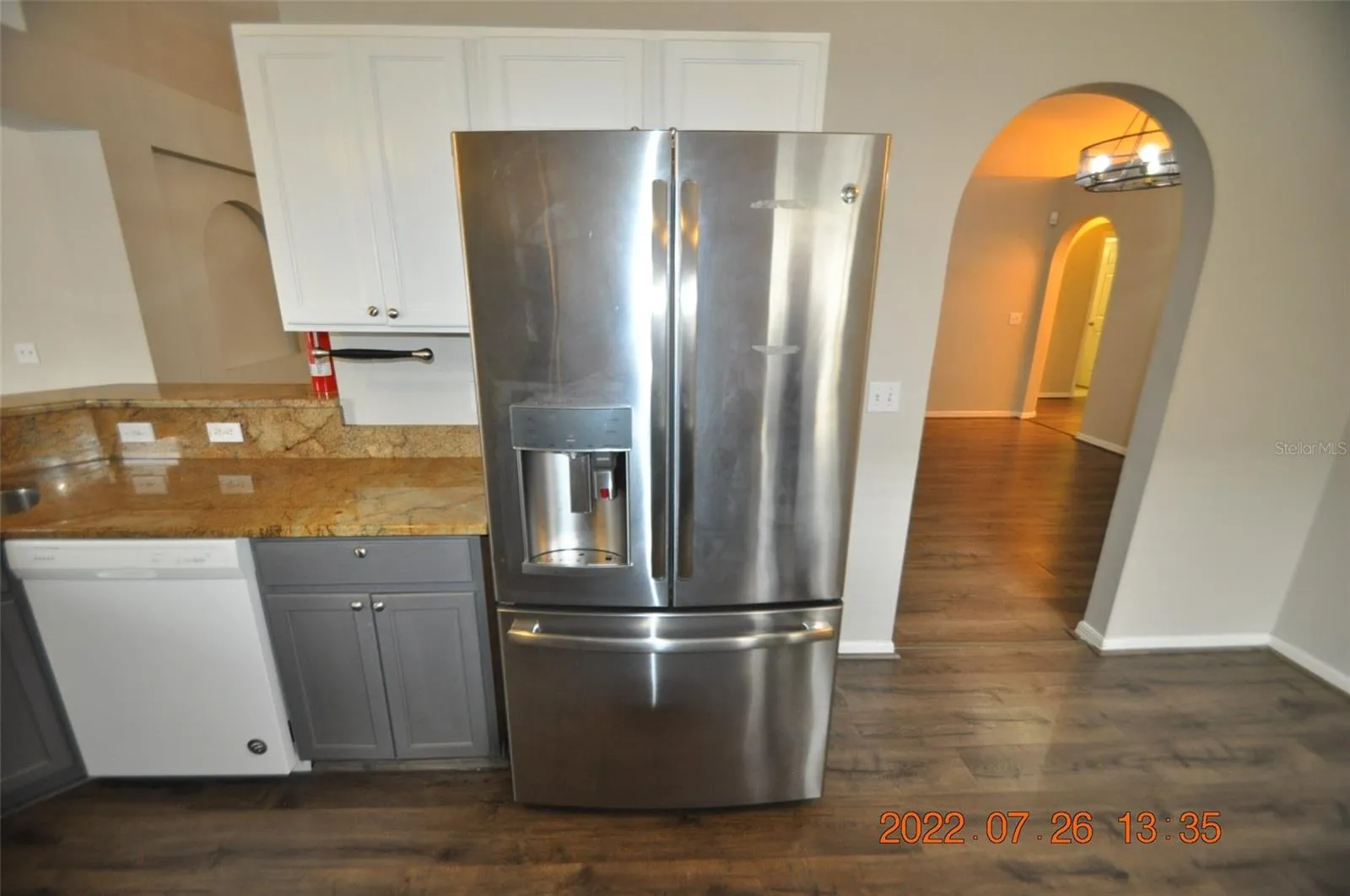 Stainless steel kitchen appliances include glass-top stove, French door refrigerator with ice and water dispenser, dishwasher, and microwave.
