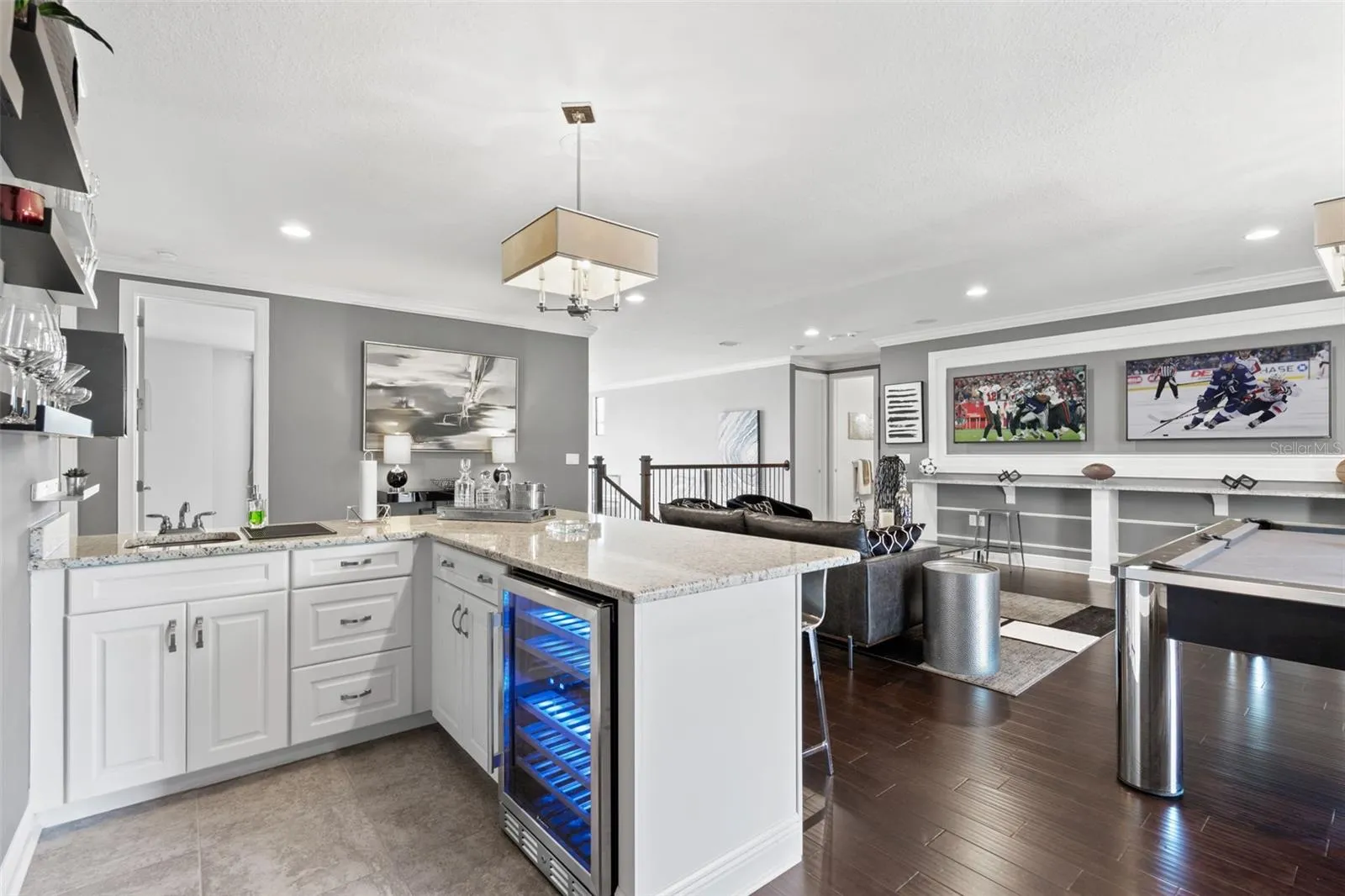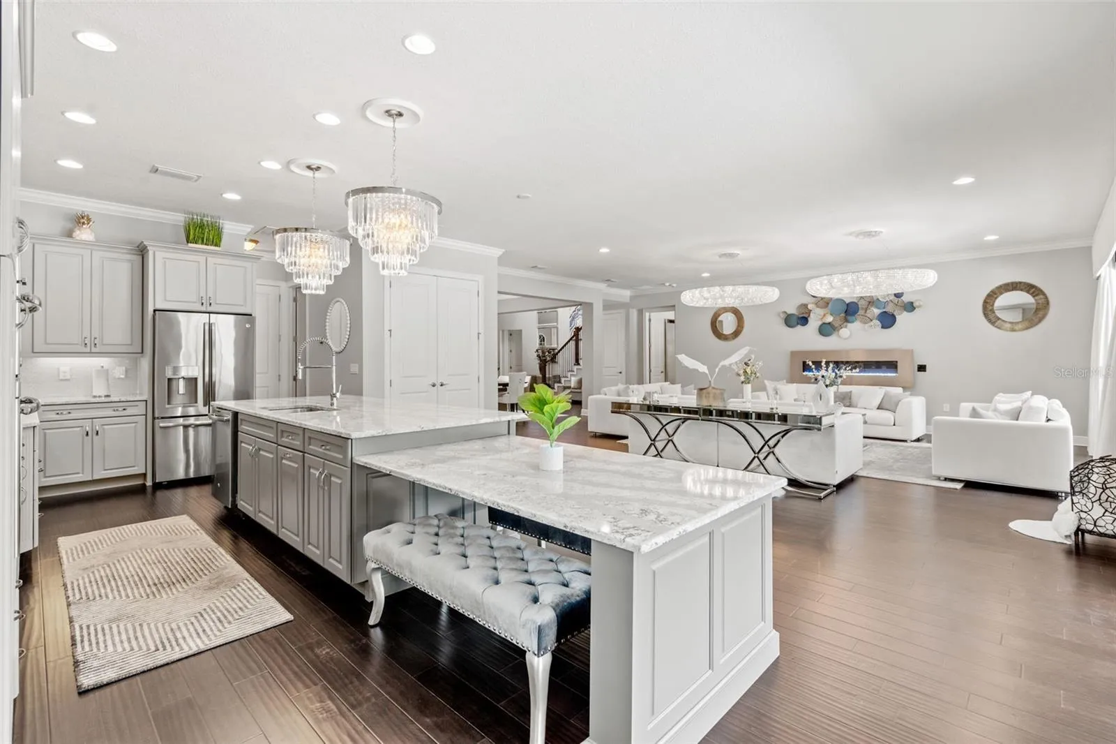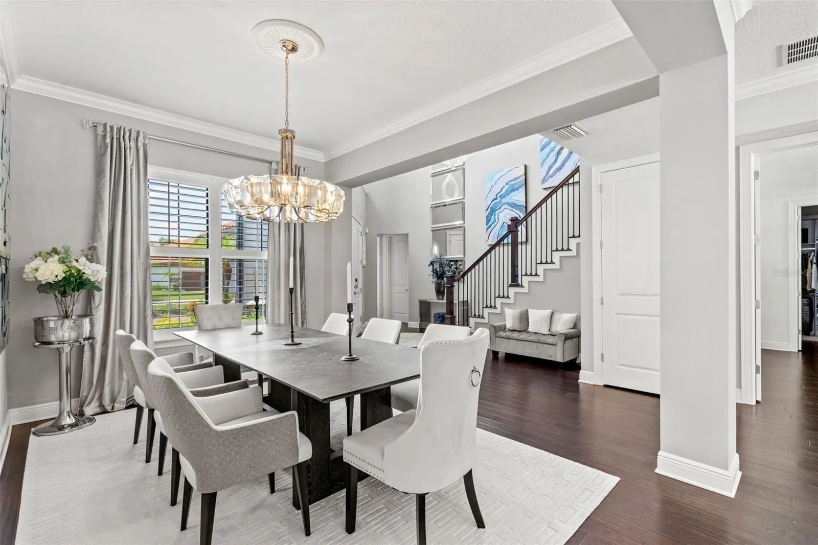 - Crown Molding, Open Floorplan, Walk-In Closet(s), Eat-in Kitchen, Kitchen/Family Room Combo, Primary Bedroom Main Floor, Window Treatments, High Ceilings, Stone Counters, Smart Home, Solid Wood Cabinets, Wet Bar, Built-in Features