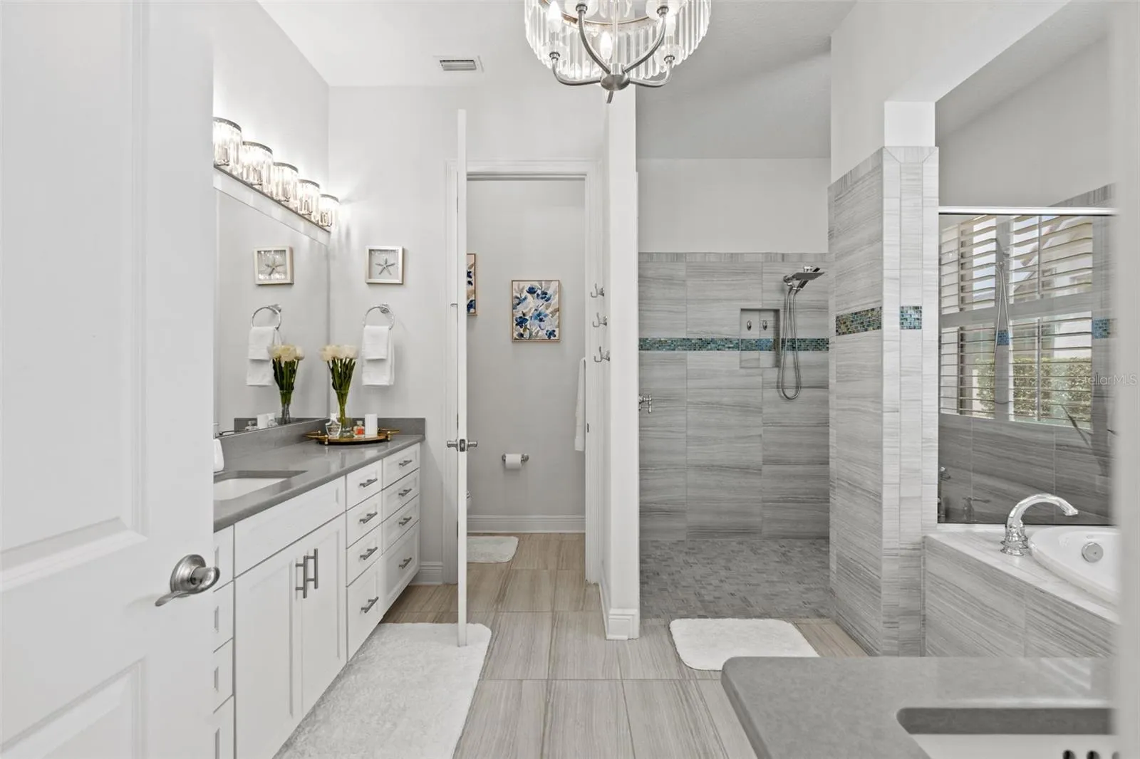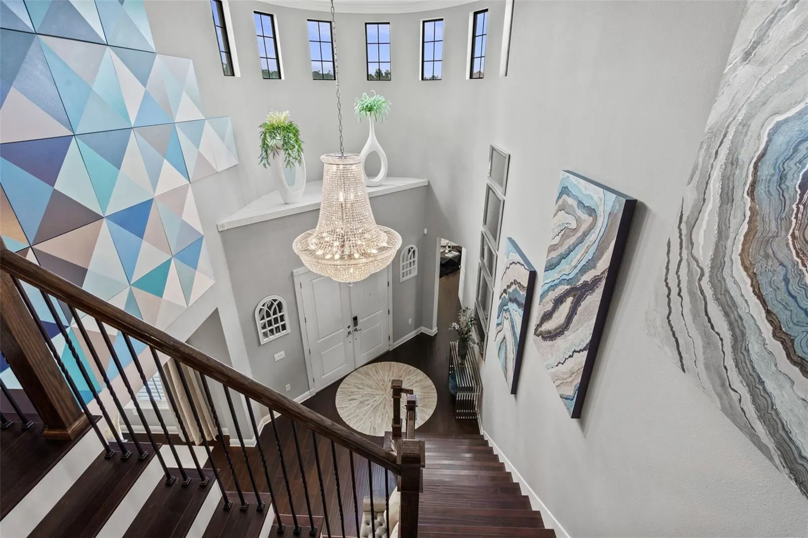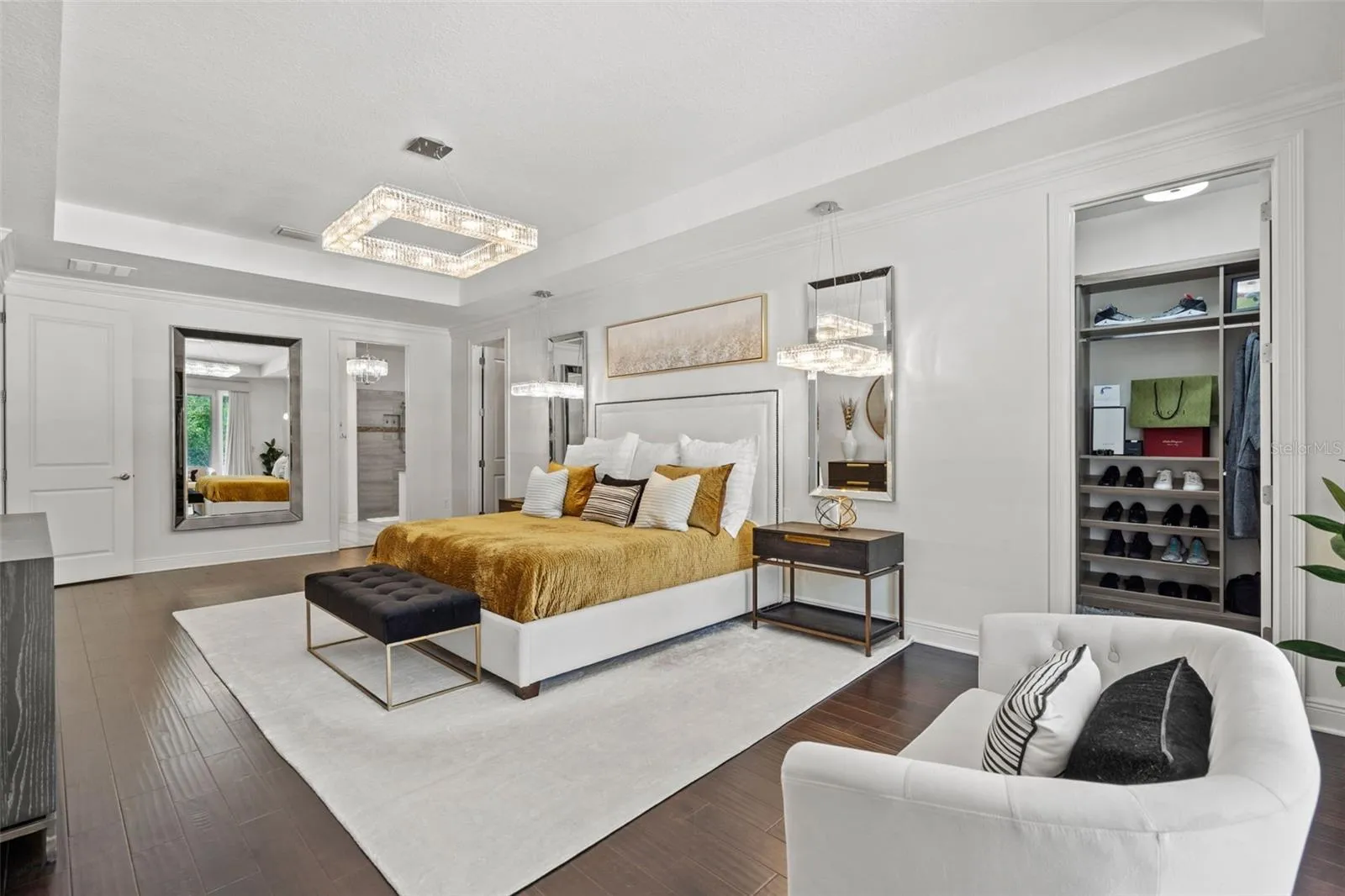 - Crown Molding, Open Floorplan, Walk-In Closet(s), Eat-in Kitchen, Kitchen/Family Room Combo, Primary Bedroom Main Floor, Window Treatments, High Ceilings, Stone Counters, Smart Home, Solid Wood Cabinets, Wet Bar, Built-in Features