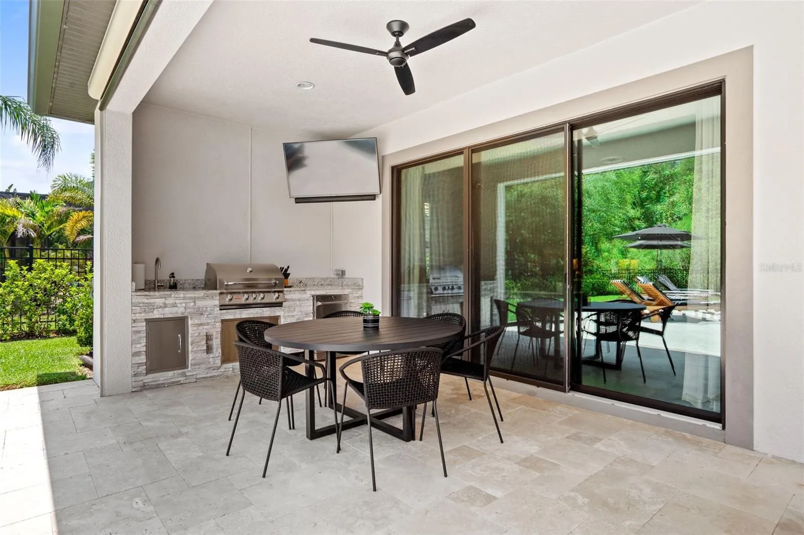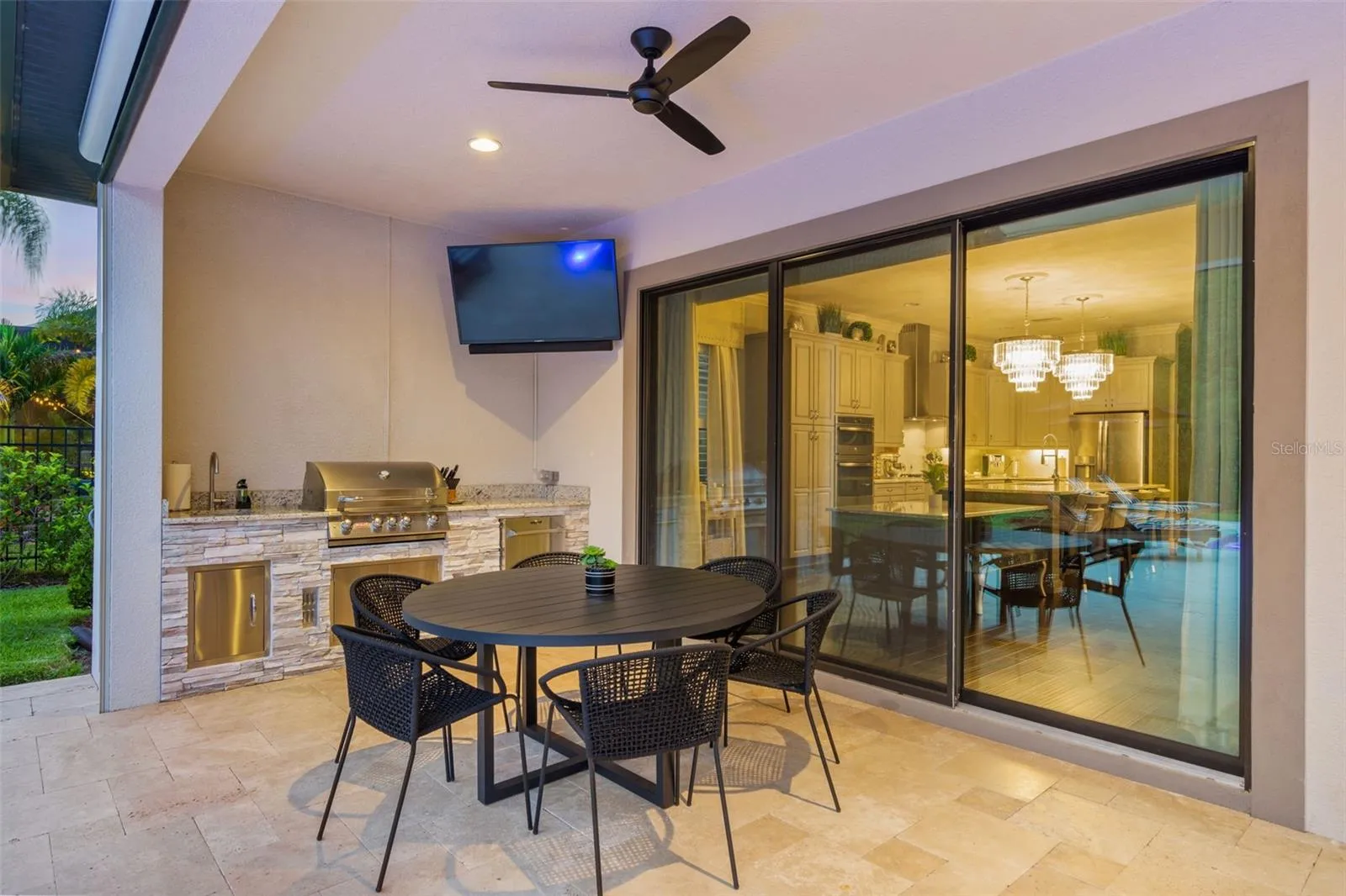 - Lighting, Balcony, Irrigation System, Rain Gutters, Sidewalk, Sliding Doors, French Doors, Outdoor Grill, Outdoor Kitchen, Sprinkler Metered, Outdoor Shower, Shade Shutter(s)