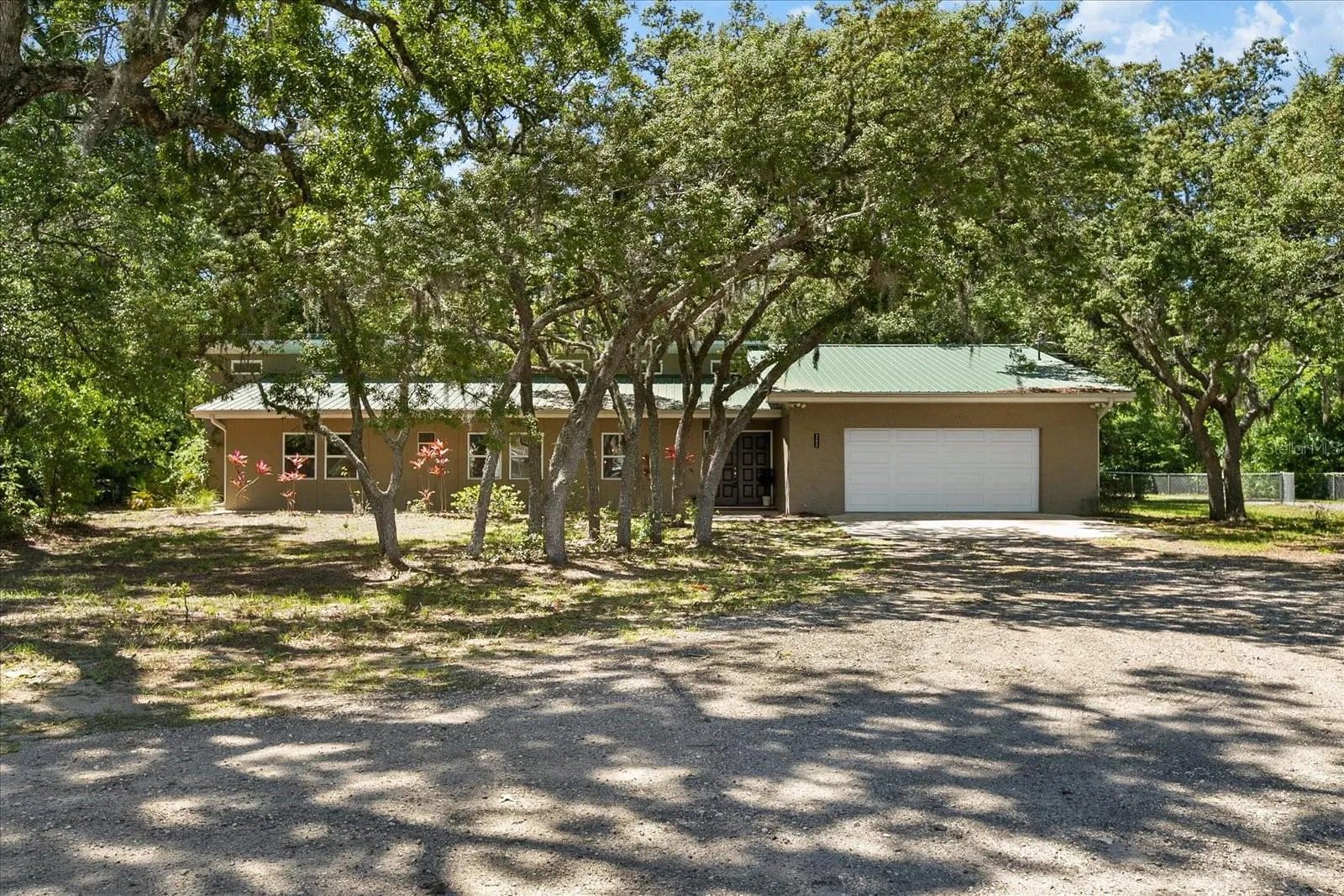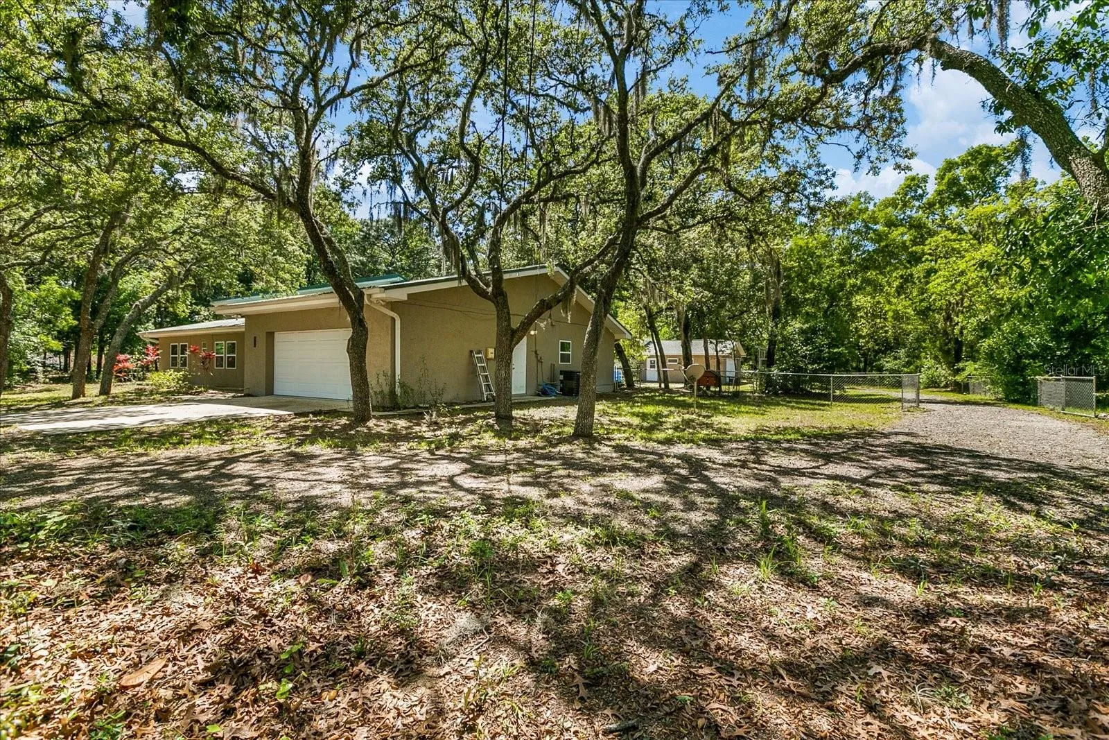 For outdoor enthusiasts, a double gate provides easy access to bring in your boat or RV, with a nearby boat ramp just minutes away. Beyond the fence, a canopy of trees envelops the property, offering shade, peace, and tranquility.