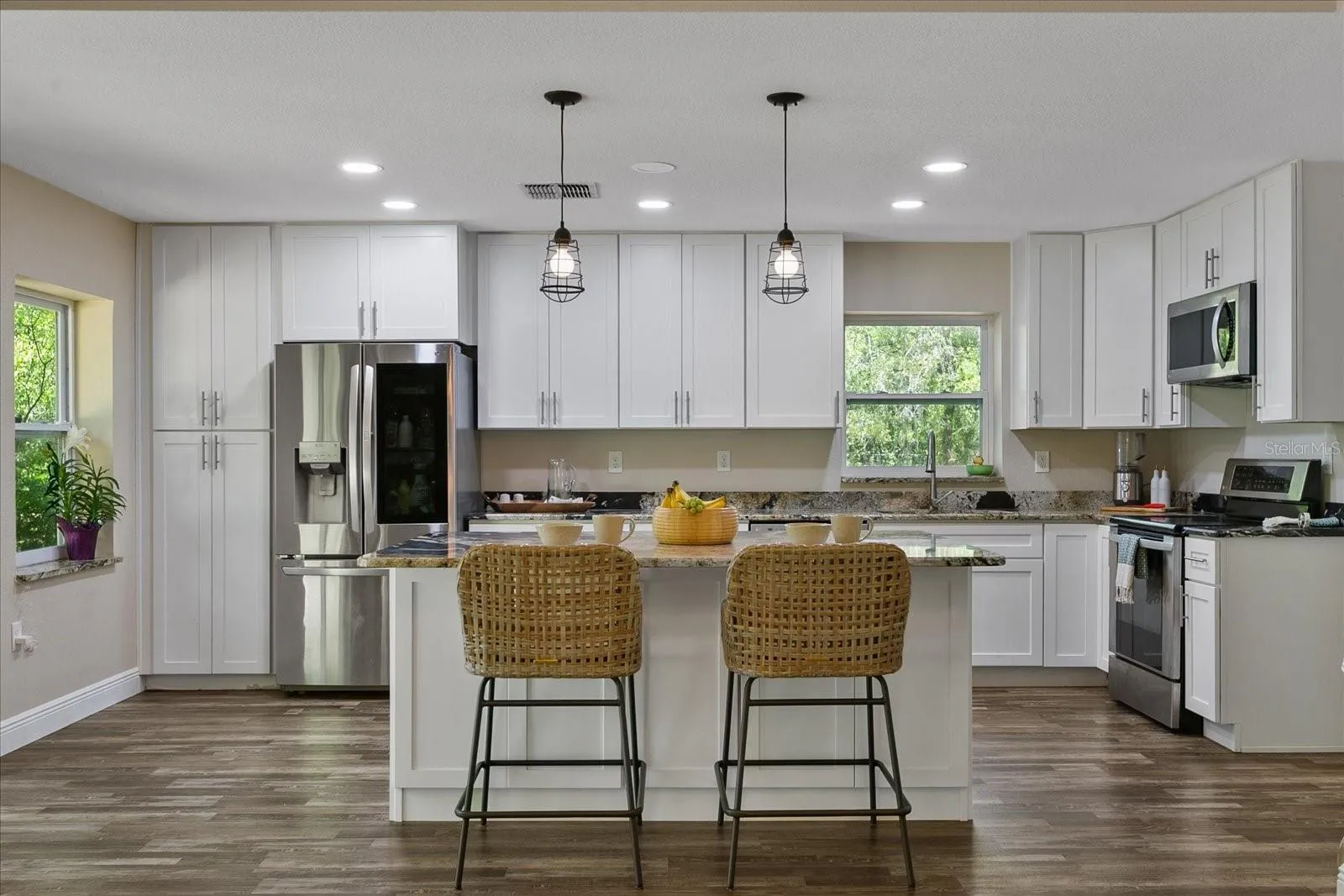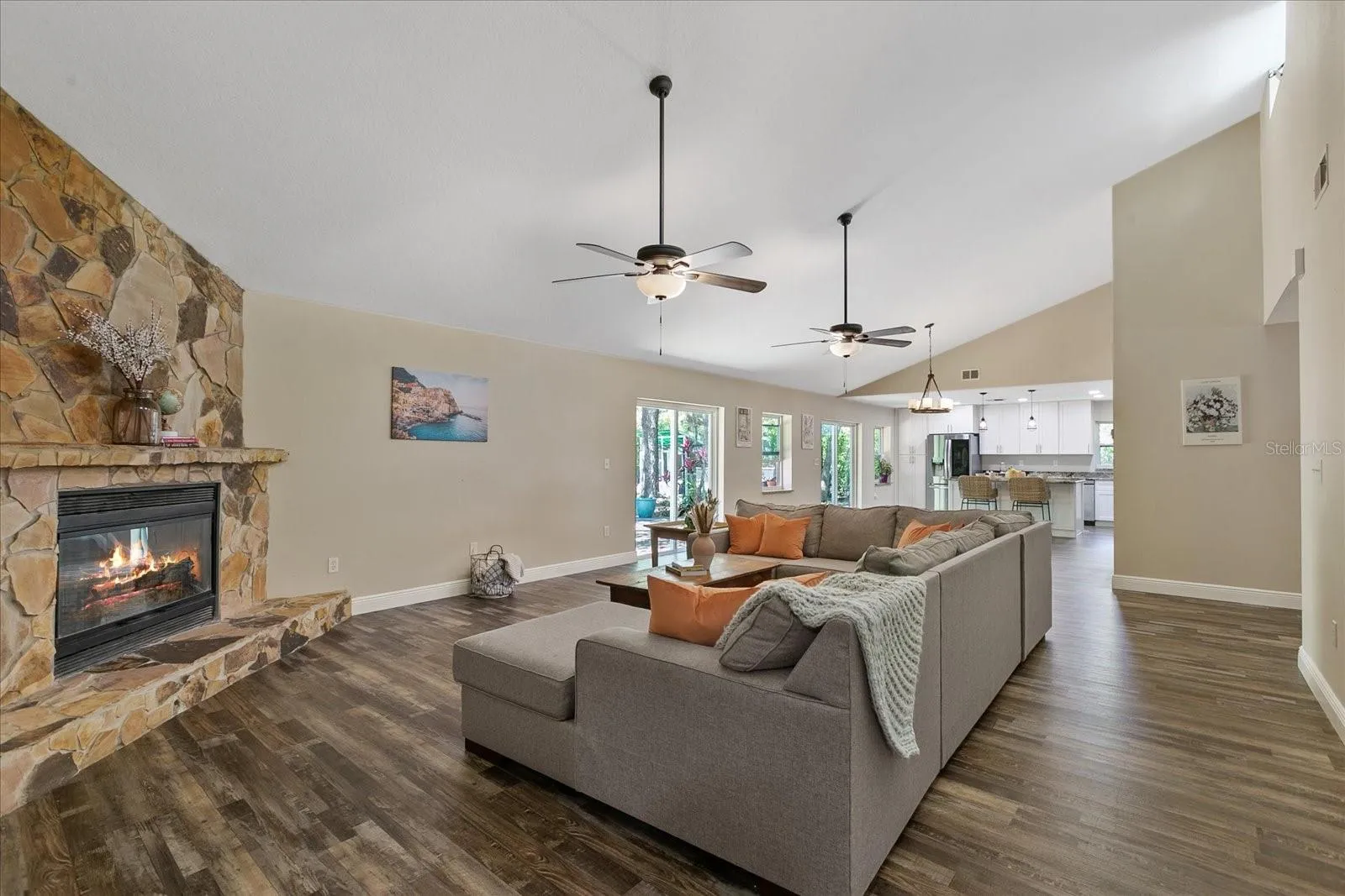 Step into the heart of the home, where a stunning white kitchen awaits, adorned with shaker cabinets and exquisite granite countertops. The expansive island boasts double-sided storage, perfect for culinary enthusiasts, complemented by stainless steel appliances. Gather around the wood-burning fireplace in the spacious living area, enhanced by soaring vaulted ceilings that create an atmosphere of grandeur.